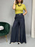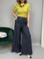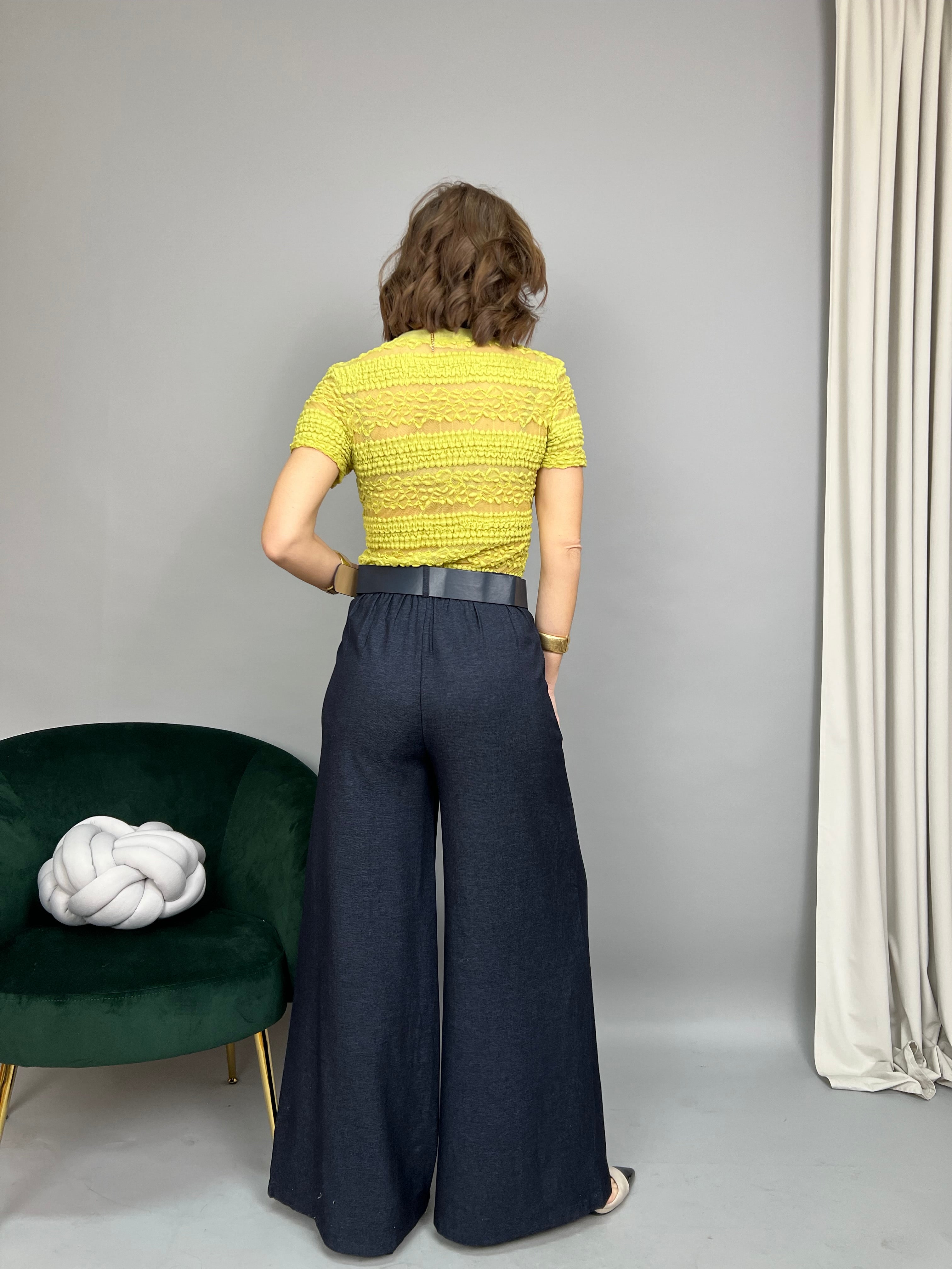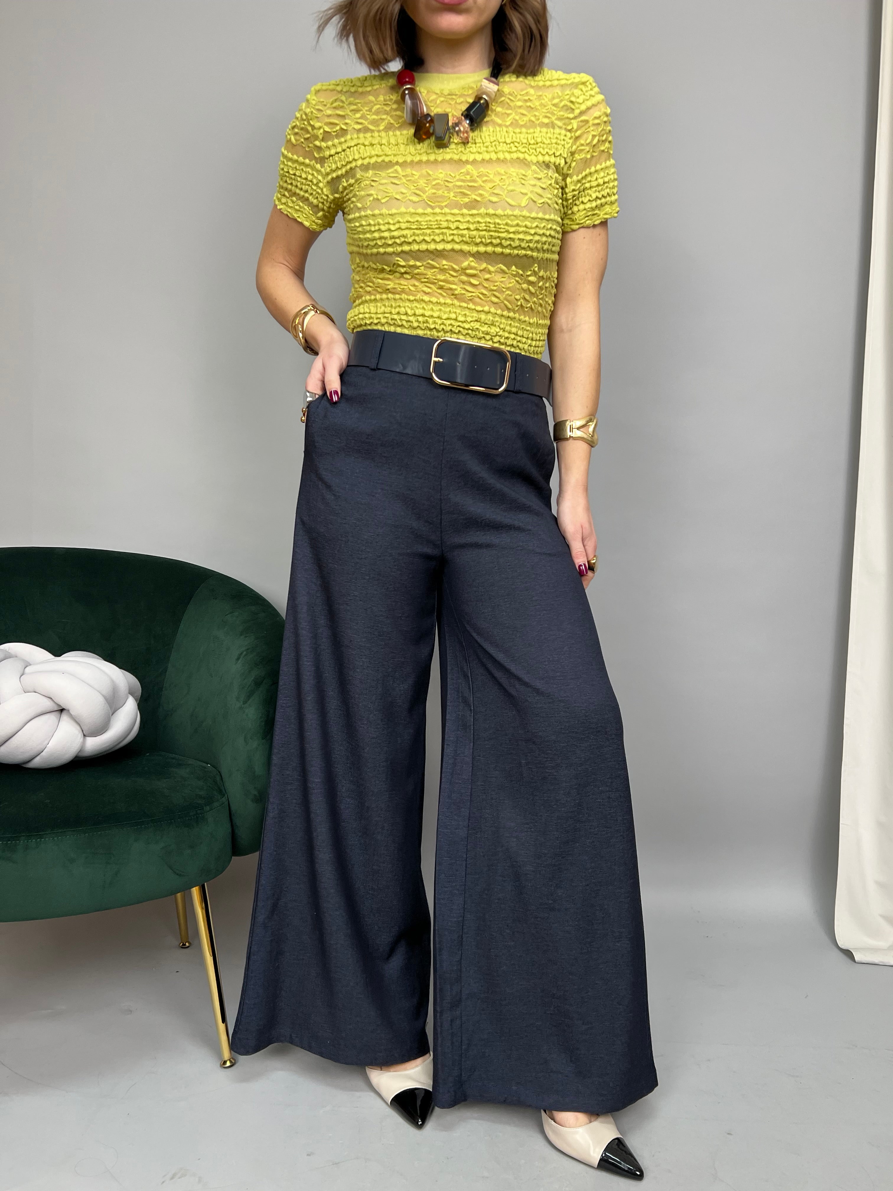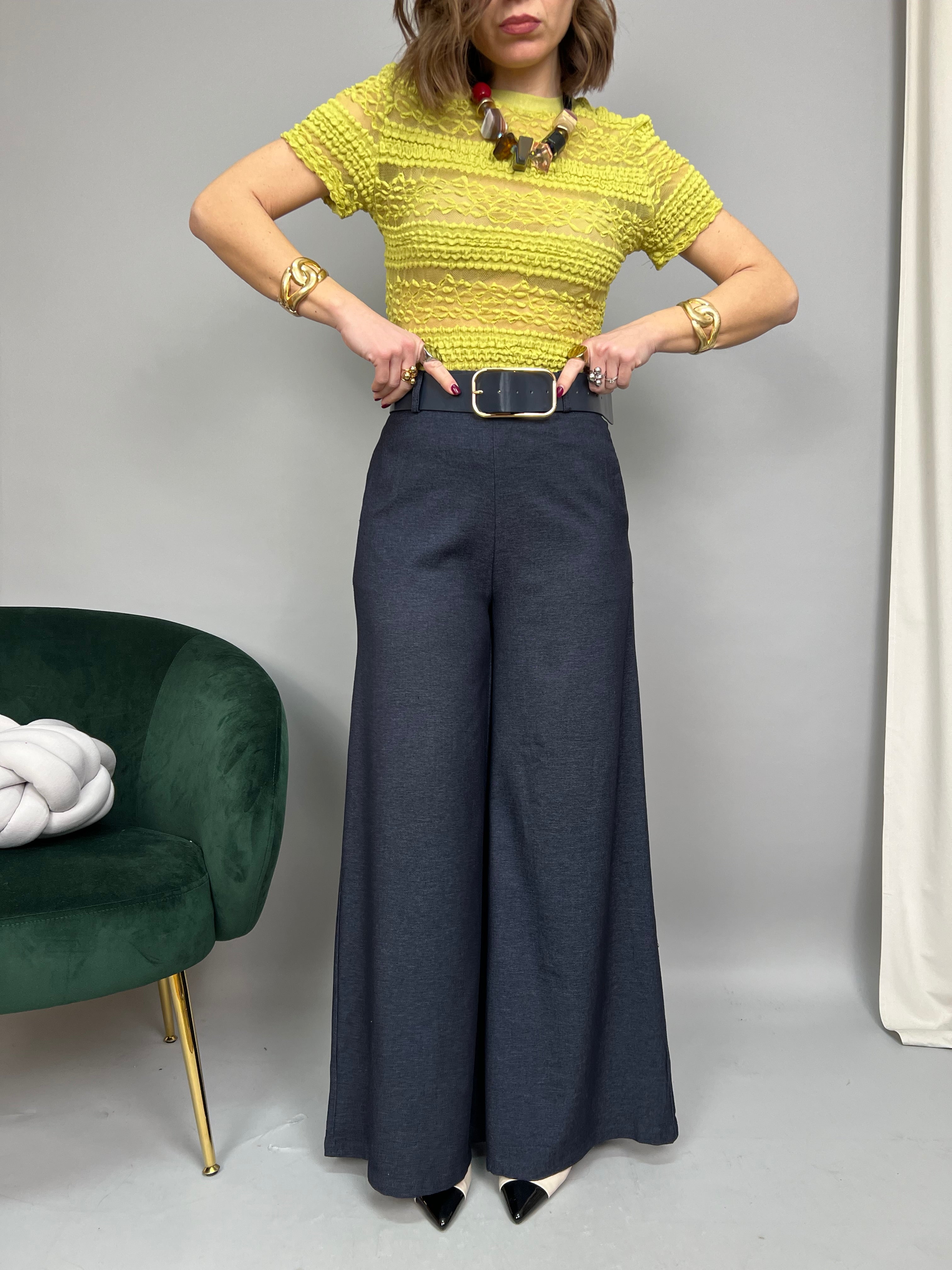 Pantalone modello "Wide leg" dalla gamba dritta e vita alta. Presenta una chiusura con zip laterale, tasche laterali ed elastico sul retro. La vestibilità è comoda. La cintura è inclusa.