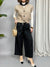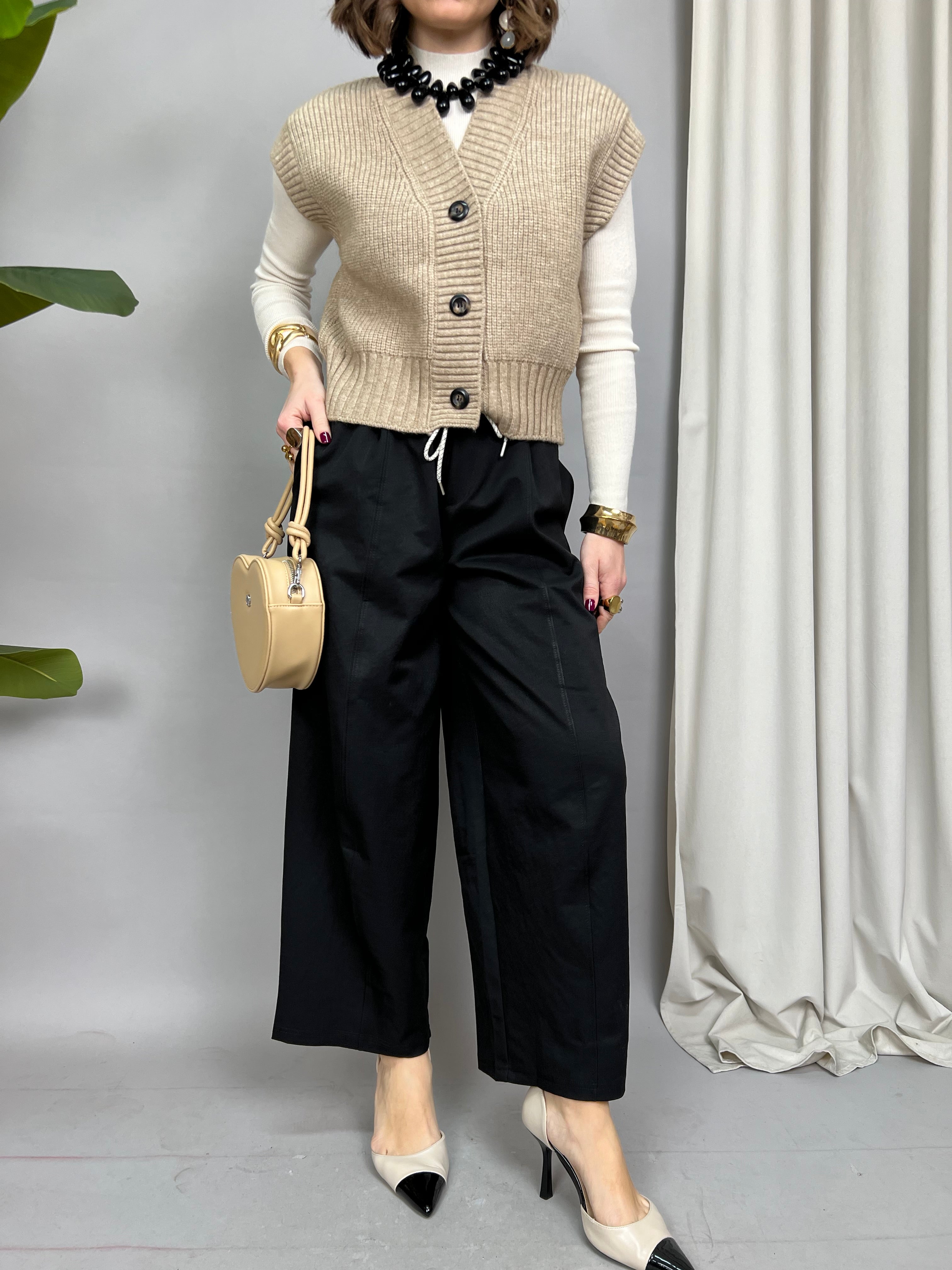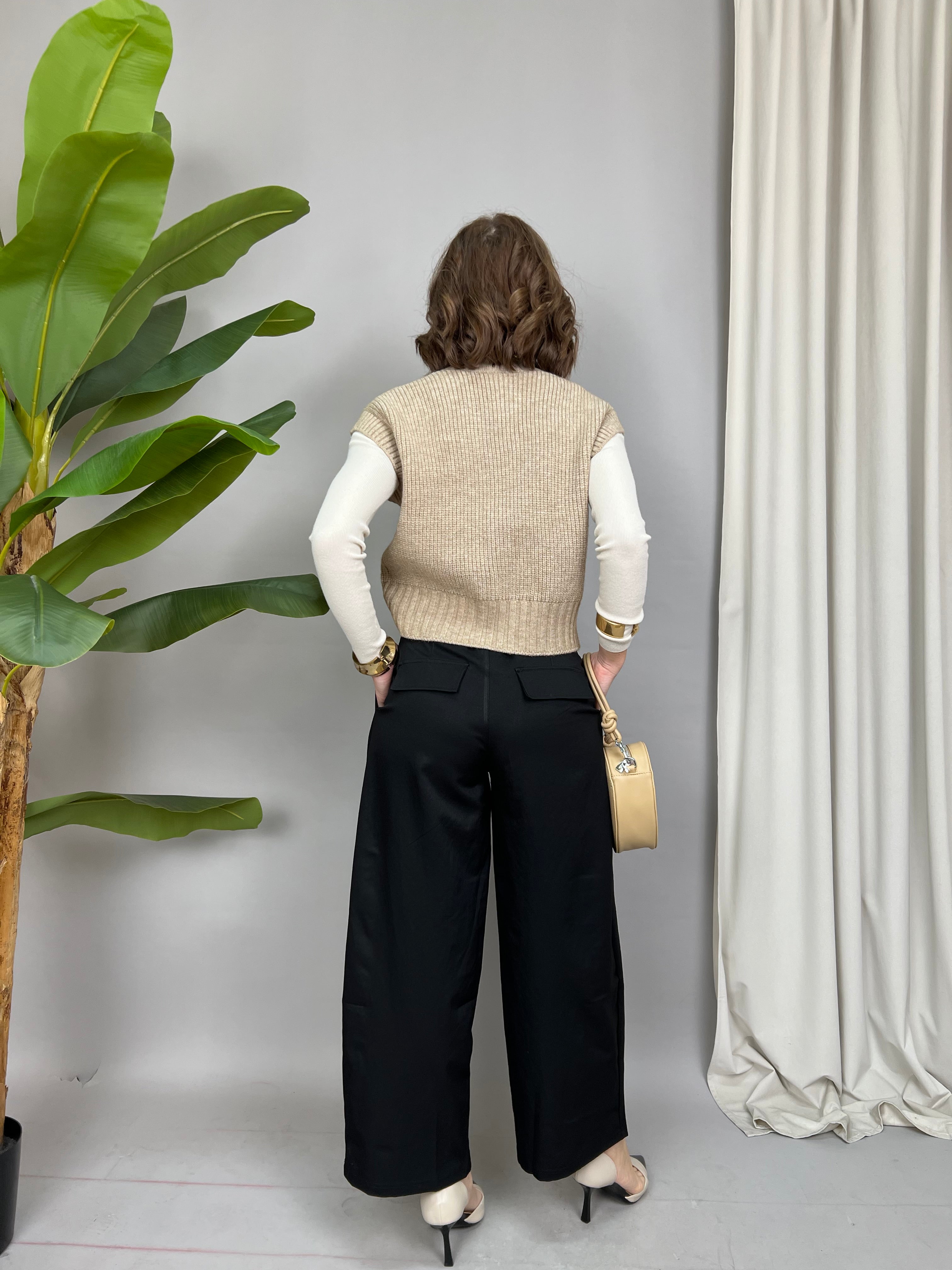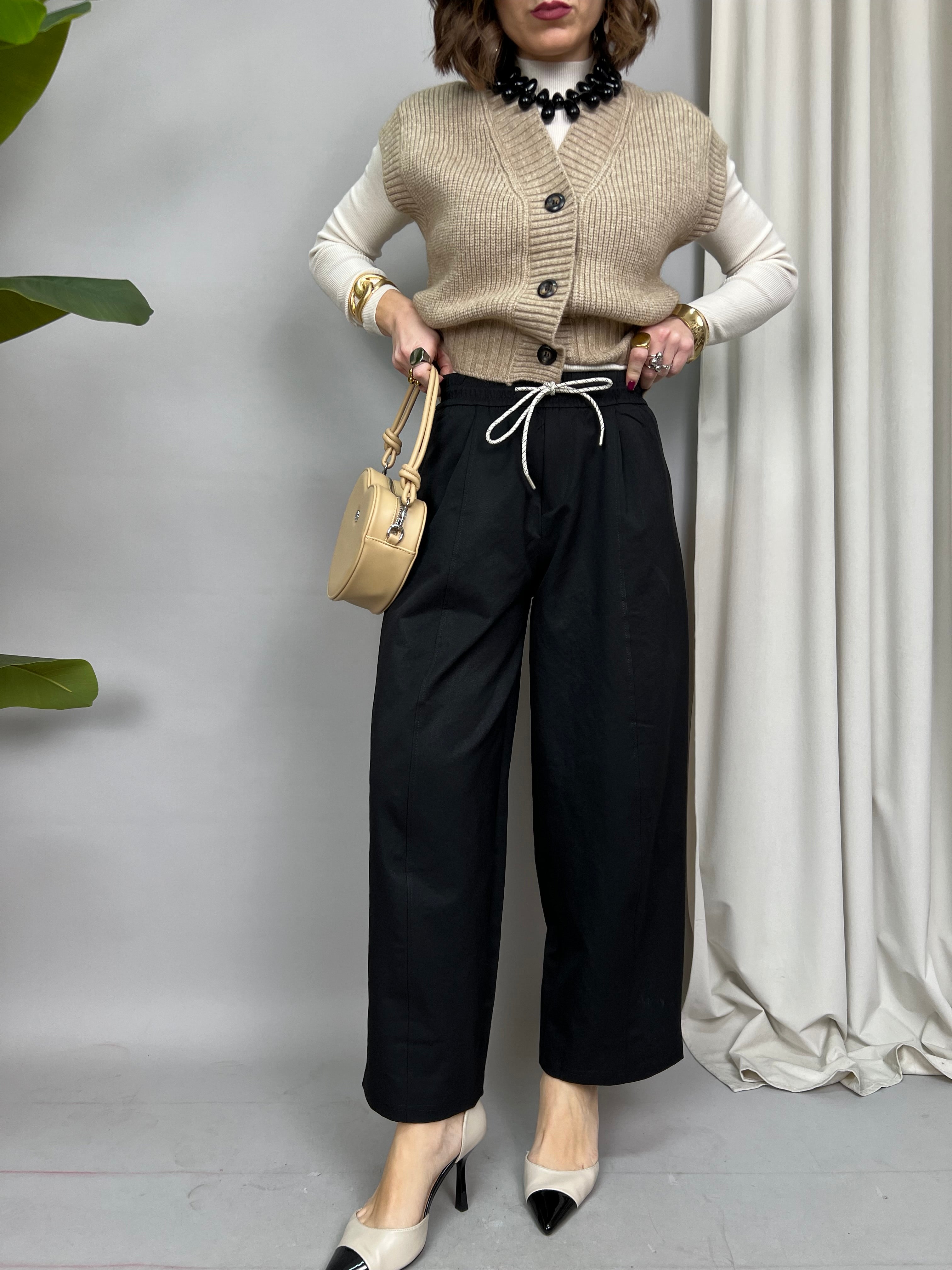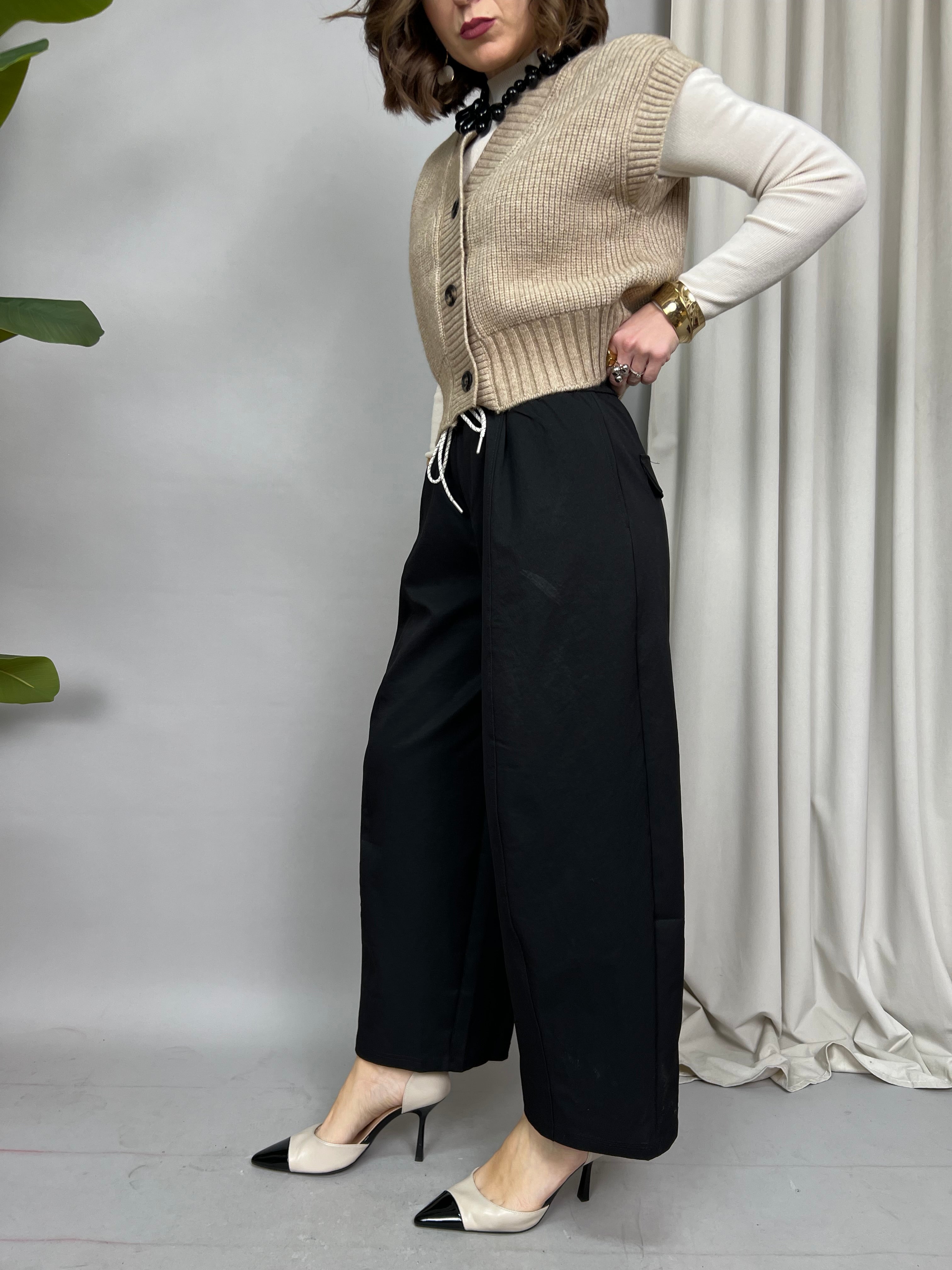 Pantalone Wide Leg con pinces frontali e tasche laterali. In vita è presente un elastico con un laccetto per regolarne la larghezza. Sul retro sono presenti due tasche decorative.