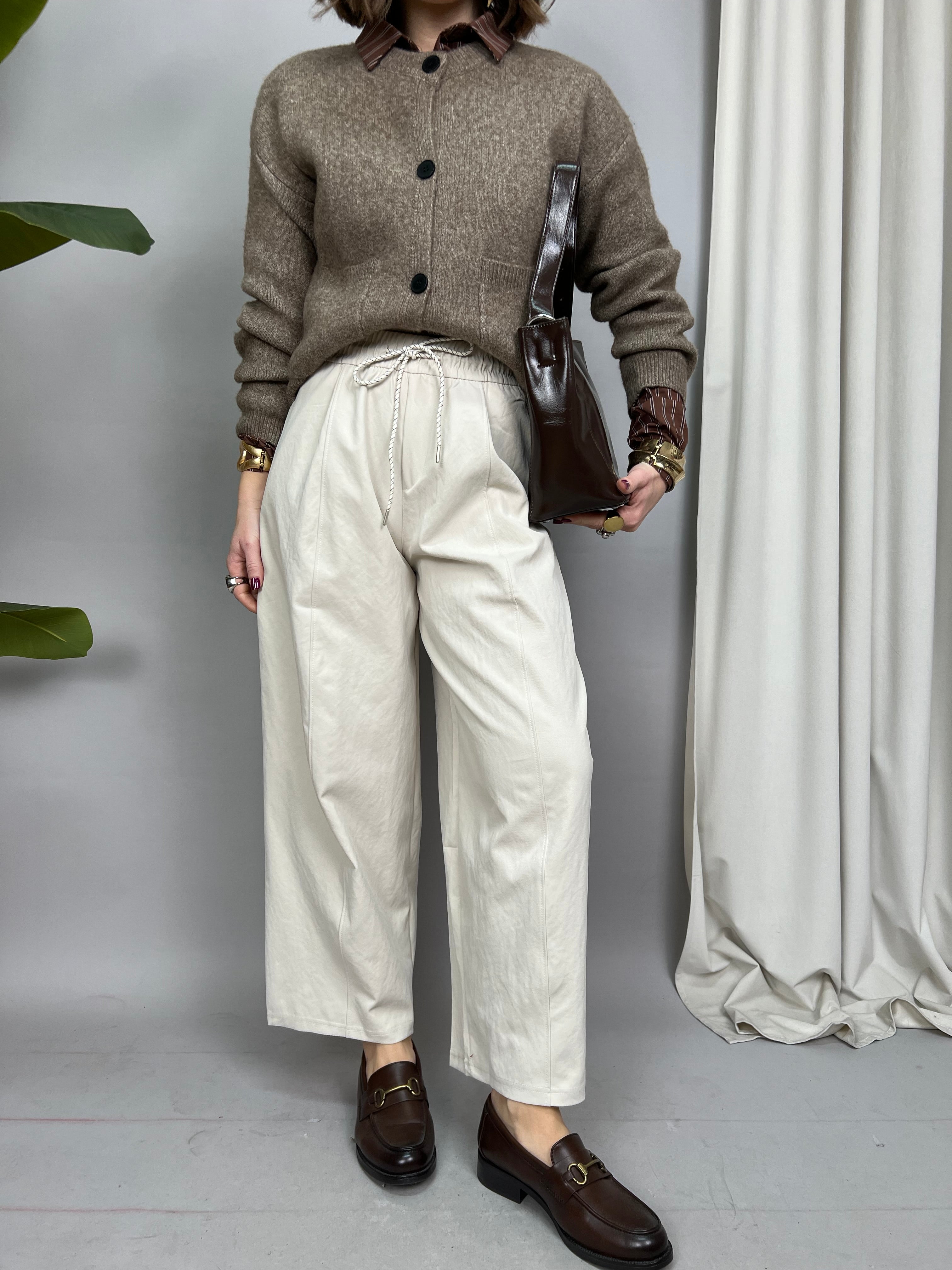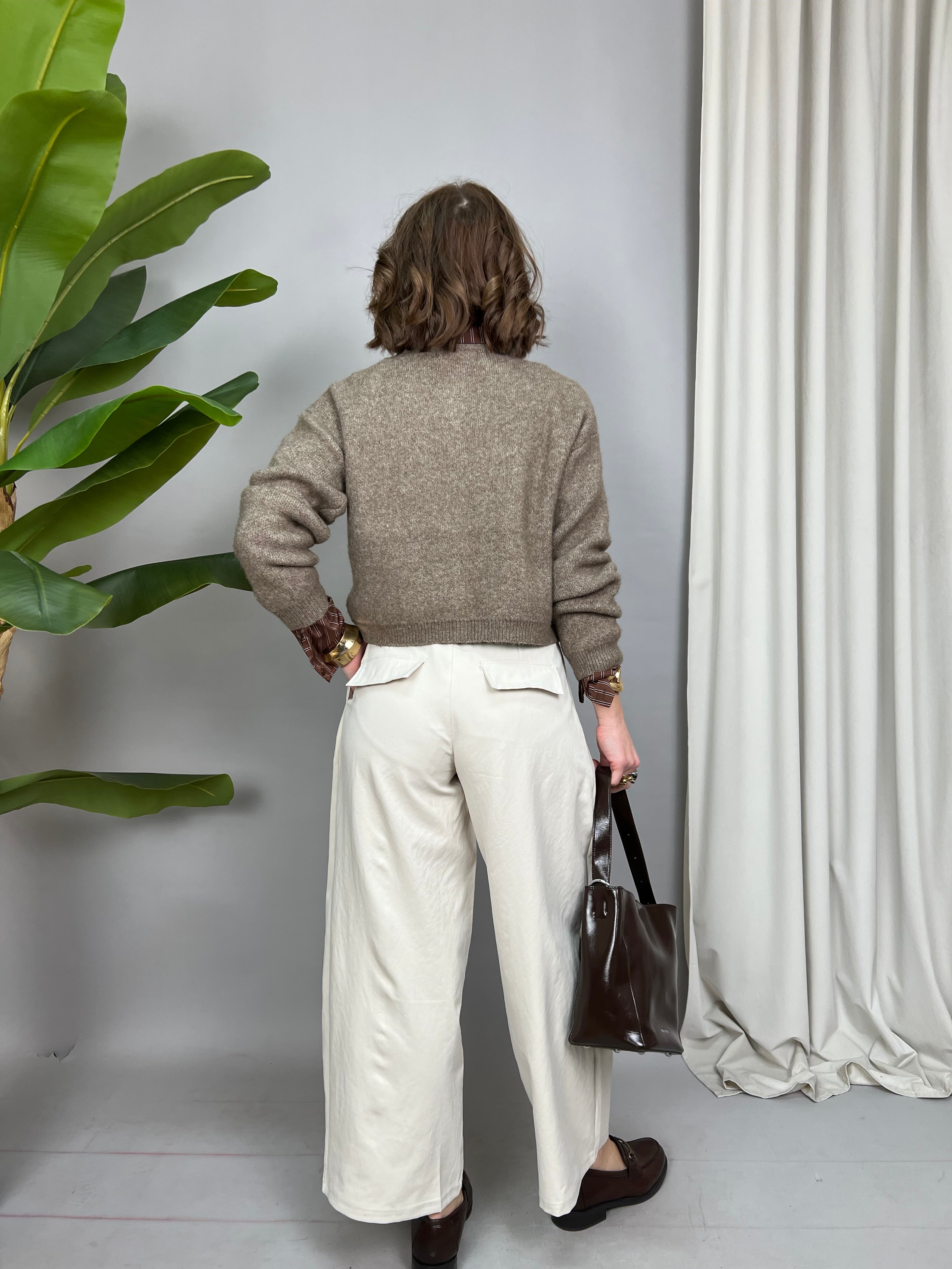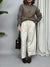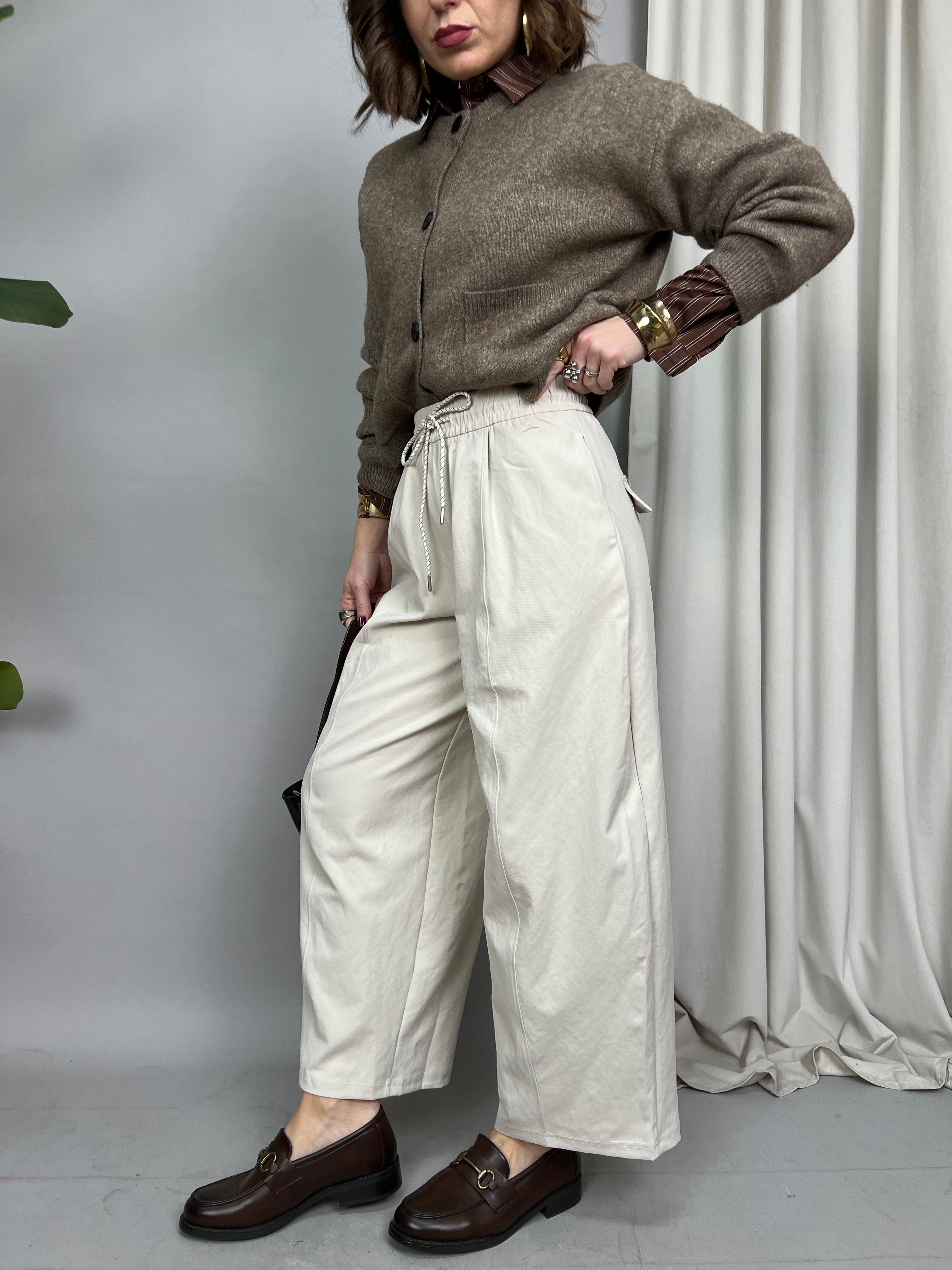 Pantalone Wide Leg con pinces frontali e tasche laterali. In vita è presente un elastico con un laccetto per regolarne la larghezza. Sul retro sono presenti due tasche decorative.