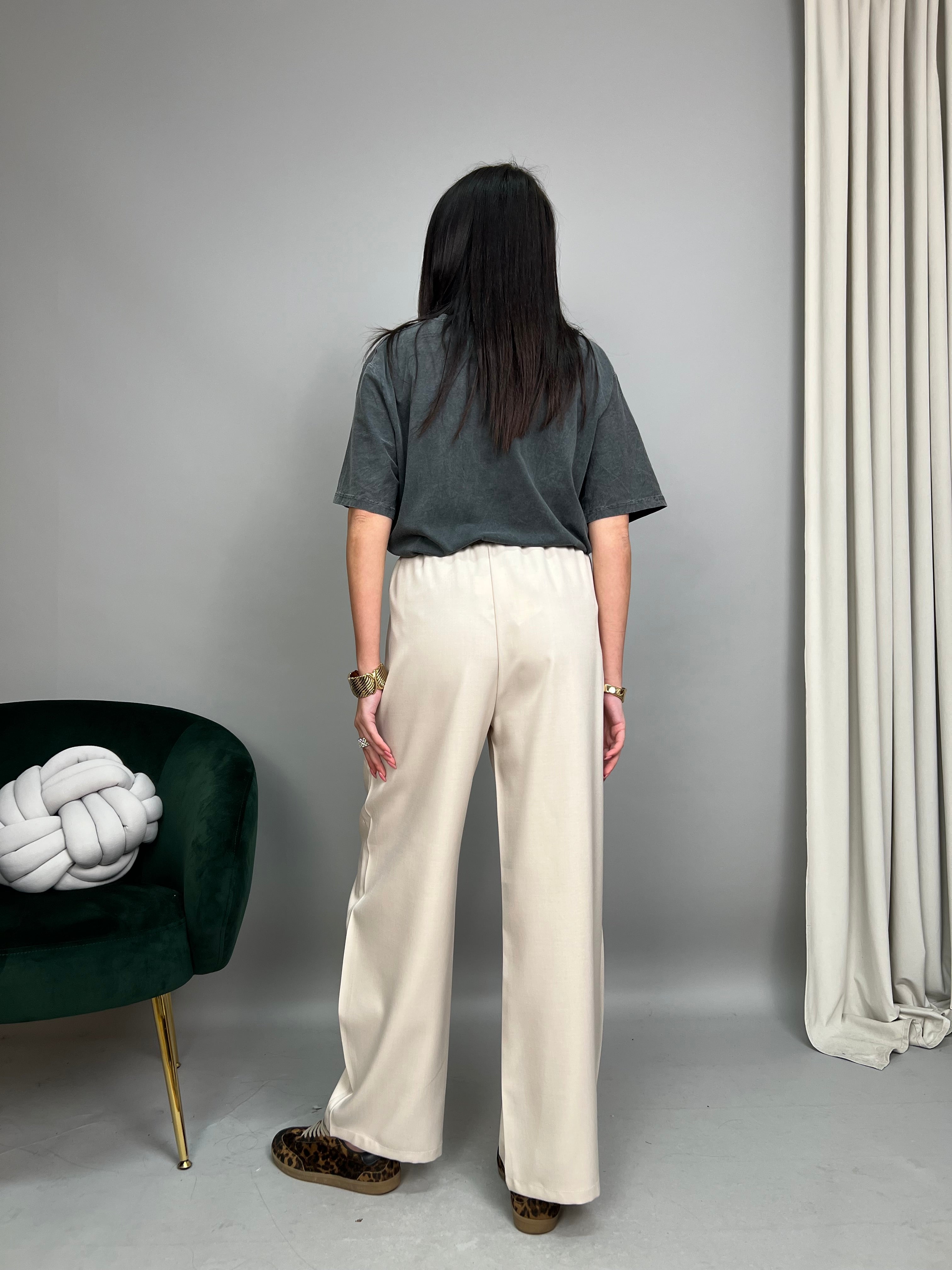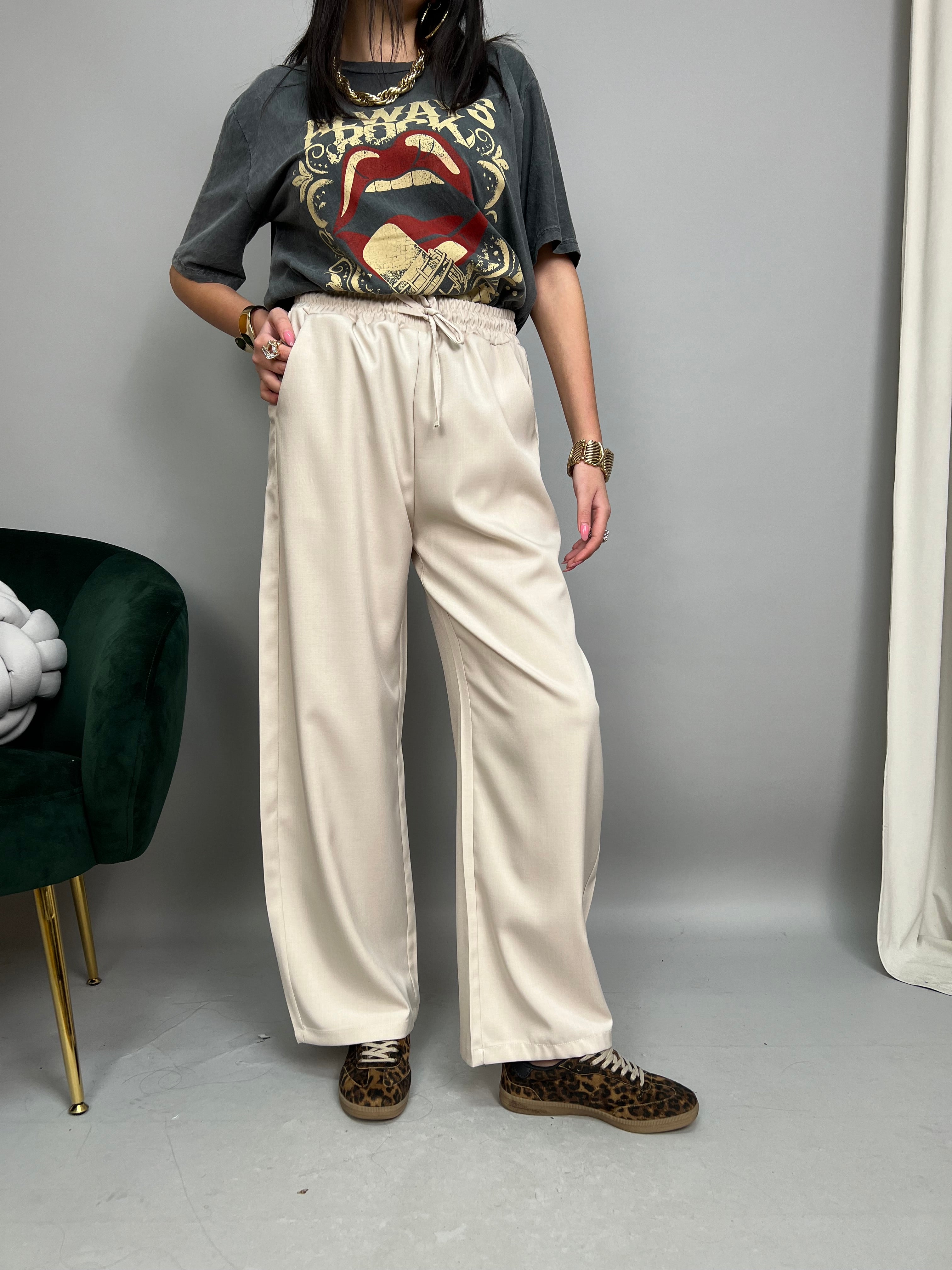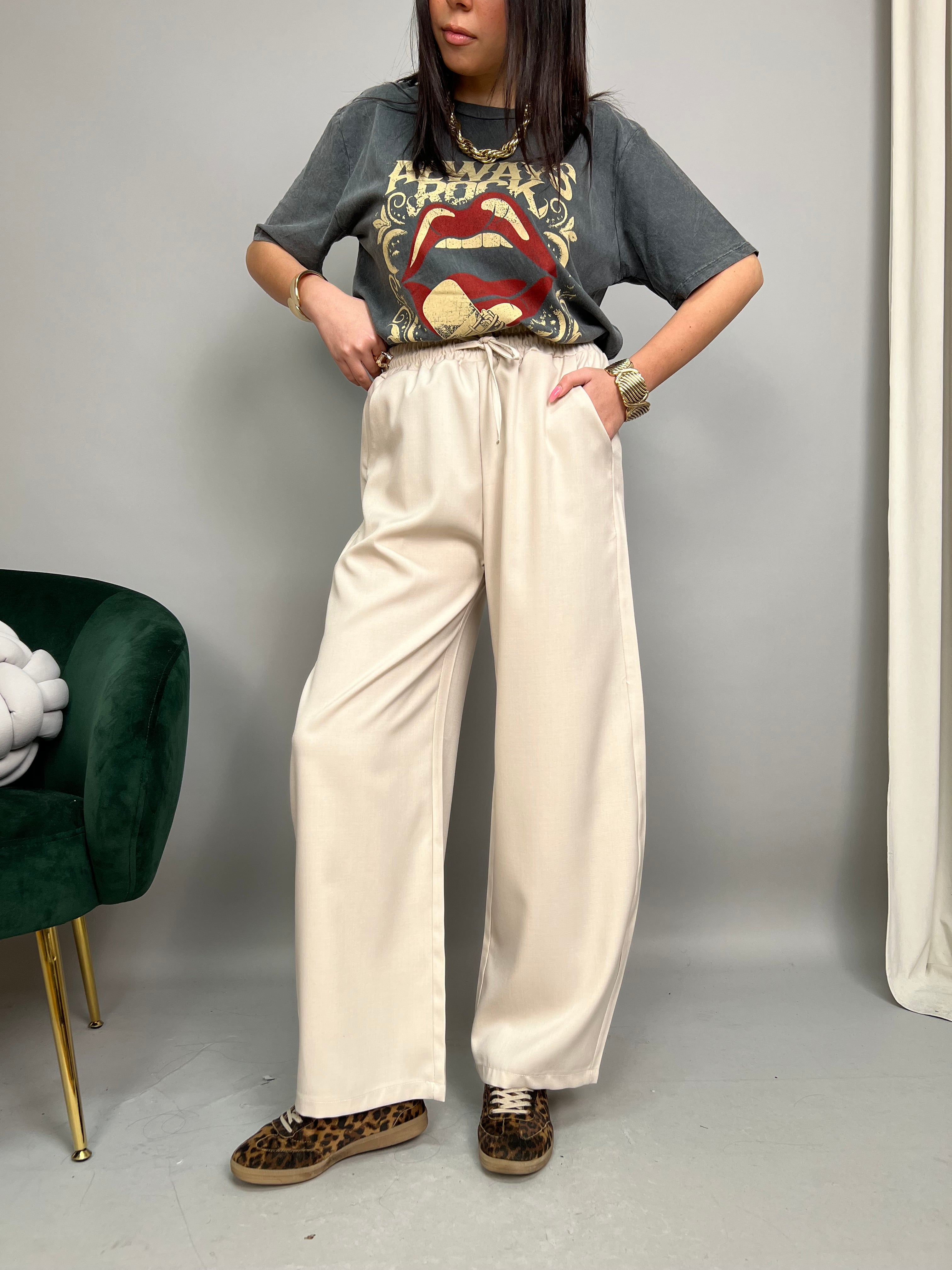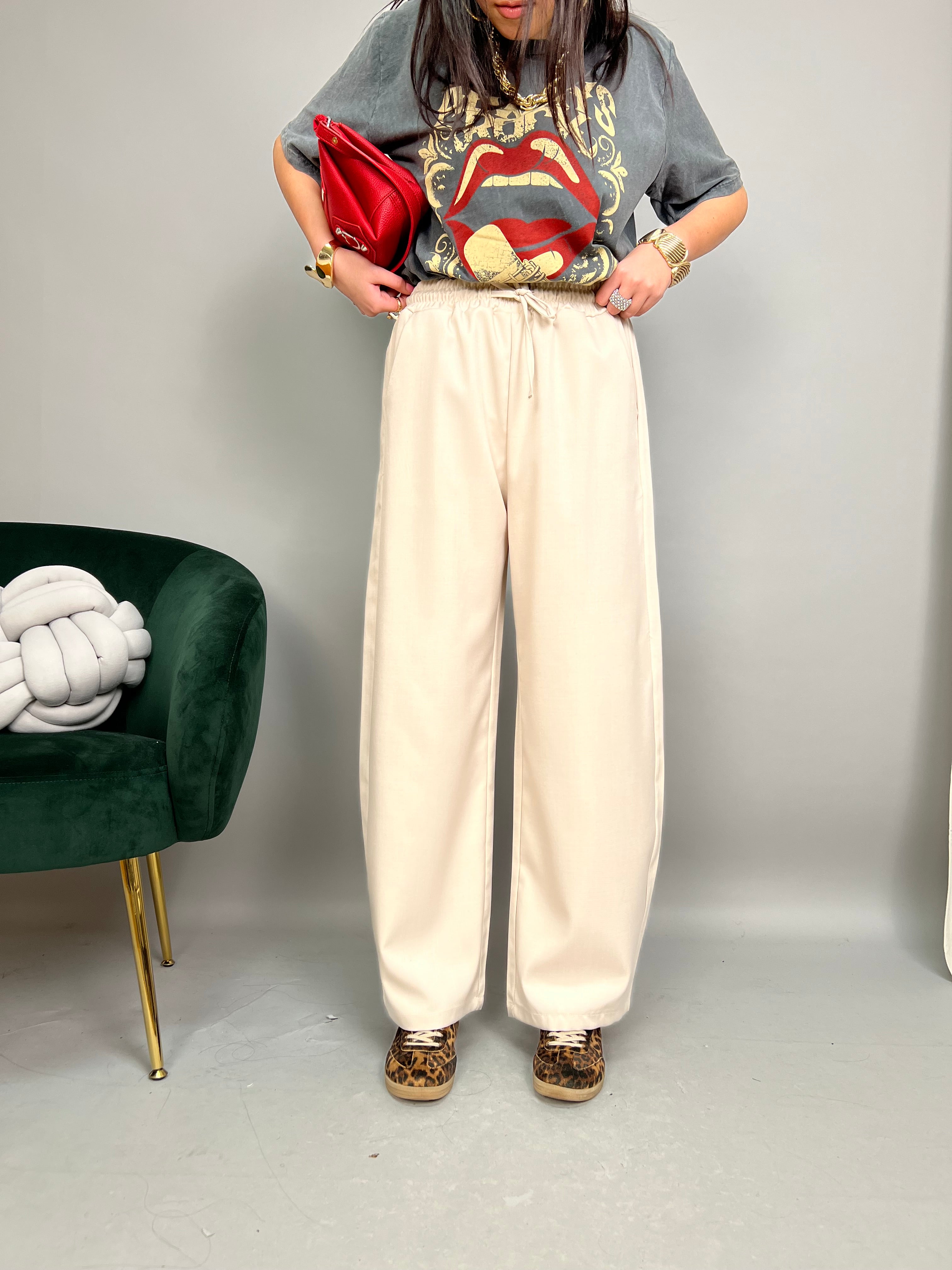 Pantalone modello Barrel, dalla gamba comoda e ampia, che va stringersi leggermente sul fondo. Presenta tasche laterali ed elastico in vita regolabile con un laccetto. La vestibilità è comoda.