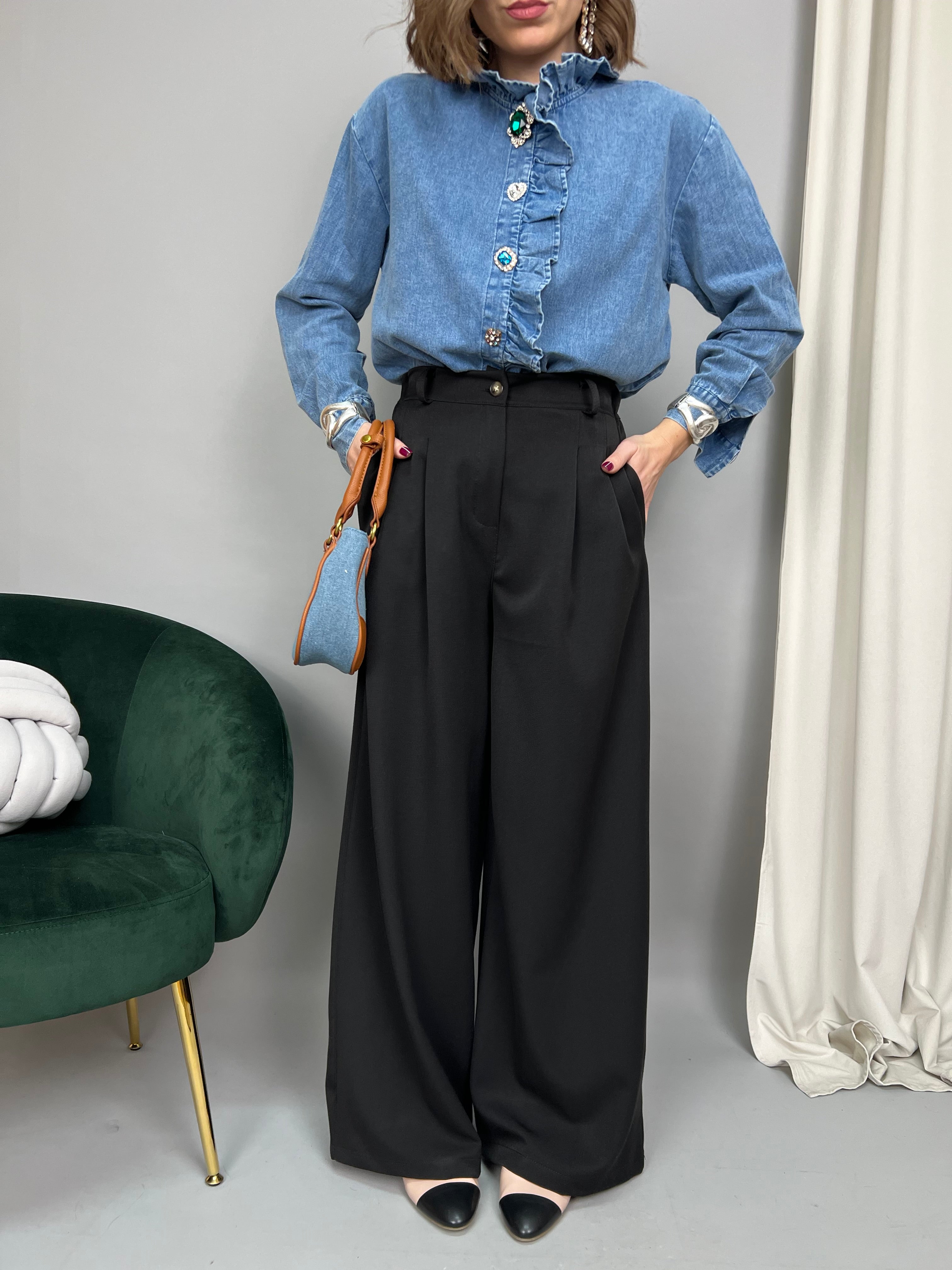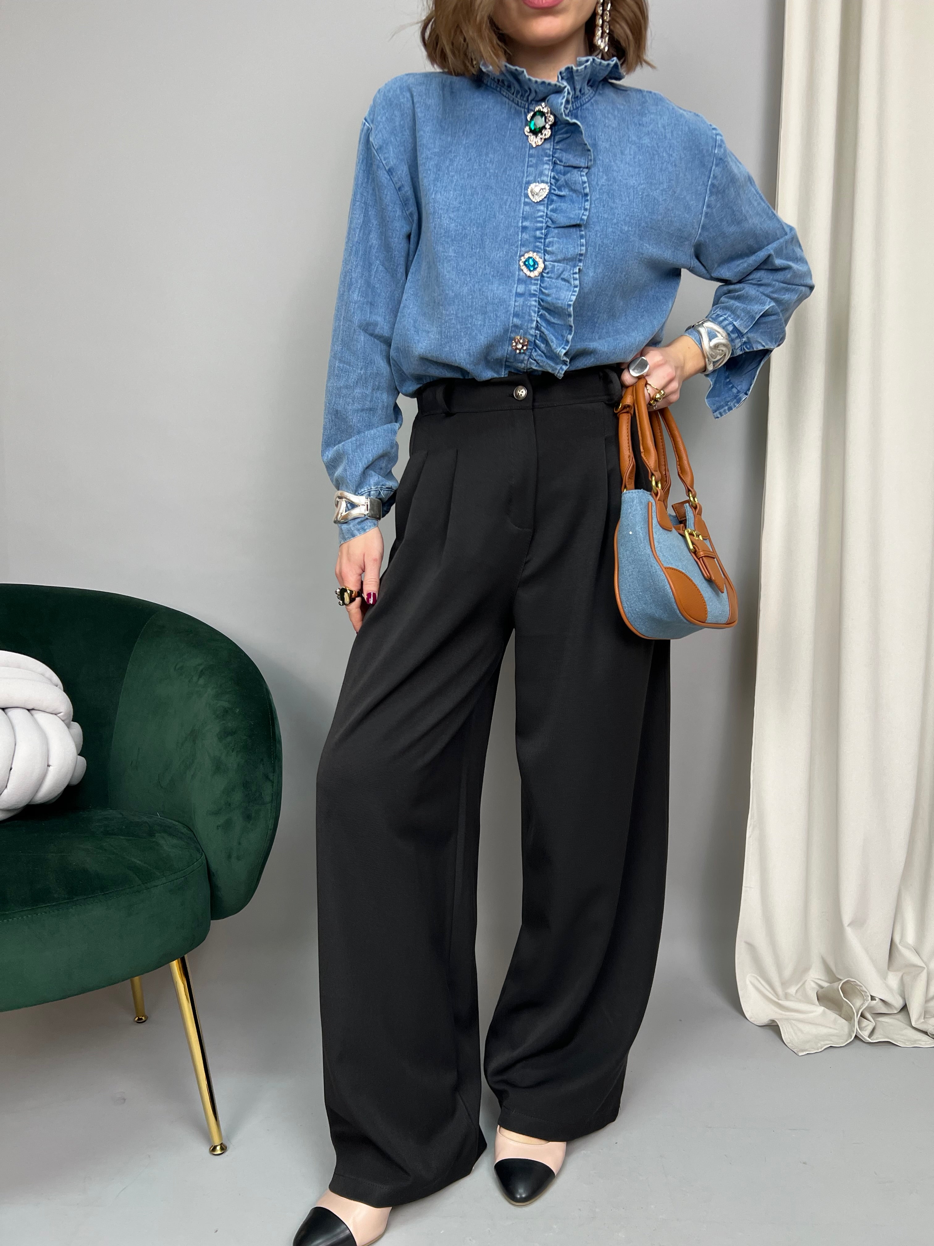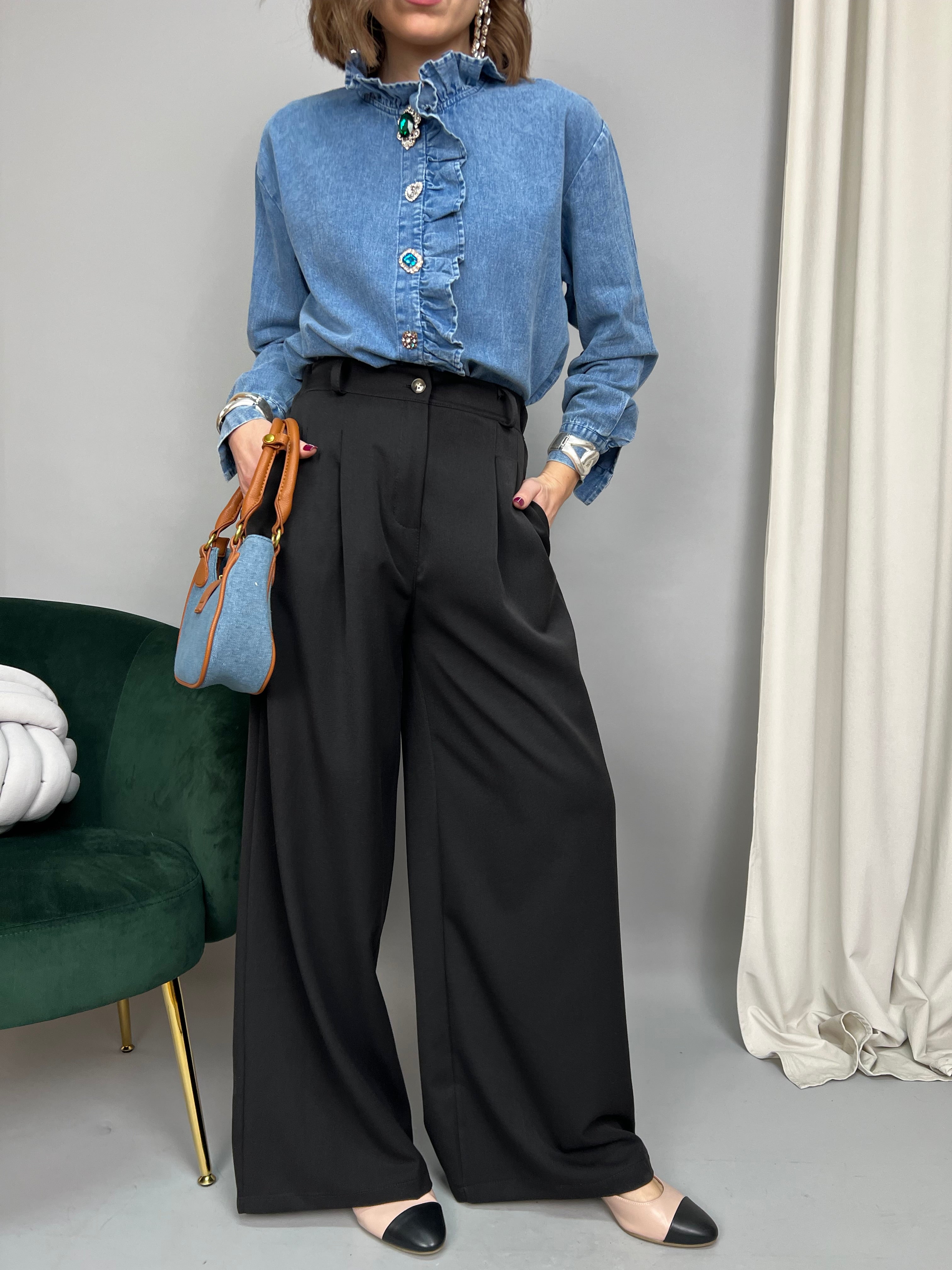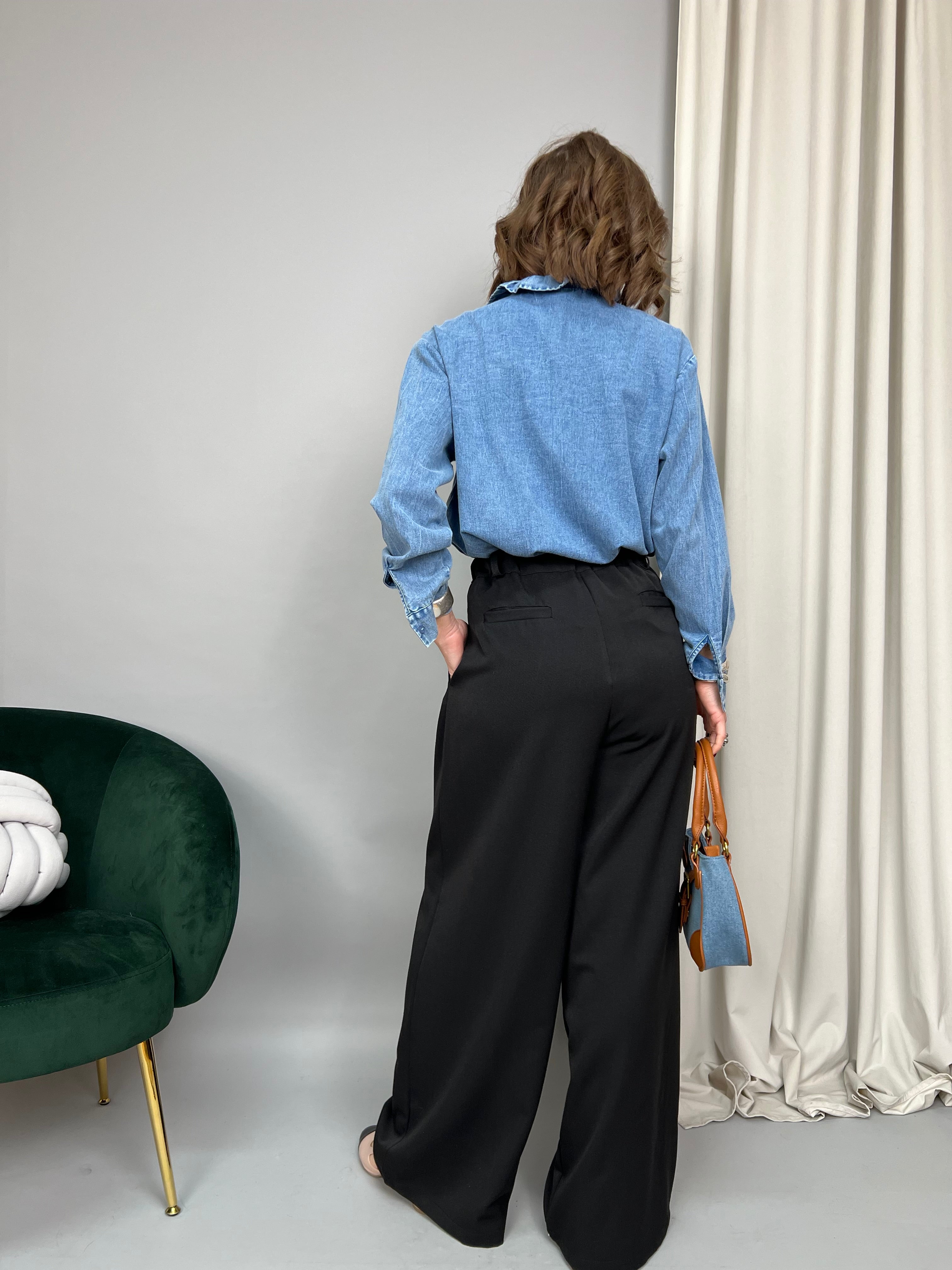 Pantalone modello palazzo dalla gamba dritta. Presenta pinces frontali, tasche laterali ed elastico sul retro. La vestibilità è molto comoda.