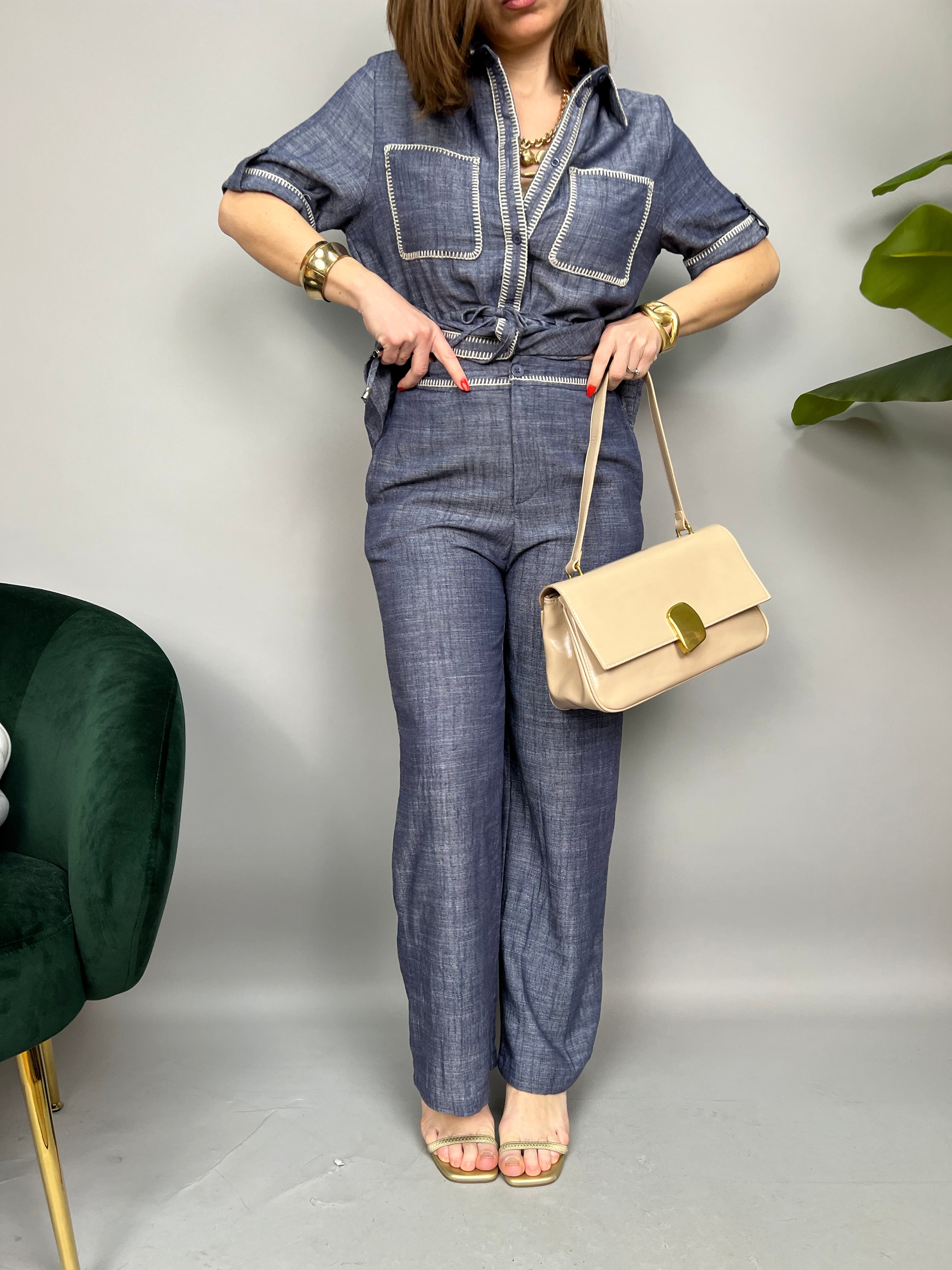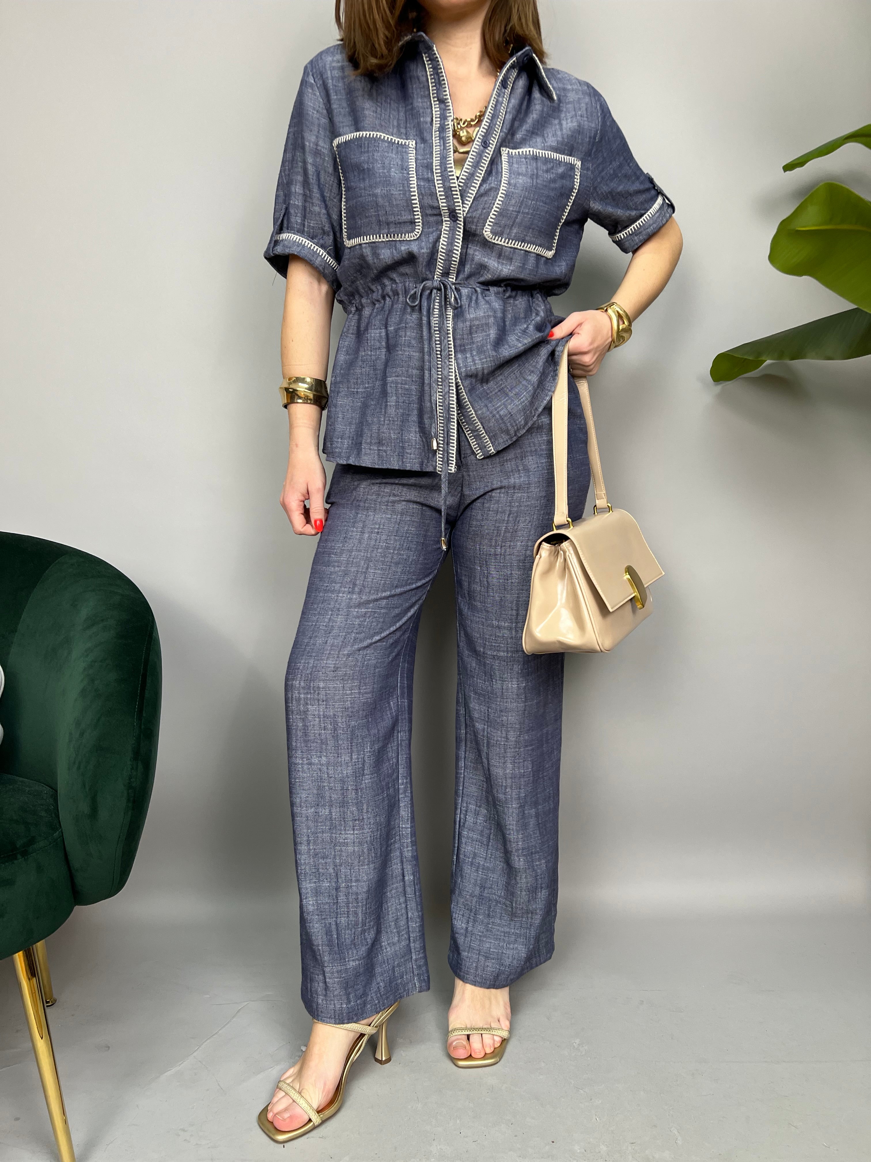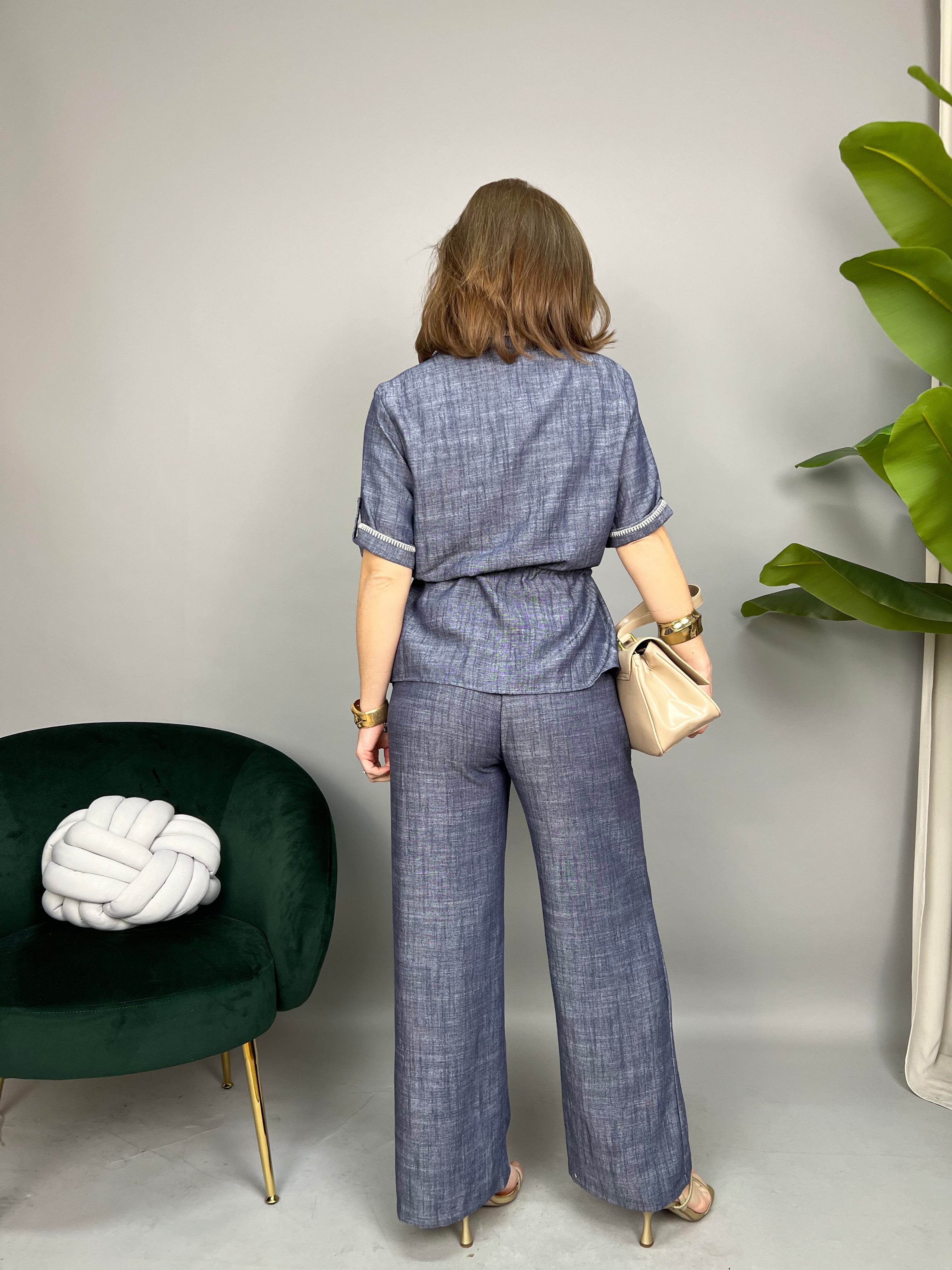 Pantalone in misto cotone e lino, un modello "Palazzo" con una gamba dritta, a vita alta, chiusura frontale con zip & bottone, elastico sul retro e tasche laterali. Impreziosito da ricami a contrasto sul bordo della vita. Il tessuto è fresco e la vestibilità è comoda.
