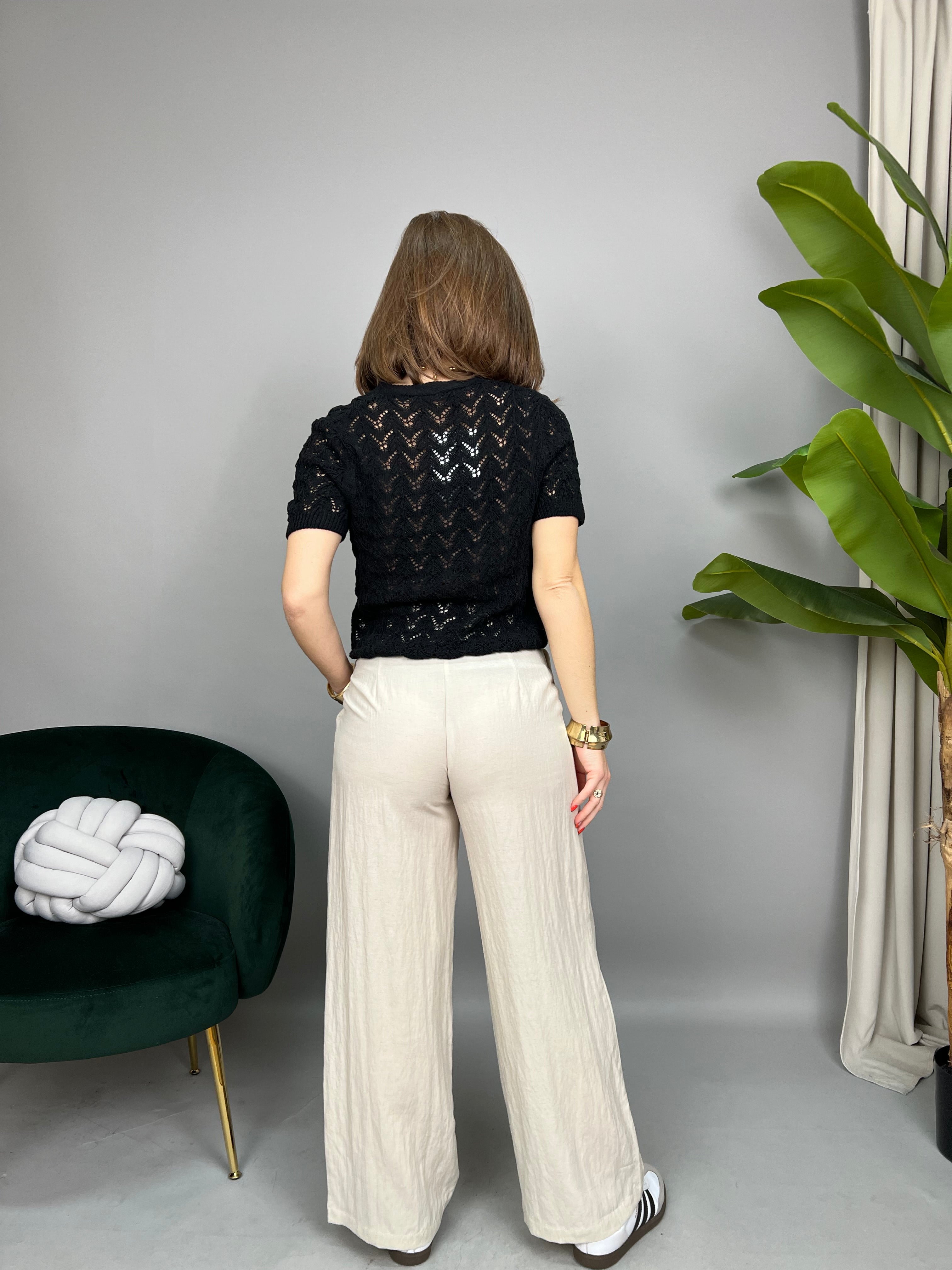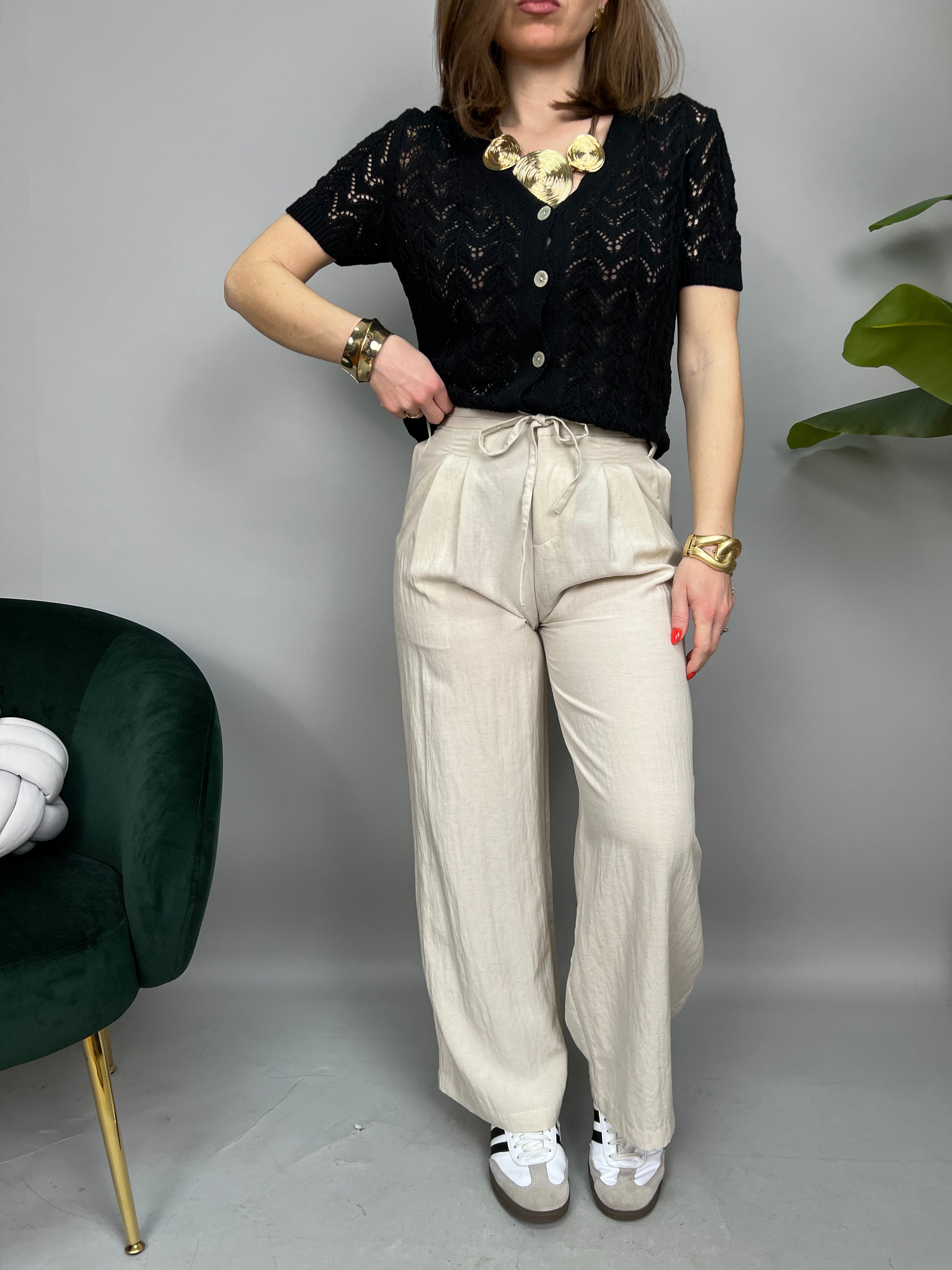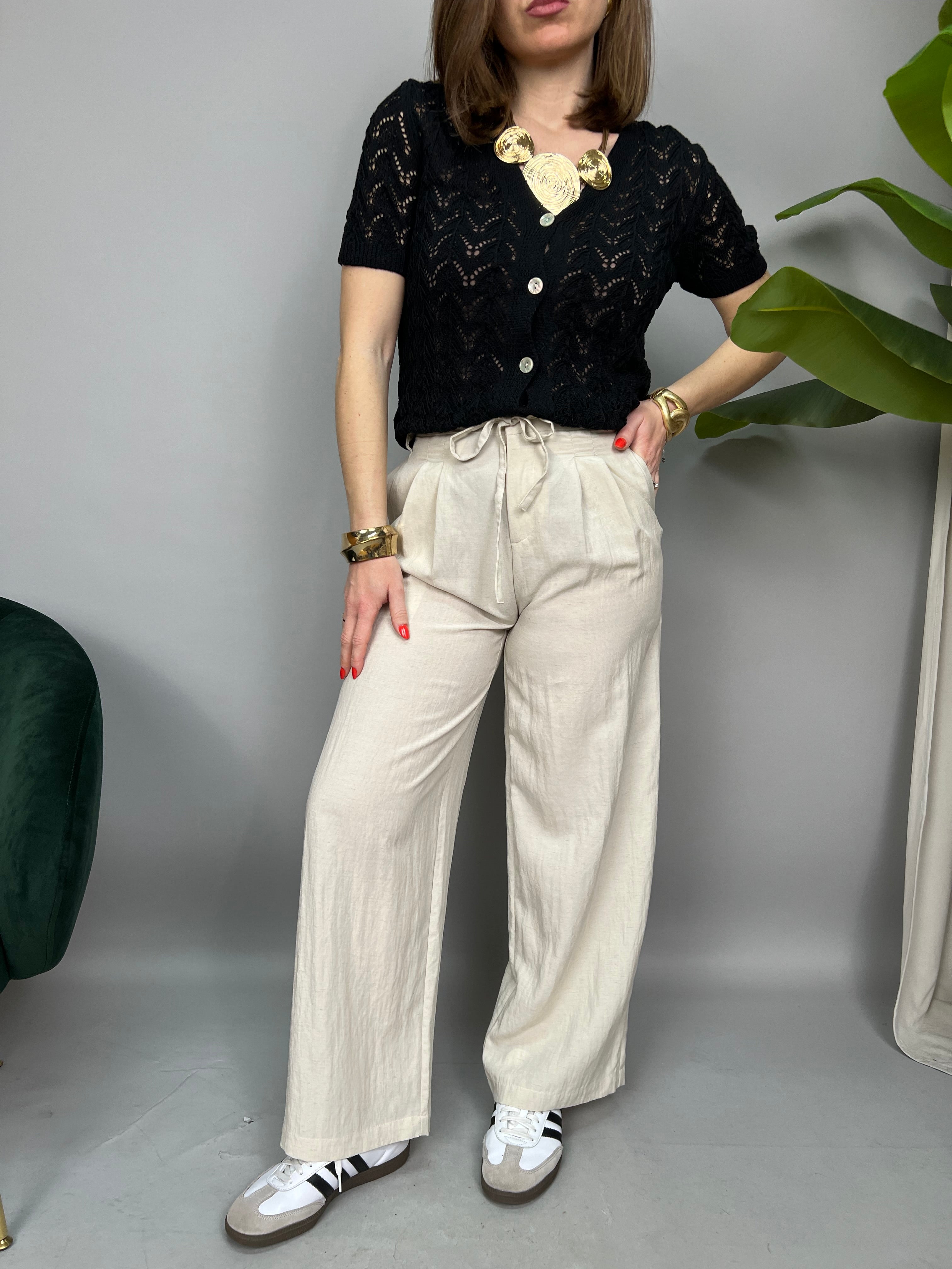 Pantalone modello "palazzo" dalla gamba dritta, chiusura con zip e doppio bottone, pinces frontali e tasche laterali. Il tessuto rimane fresco e la vestibilità è comoda e regolare. Il laccetto in vita è incluso.