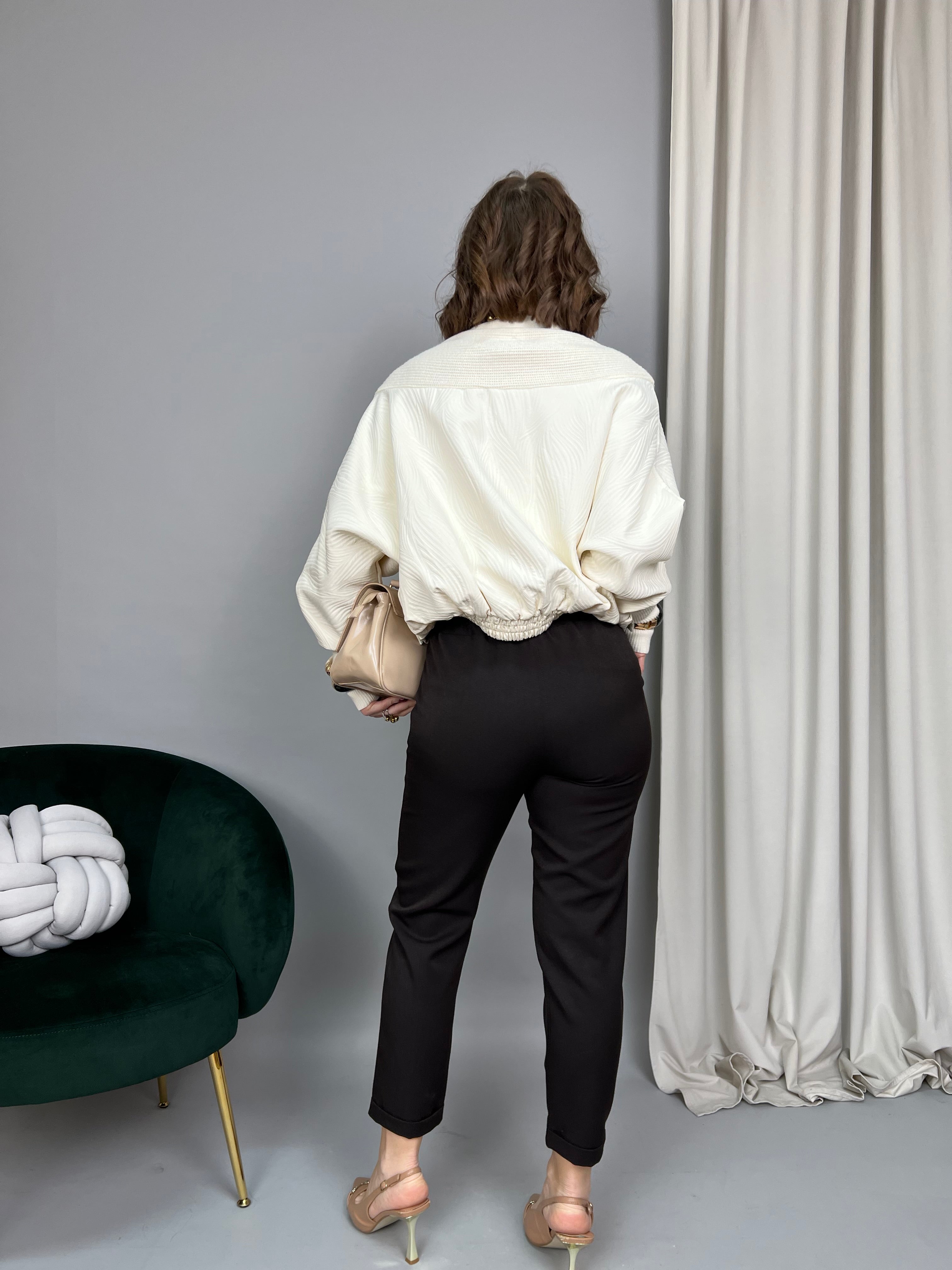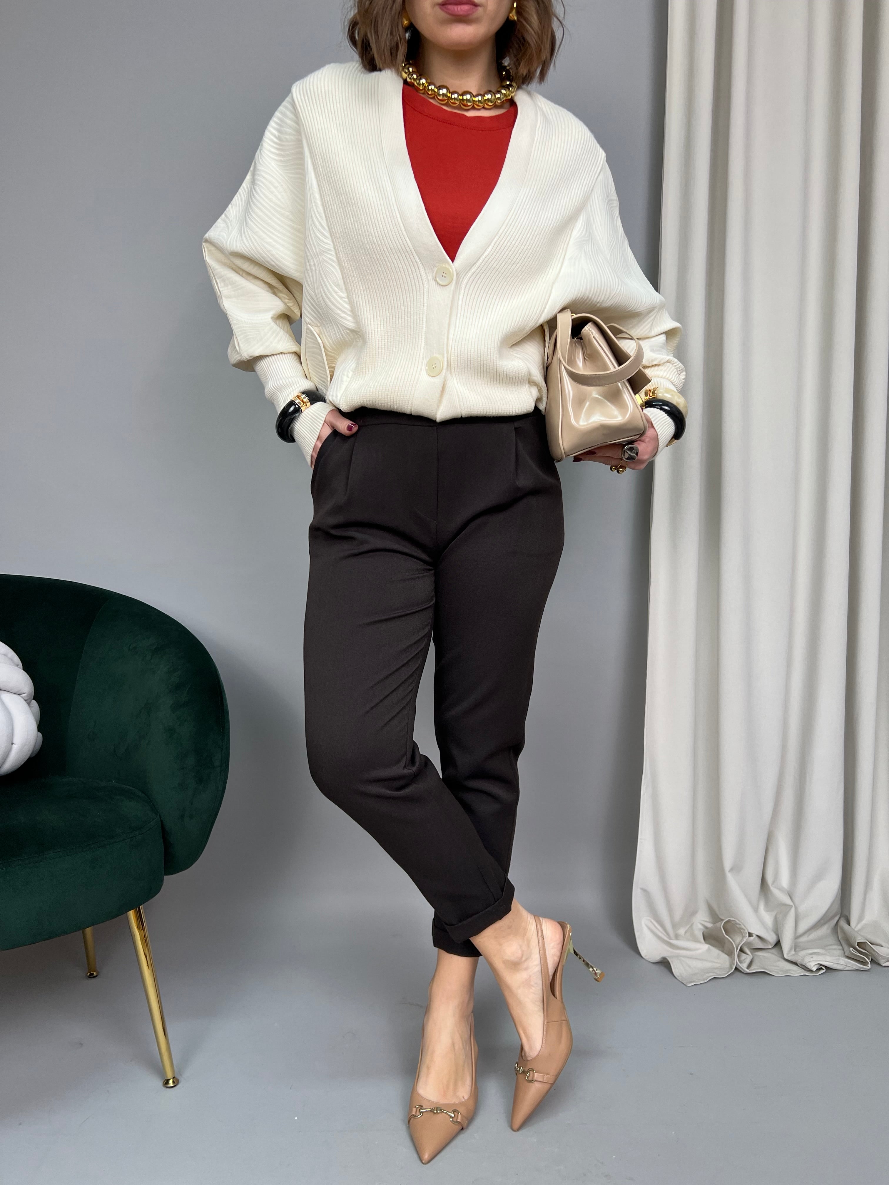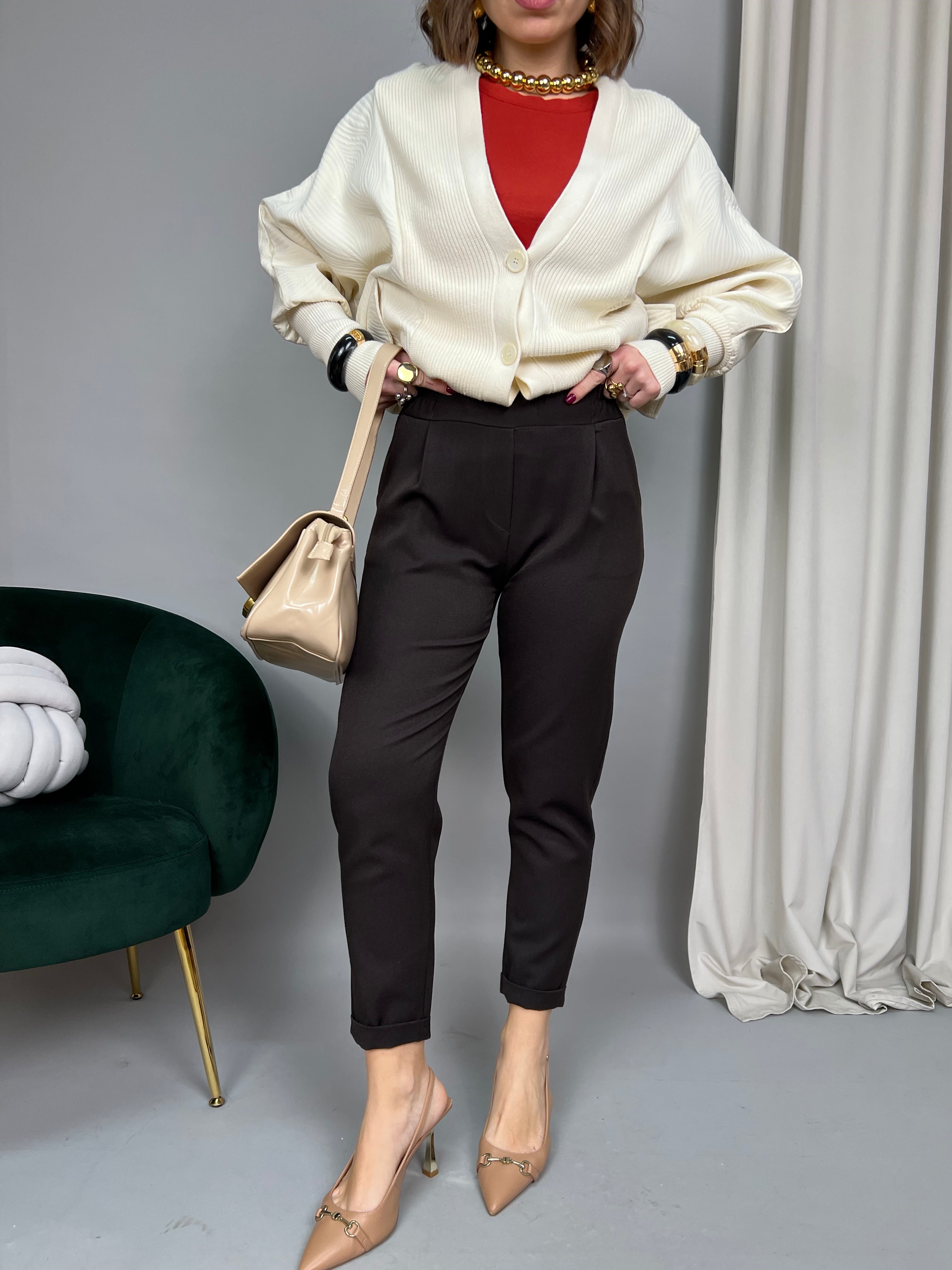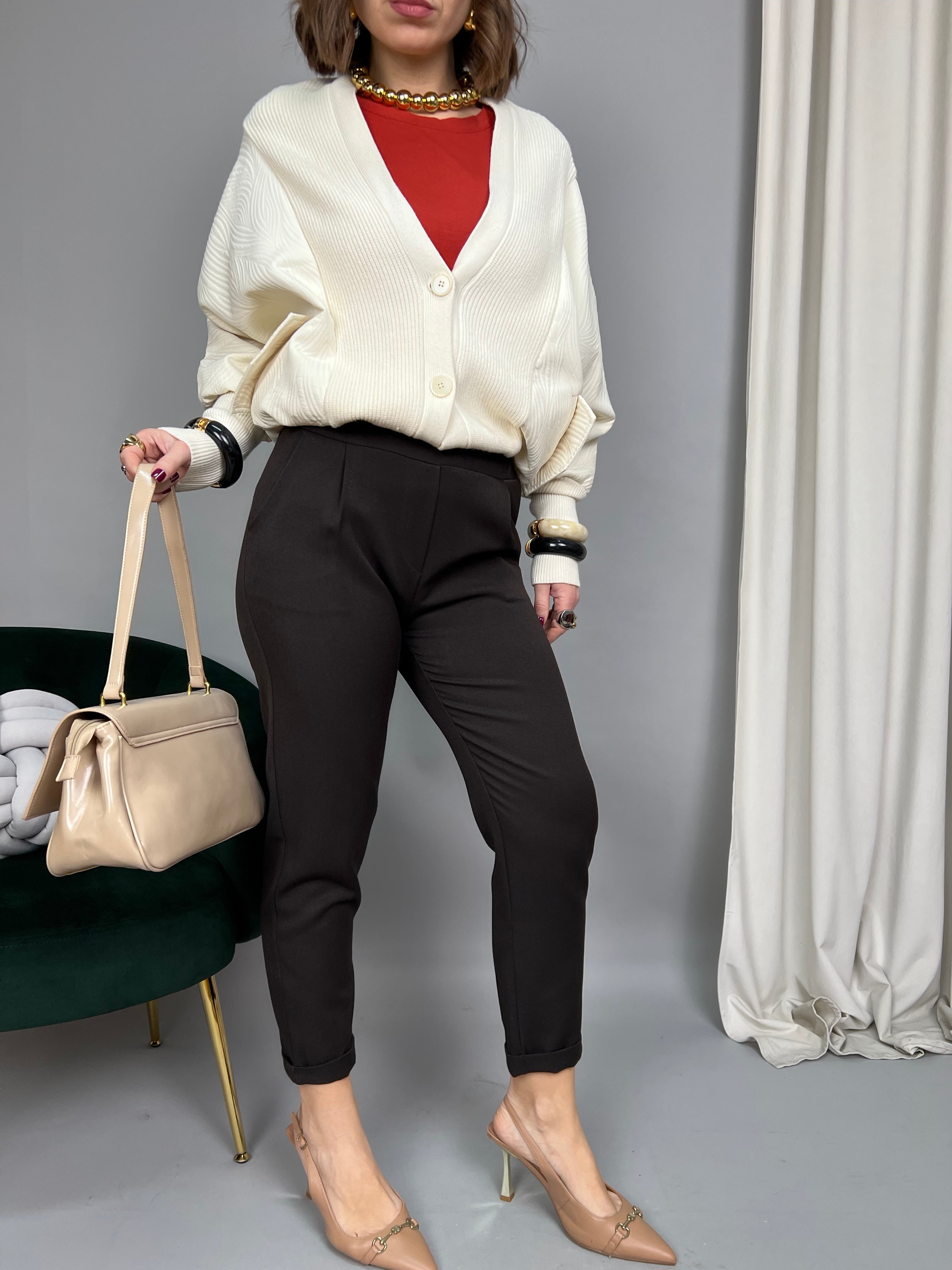 La modella è alta 1,65 e porta la taglia 40/42 (S/M) indossa una tg M
