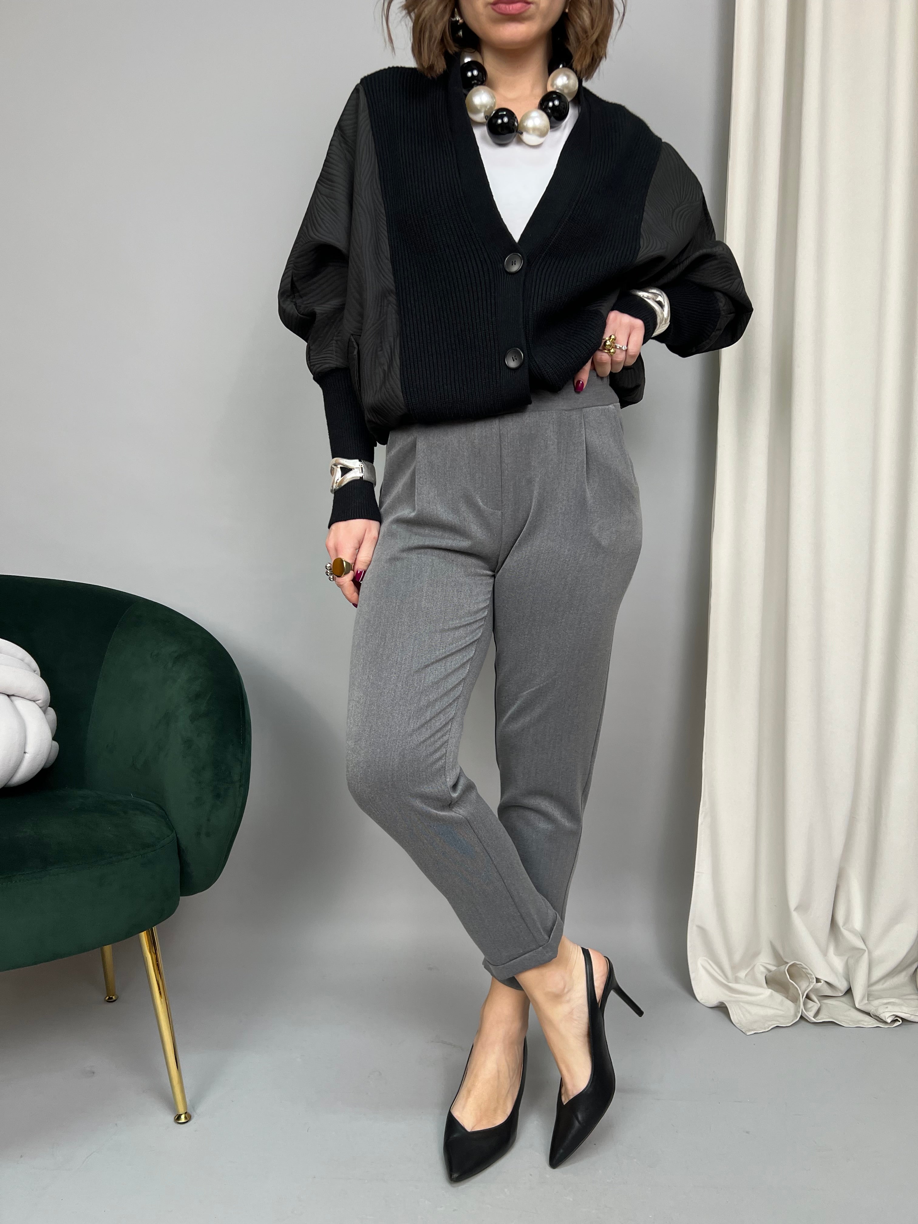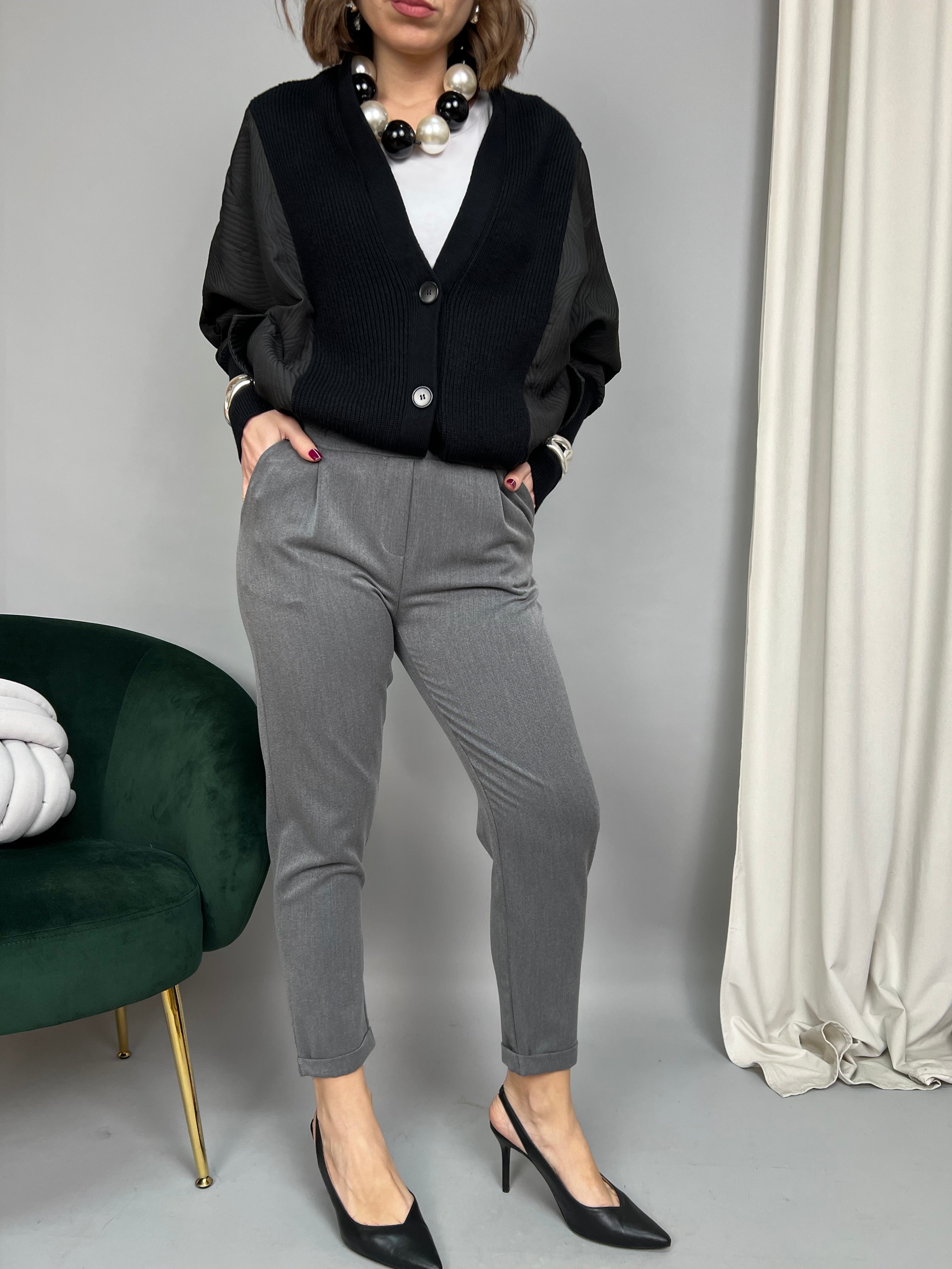 Pantalone modello "carrot fit", dalla vestibilità comoda che va a stringersi sulla lunghezza, con un risvolto fisso. Presenta pinces frontali, tasche laterali ed elastico in vita.