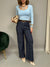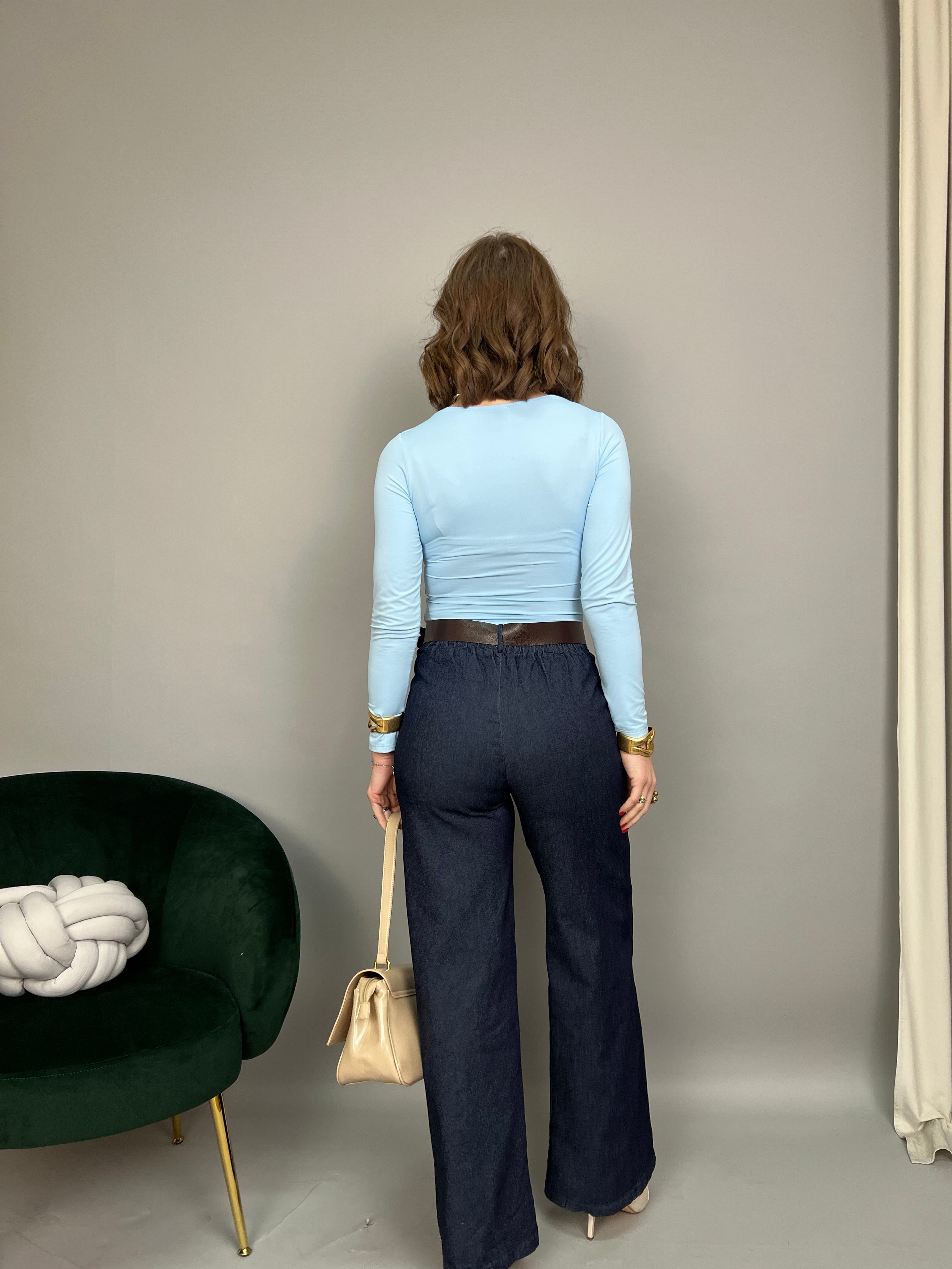 Pantalone in denim fino elasticizzato, un modello dalla gamba dritta e a vita alta. Presenta tasche laterali ed elastico sul retro. Il tessuto è morbido e fresco. La vestibilità è comoda e regolare. La cintura è inclusa.