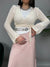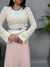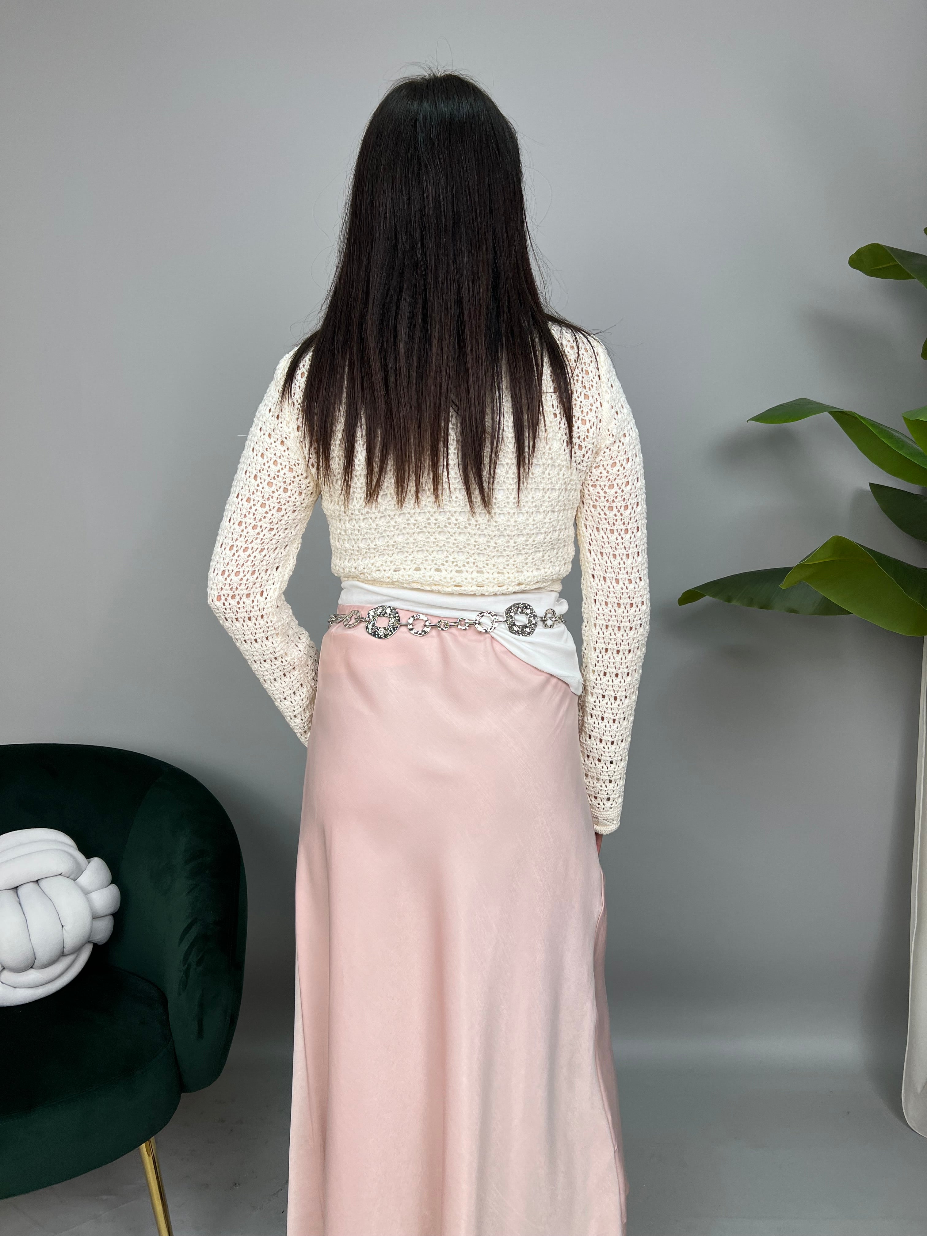 Scaldacuore con lavorazione traforata. Modello corto con incrocio frontale e chiusura regolabile con lacci da annodare in vita. Le maniche sono svasate sul fondo. La vestibilità è regolare.