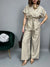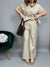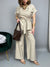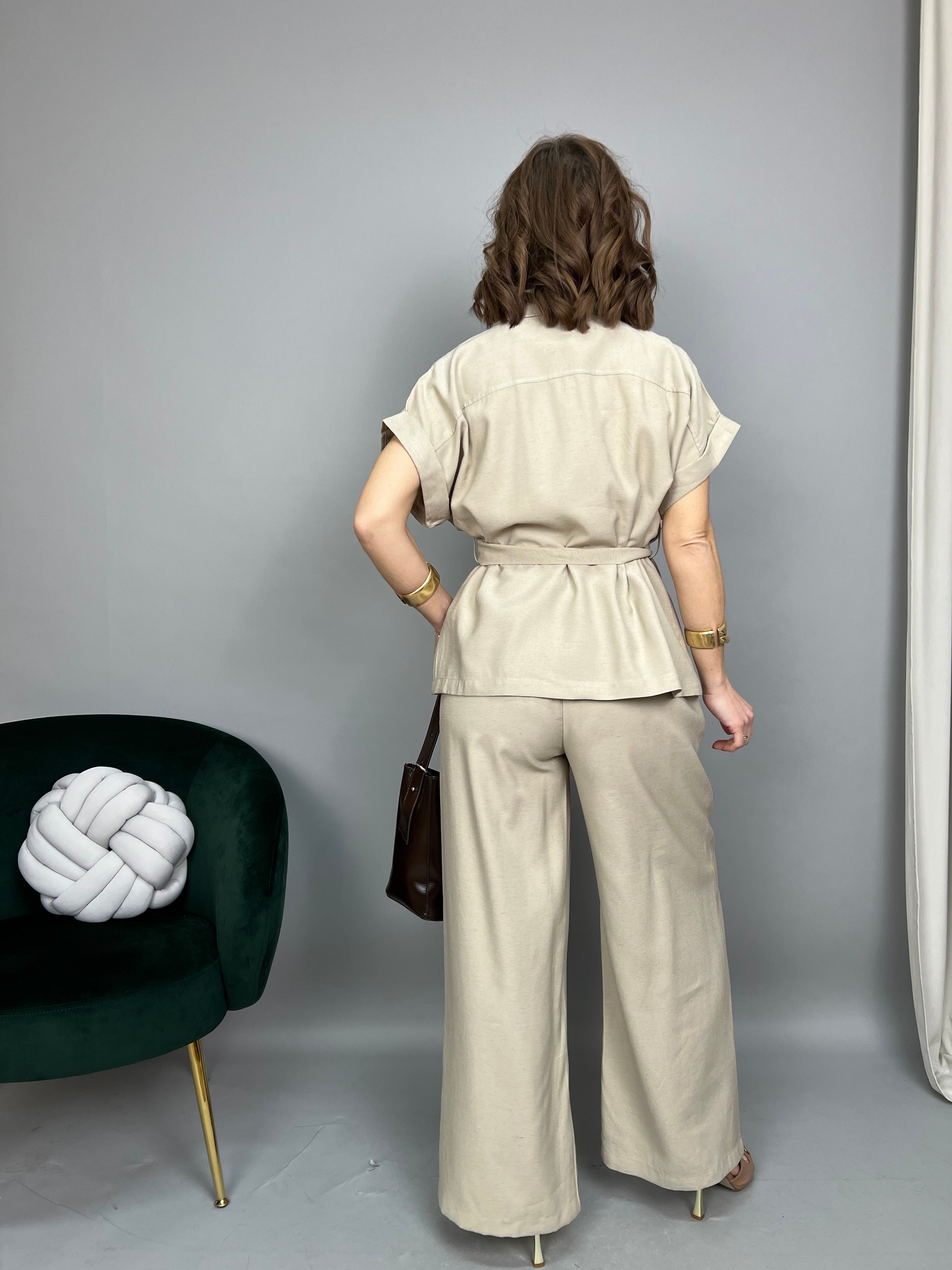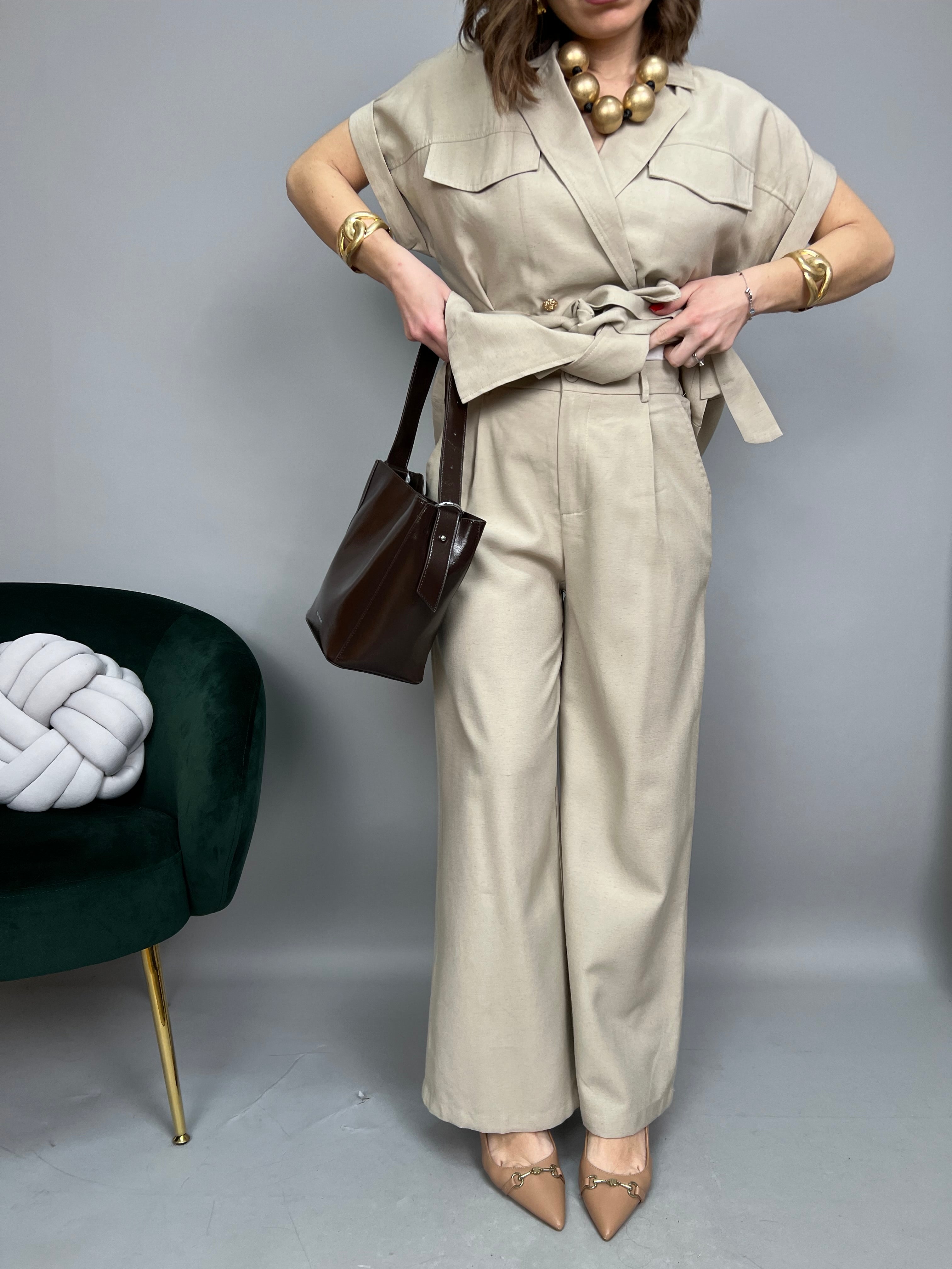 - Pantalone a palazzo con gamba dritta e comoda, con pinces frontali, chiusura zip e bottone, tasche laterali ed elastico sul retro con passanti in vita. La vestibilità è comoda e regolare.
