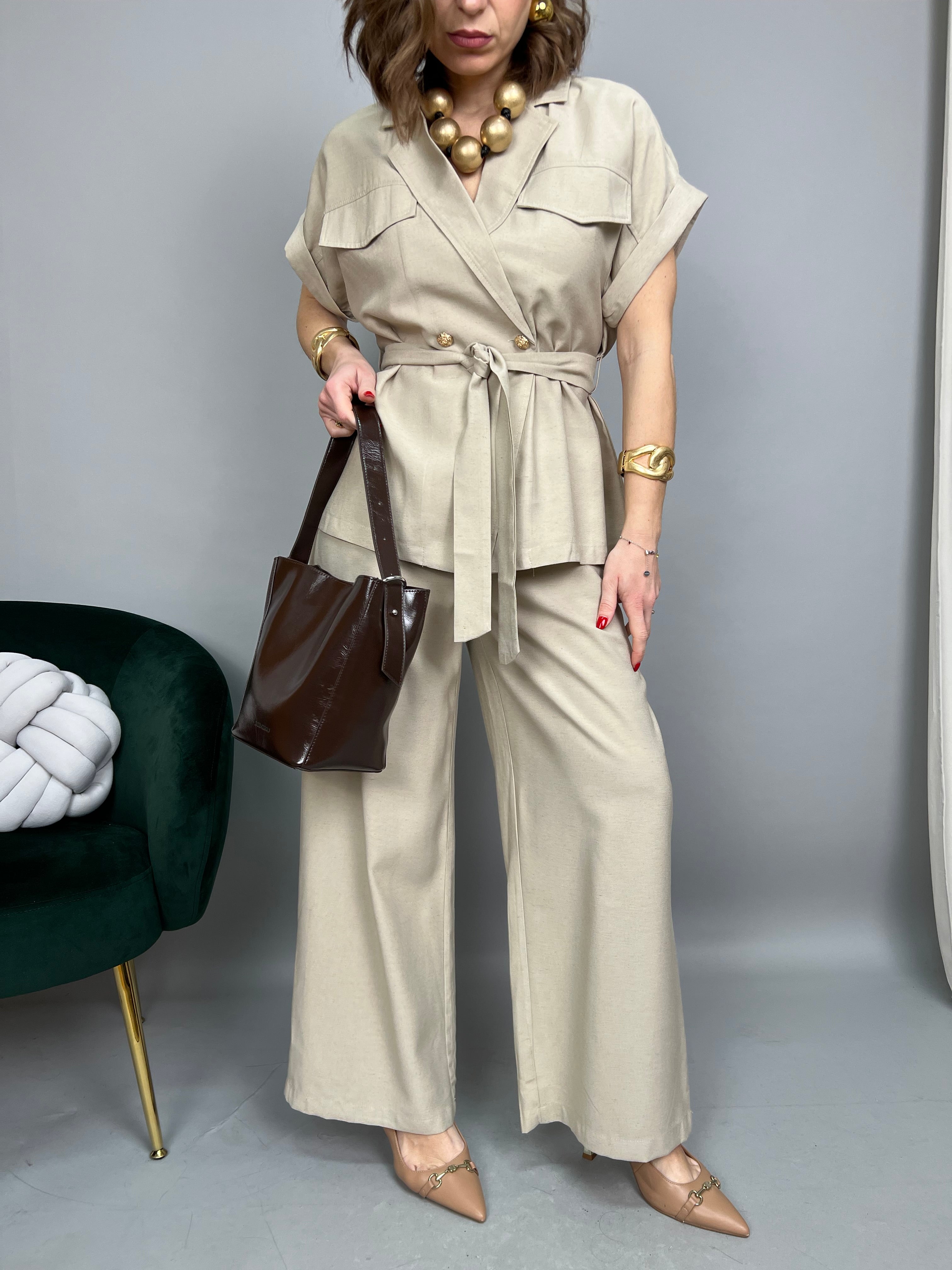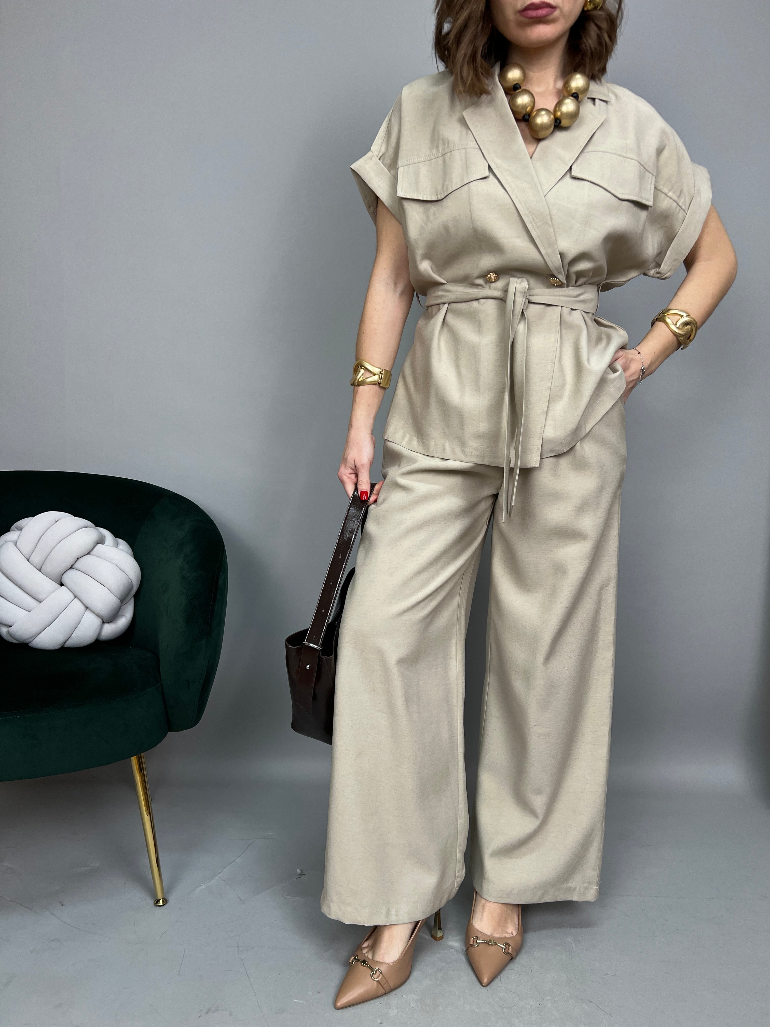 - Giacca a manica corta con risvolto e spalla scesa. Un modello con revers classico e chiusura doppiopetto con bottoncini lavorati dorati. Passanti in vita e cintura in tessuto coordinato per legarla in vita e renderla avvitata. Le tasche frontali sono solo estetiche. Non presenta fodera interna. Il tessuto rimane fresco. La vestibilità è comoda e regolare.
