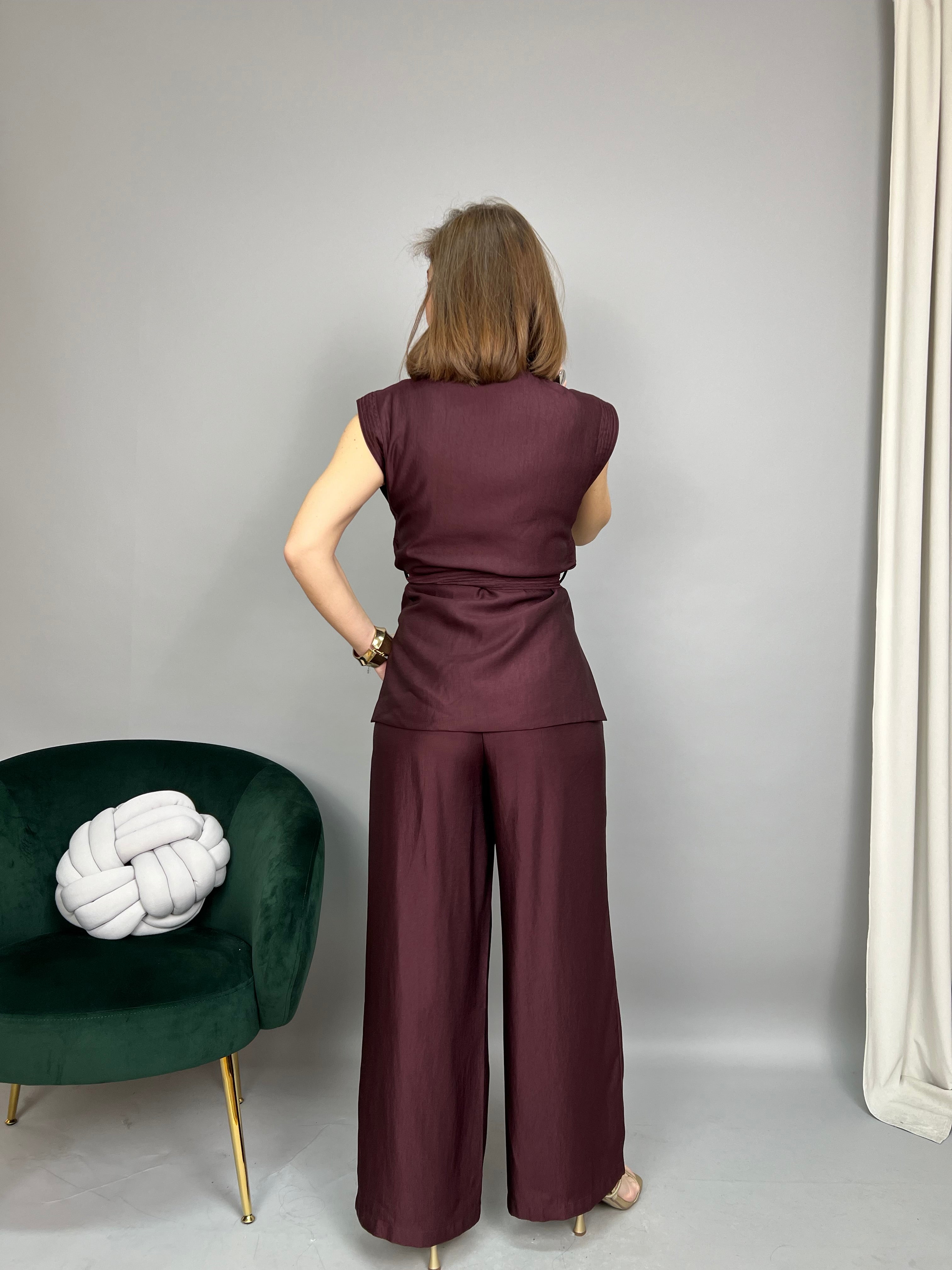 - Pantalone a palazzo con gamba dritta e comoda, con pinces frontali, chiusura zip e bottone, tasche laterali ed elastico sul retro. La vestibilità è regolare.