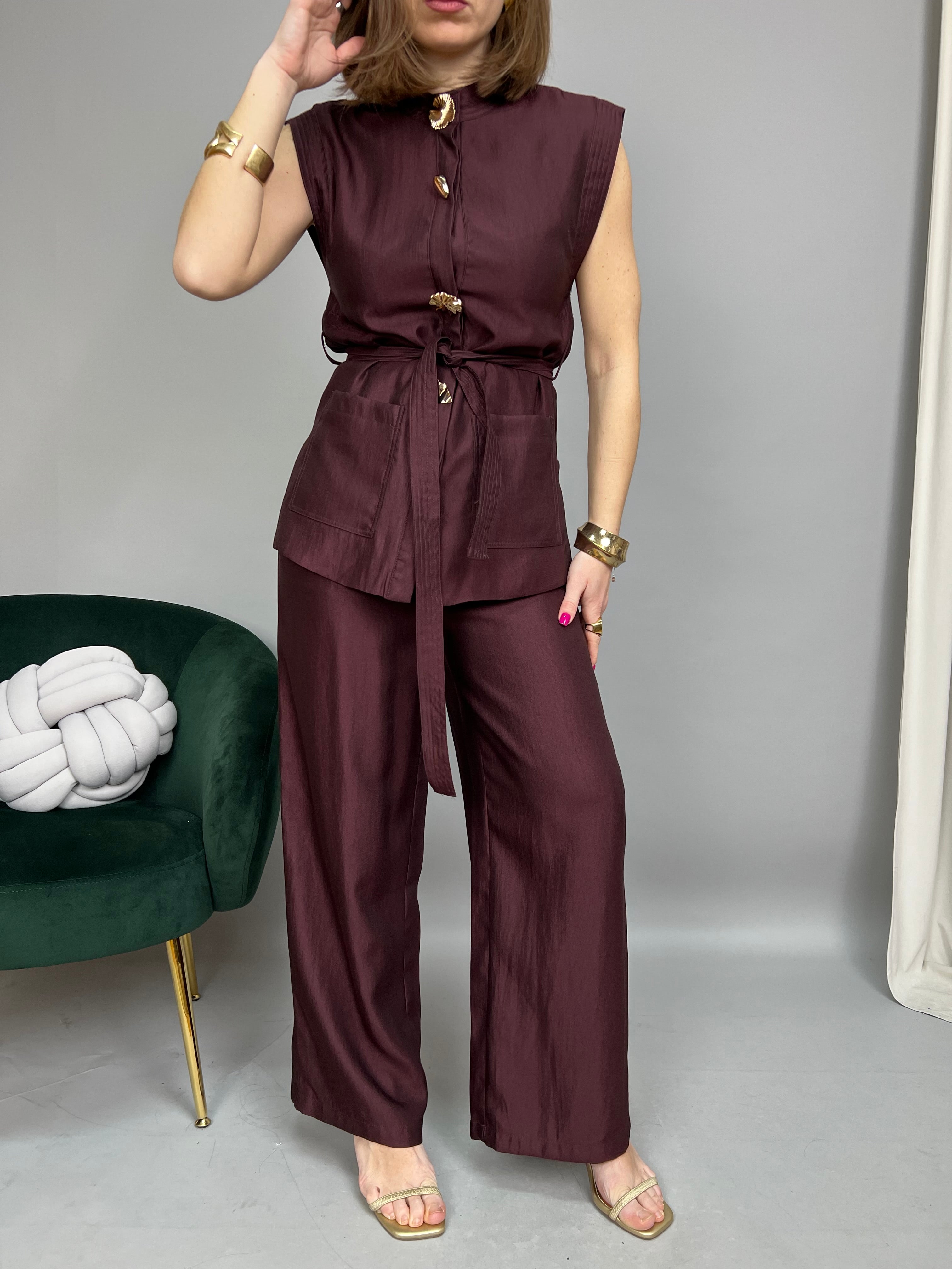 - Gilet con scollo tondo e chiusura frontale con bottoncini interni, impreziosita da applicazione di bottoni dorati di forme diverse. Il modello presenta spacchetti laterali, tasche frontali, passanti in vita e cintura in tessuto coordinato per legarla in vita e renderlo avvitato. Internamente è foderato. La vestibilità è regolare.