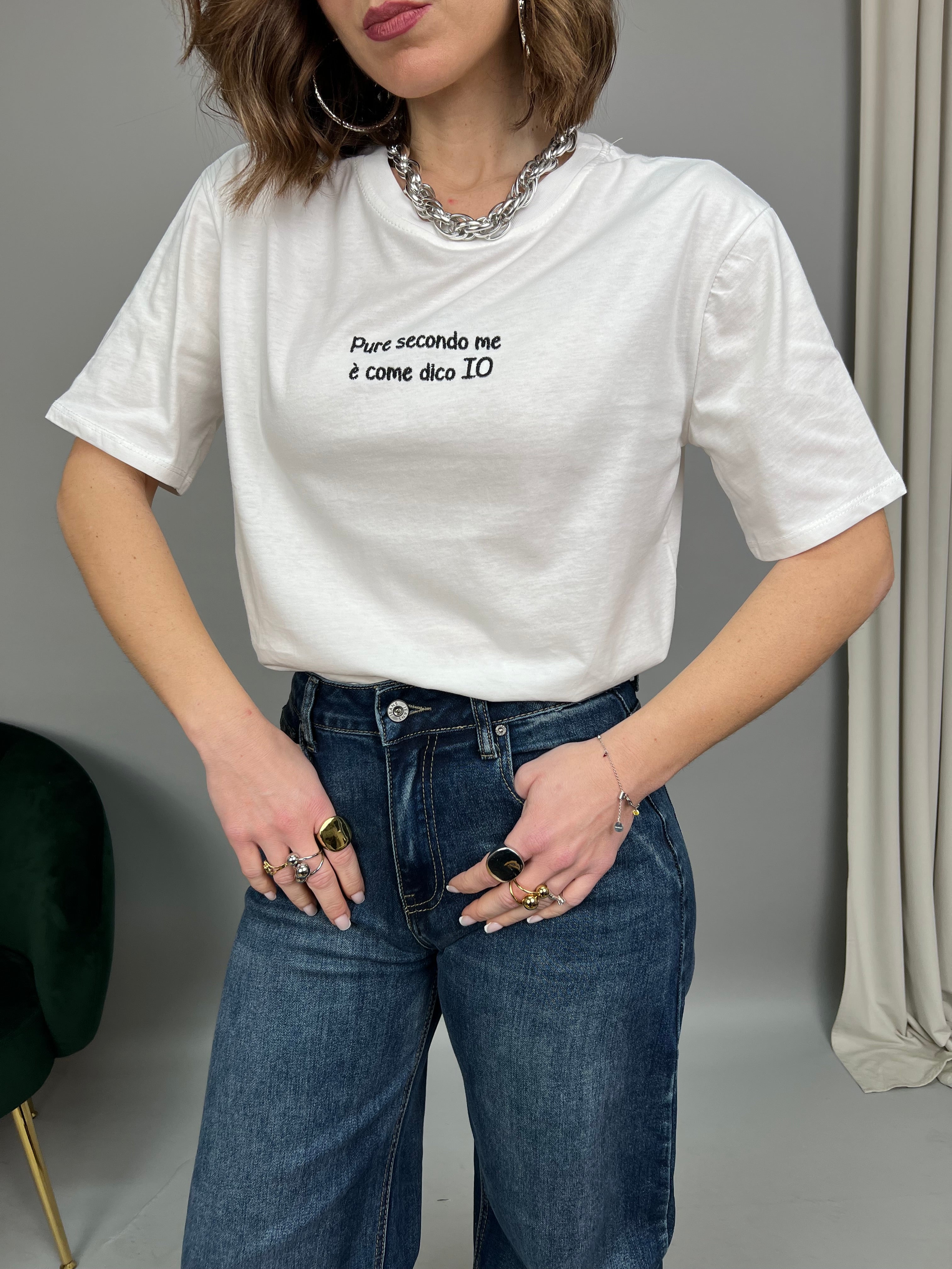 T-shirt in cotone con scollo tondo e manica corta. Presenta una scritta ricamata frontale a contrasto. La vestibilità è comoda e regolare.