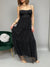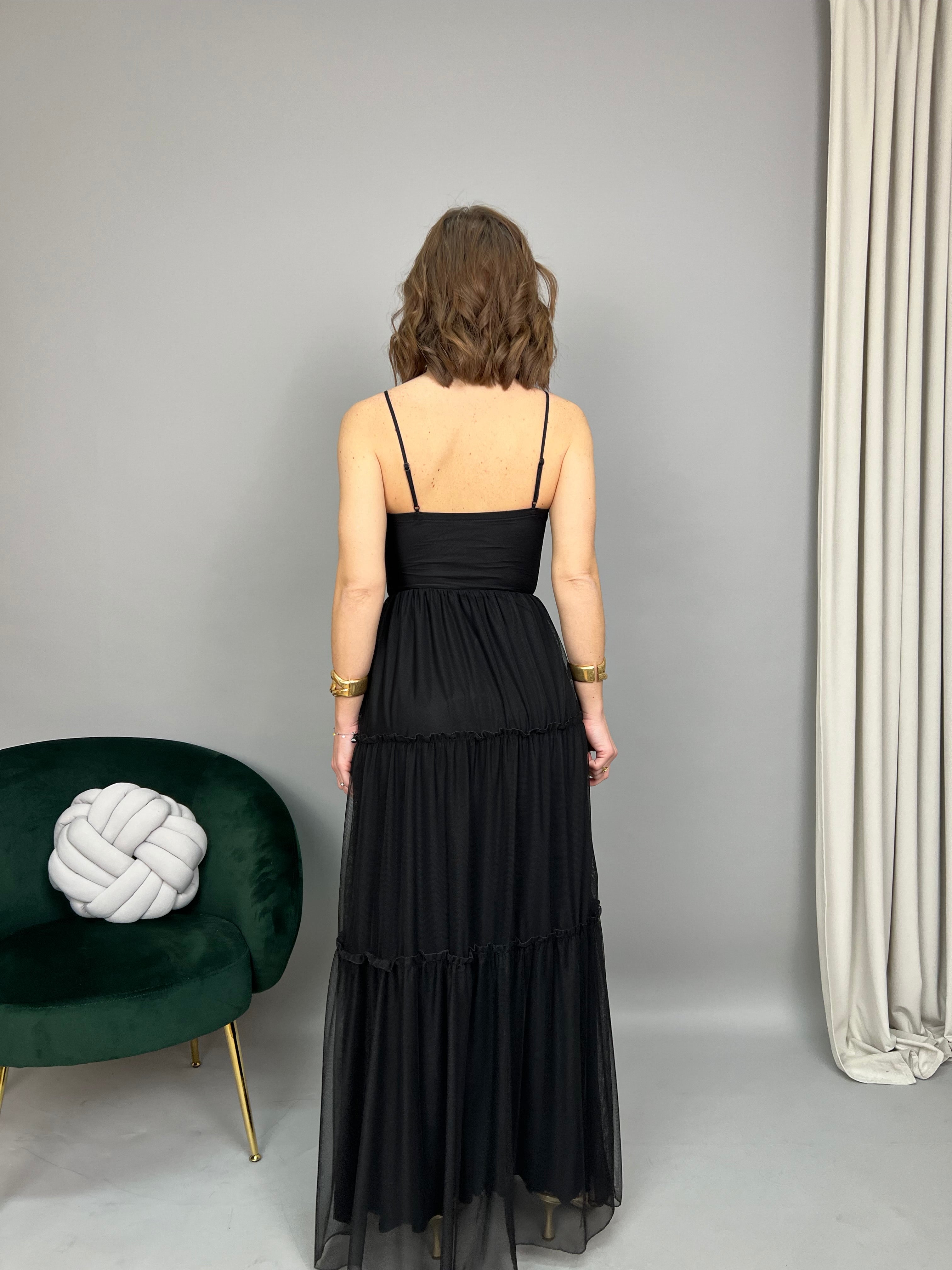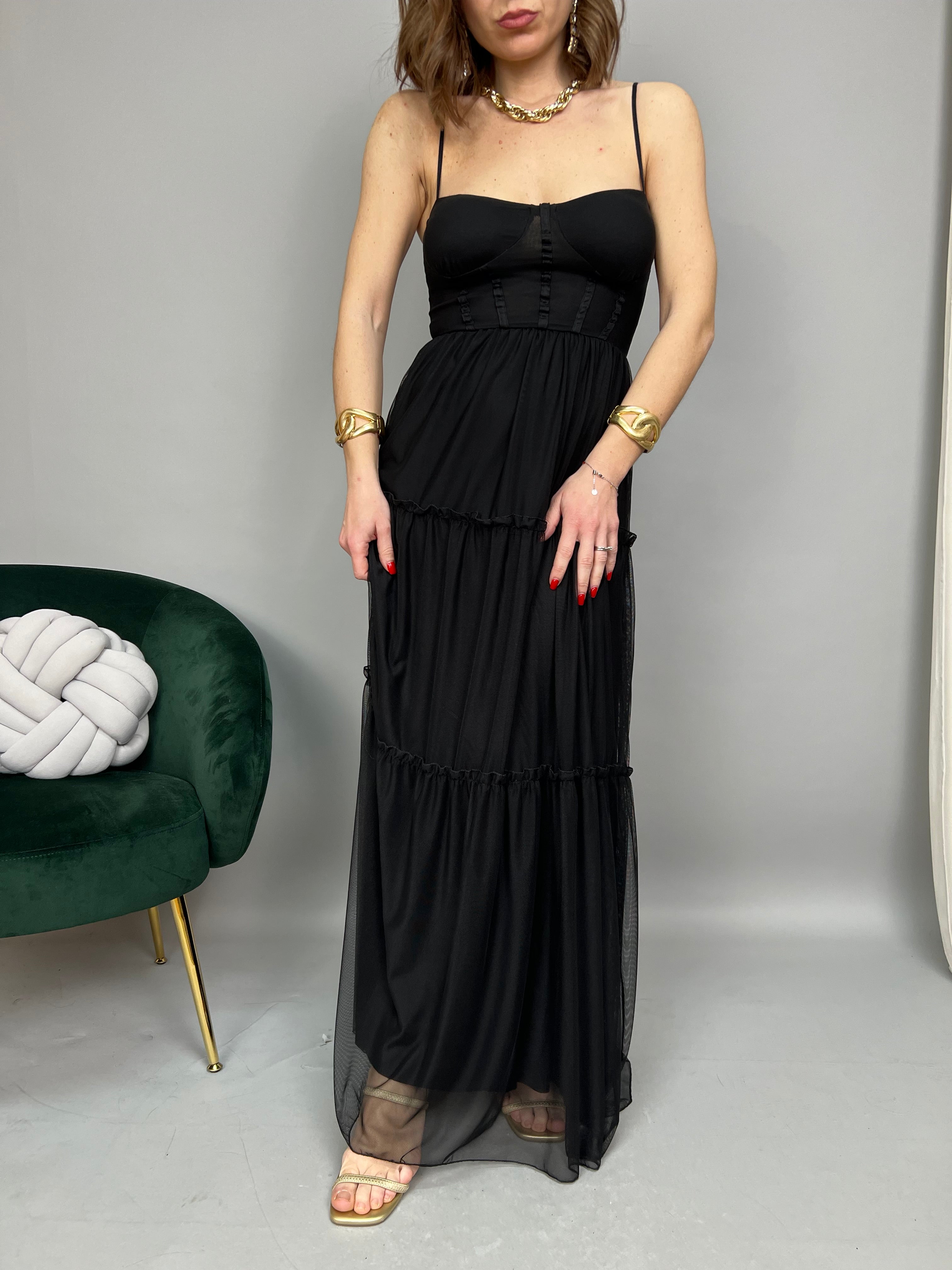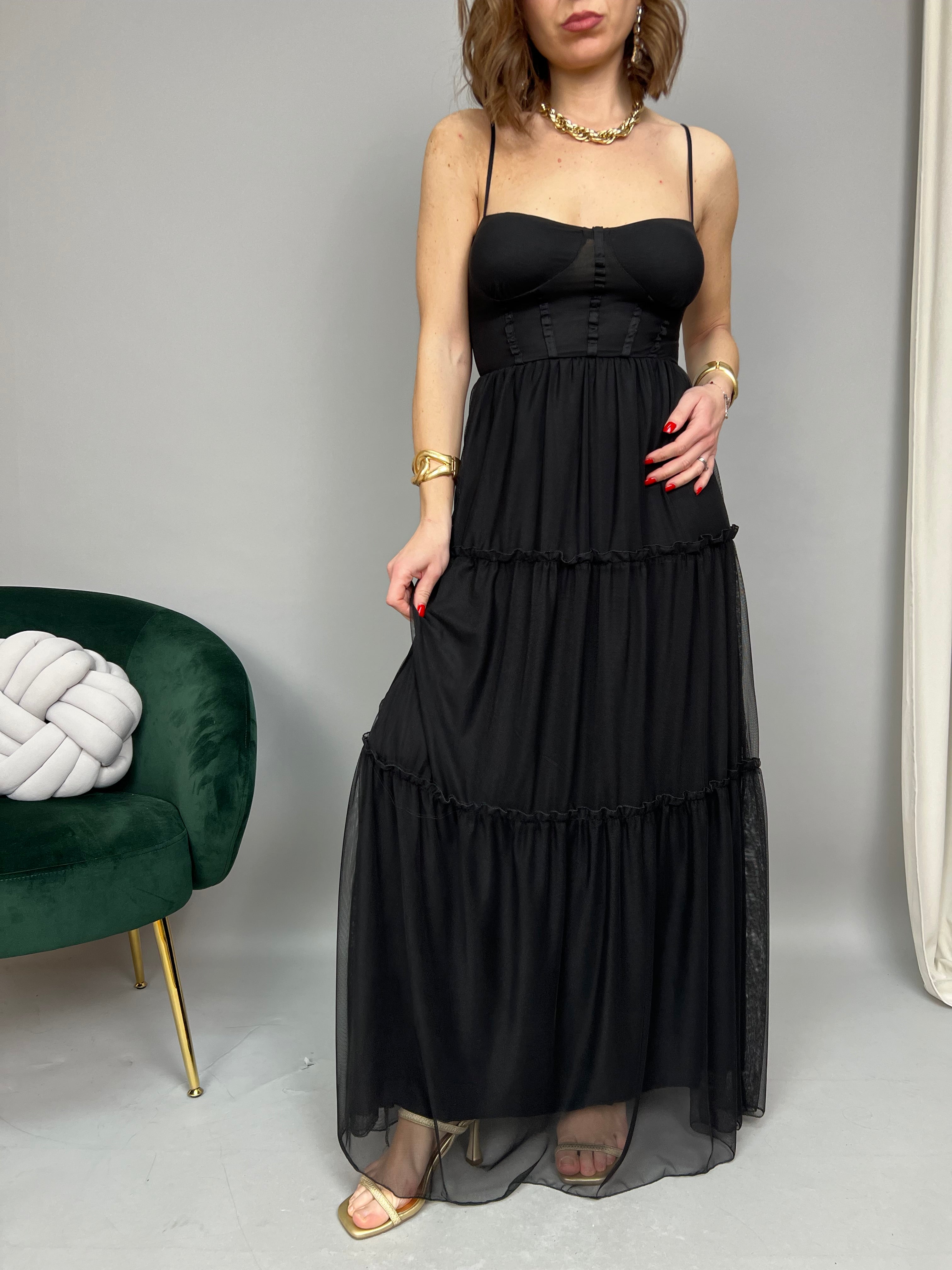 Vestito lungo in tulle, con scollo a cuore e bretelline regolabili. Presenta un corpetto con cuciture verticali e coppe sagomate integrate. Taglio in vita con elastico. Gonna lunga a balze con finiture ondulate. Il modello ha una linea svasata e presenta una sottogonna in tessuto morbido. La vestibilità è comoda e regolare.