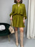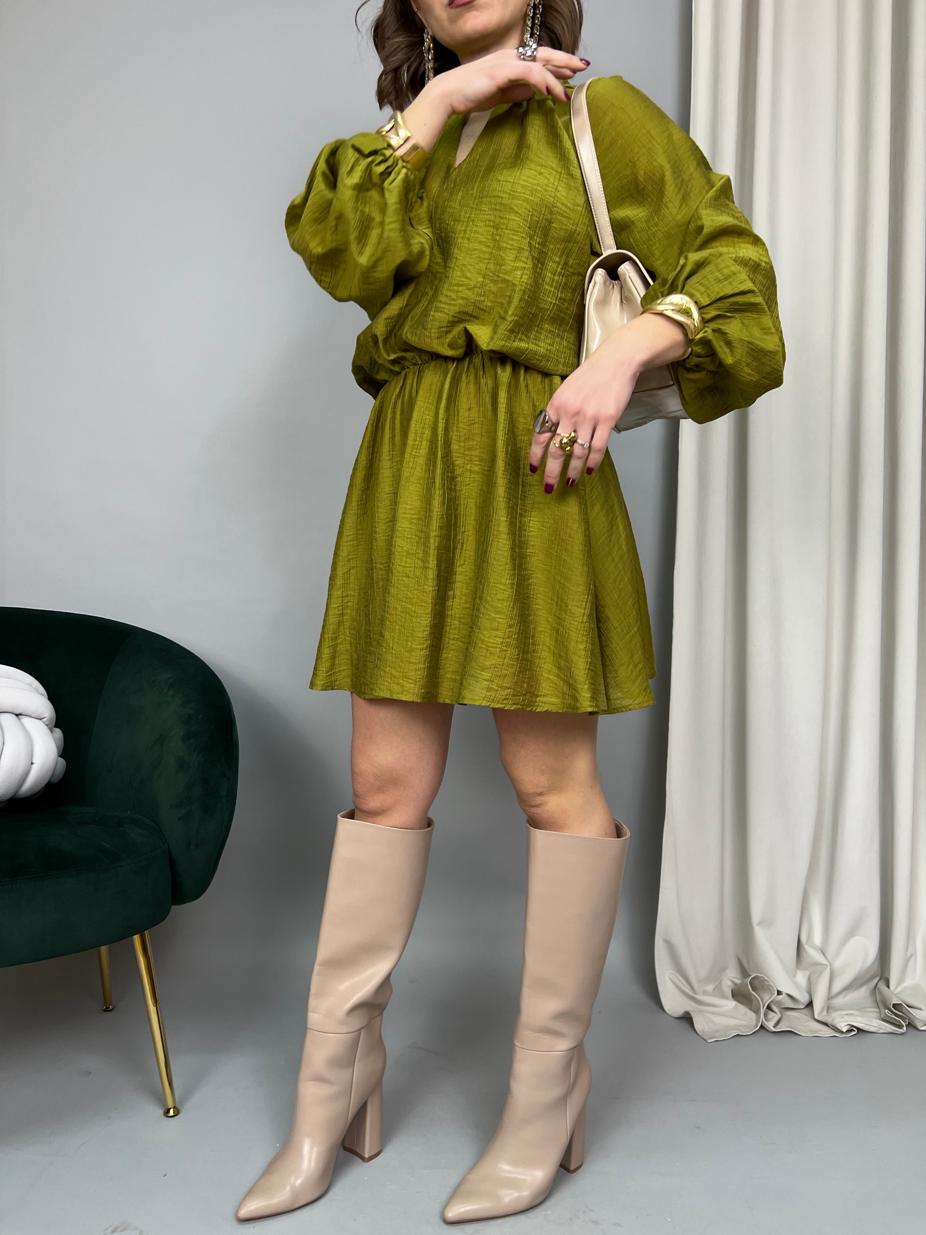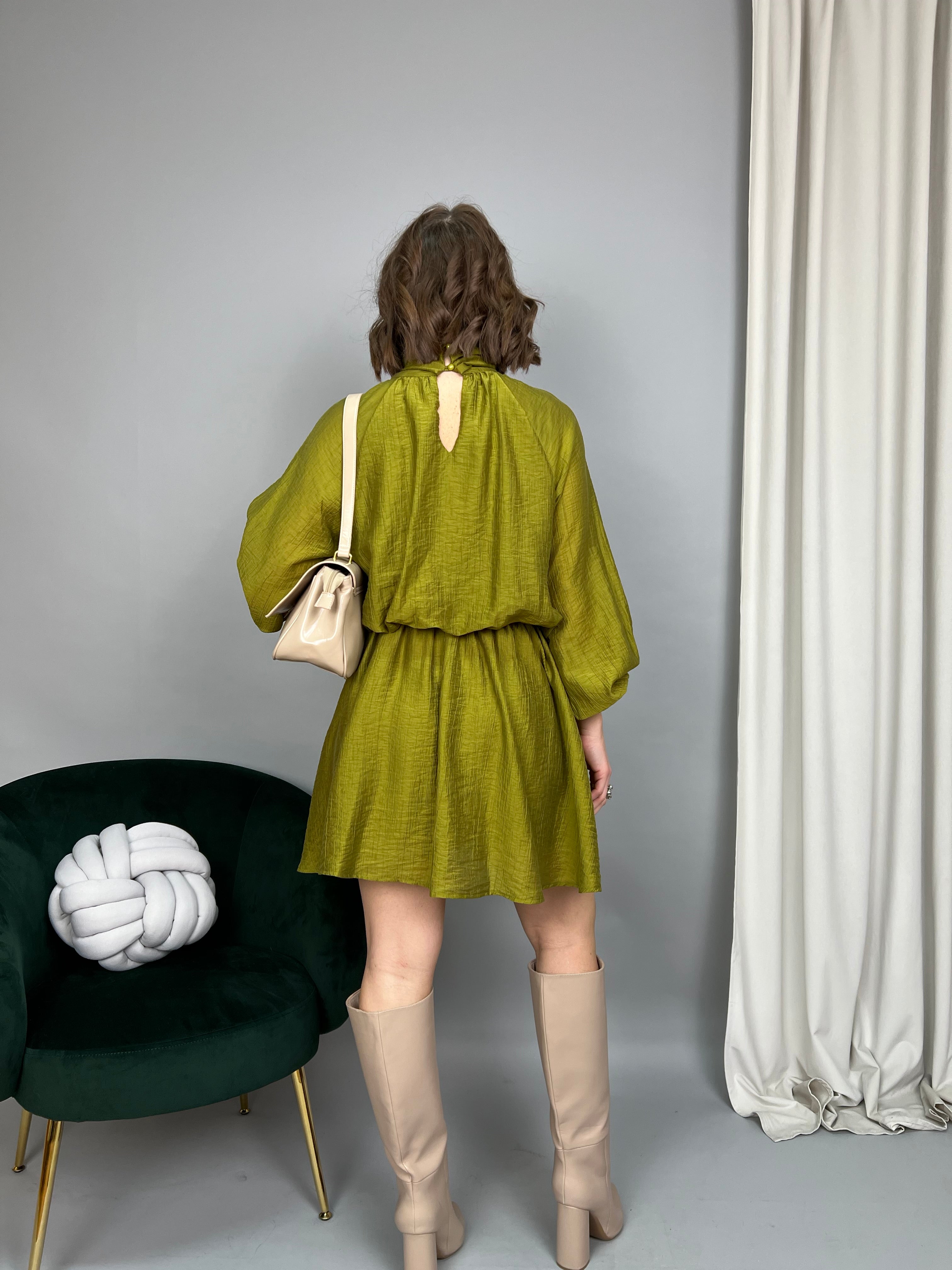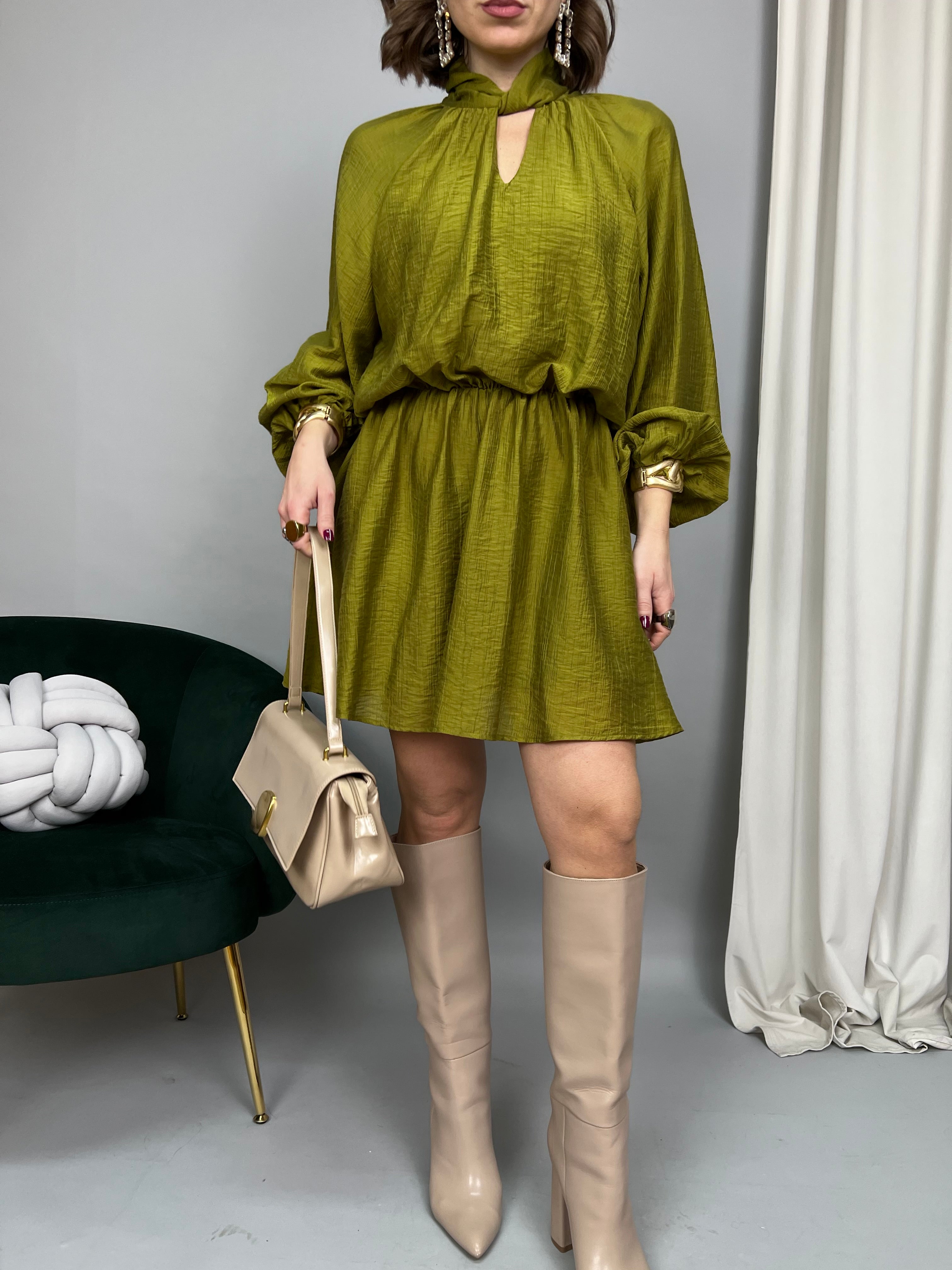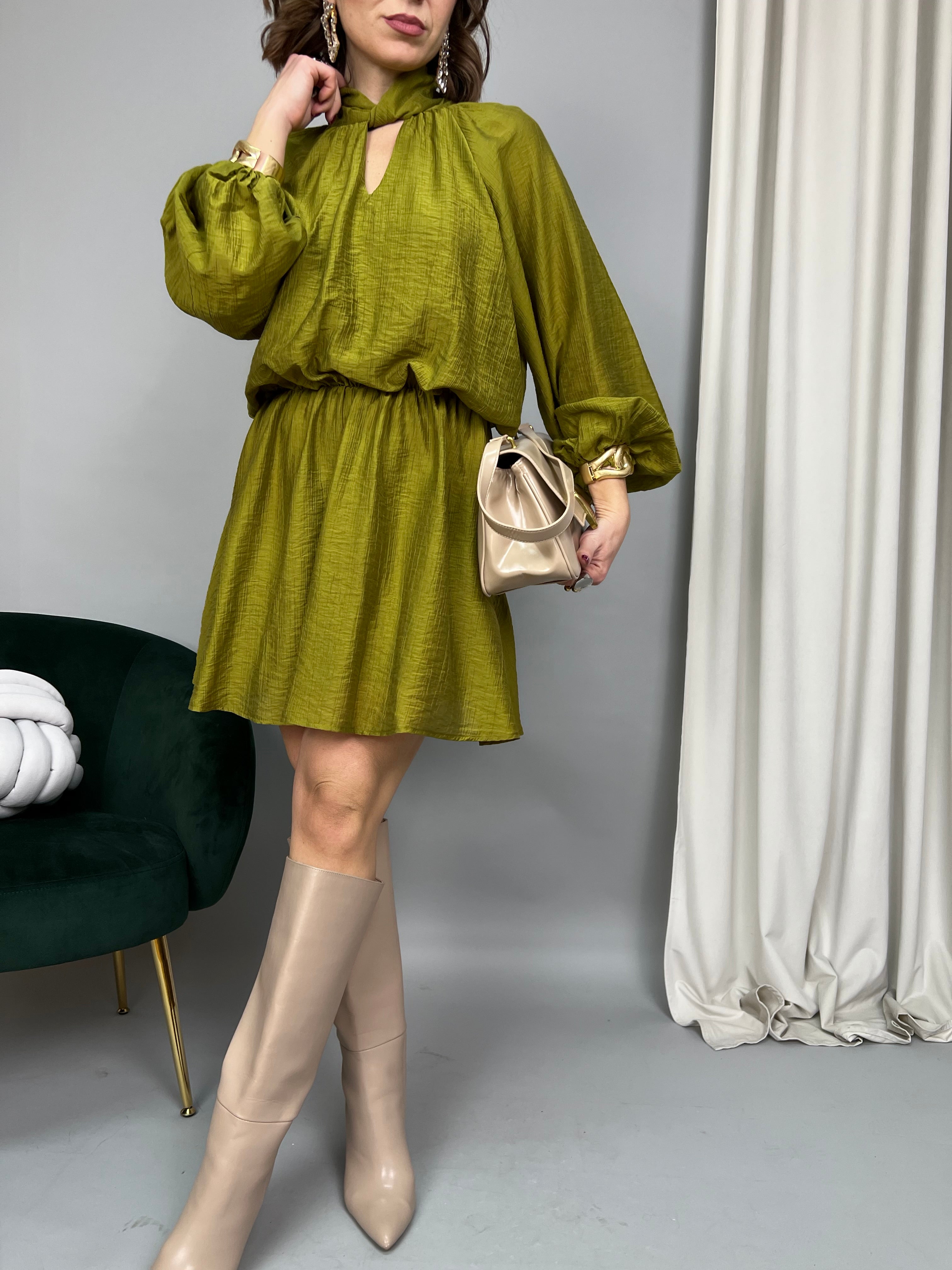 Vestito in tessuto leggero. Sulla parte superiore è un modello "Blusa" dalla vestibilità ampia, maniche raglan con polsini elasticizzati. Lo scollo è annodato e si chiude con bottoncini sul retro. Vita elasticizzata con arricciatura. Nella parte inferiore la gonna è svasata e scende morbida. Presenta una fodera interna.