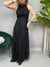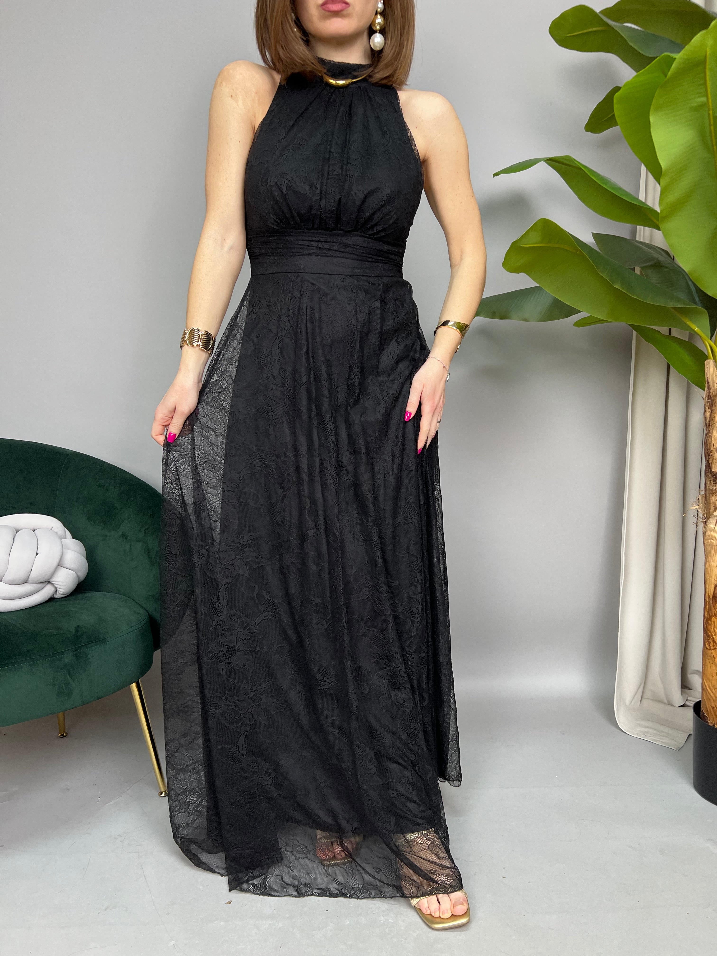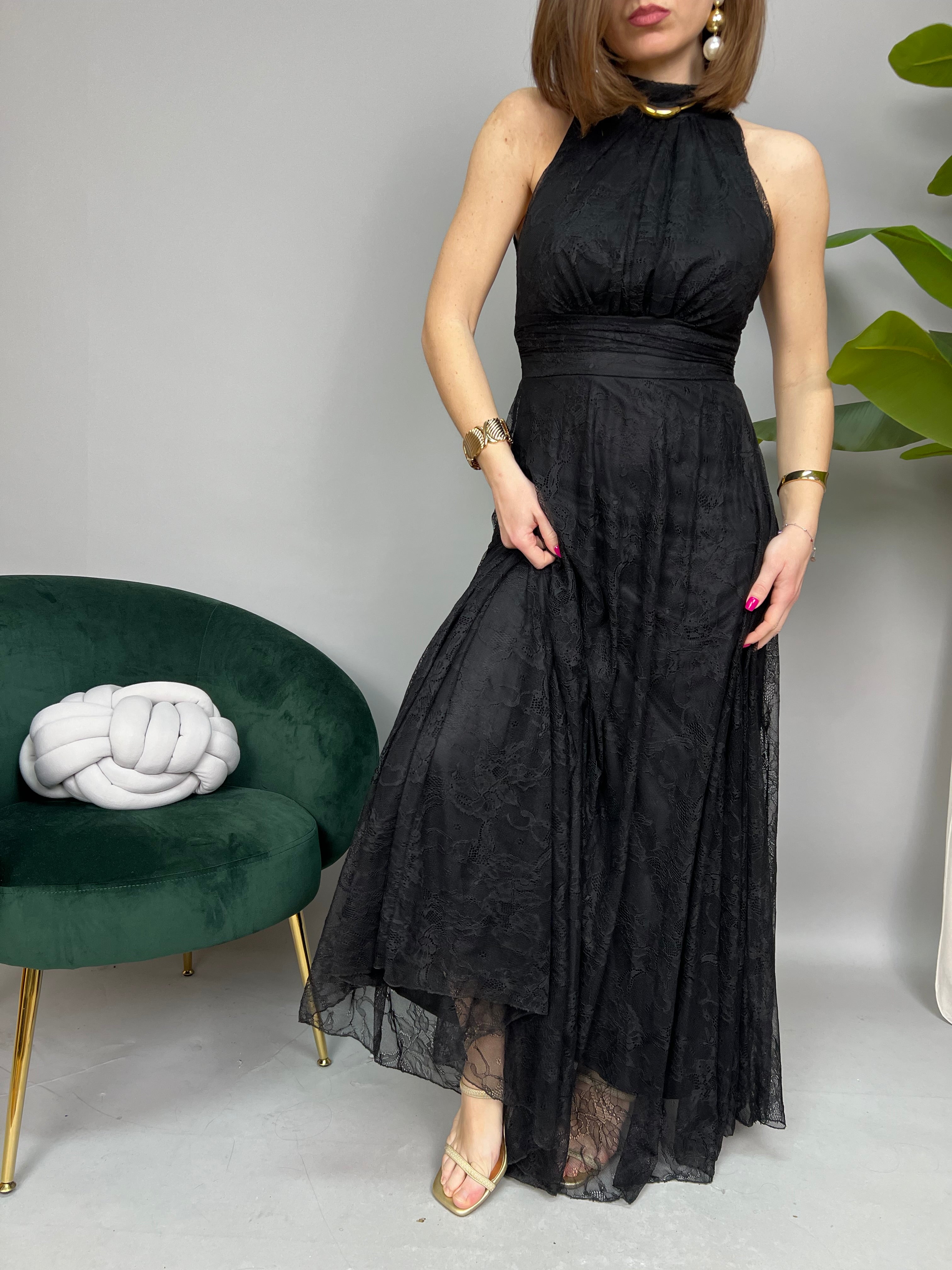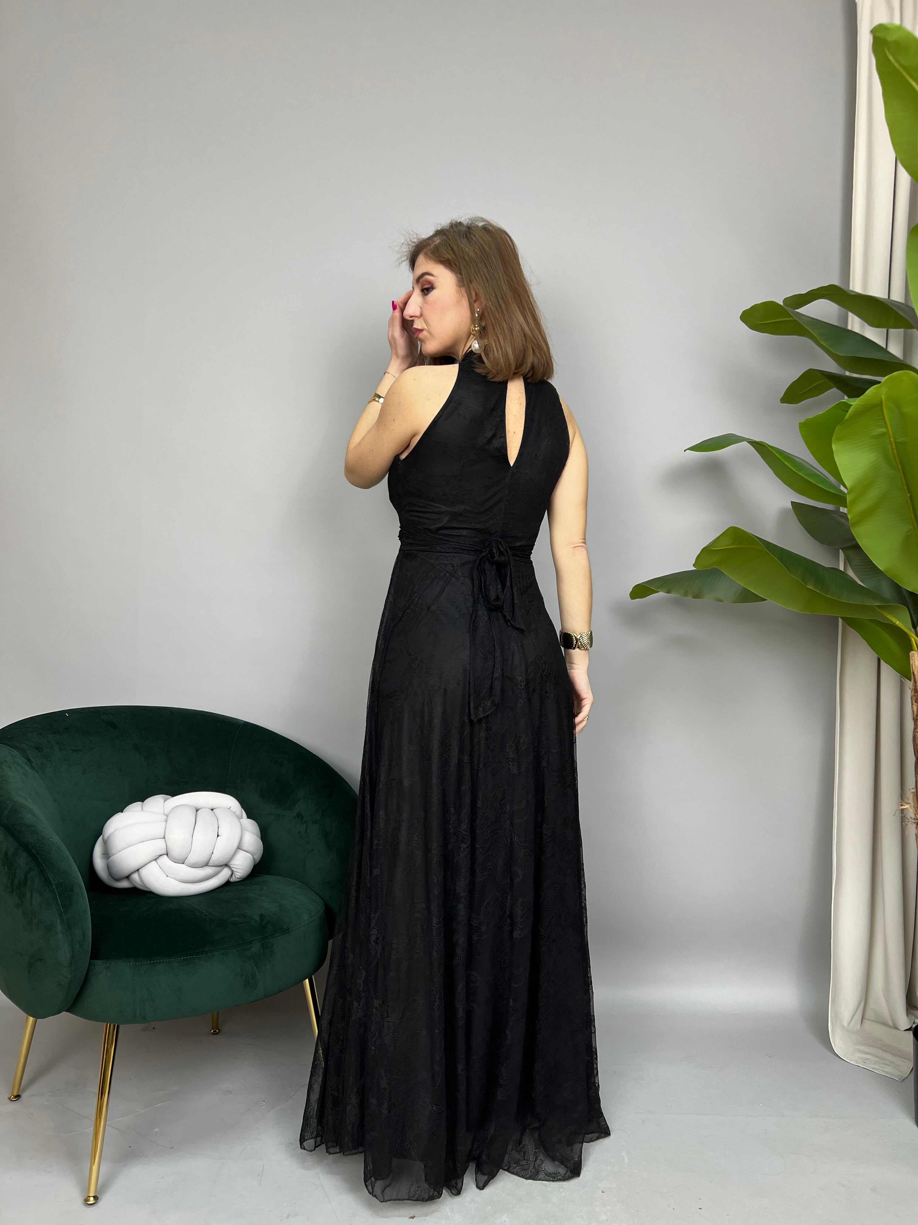 Vestito lungo in pizzo, smanicato con scollatura all'americana e chiusura con bottoncini sul retro. Presenta una fusciacca in pizzo sul retro per essere annodata. Il modello è internamente foderato con anche una sottogonna lunga in tessuto morbido. La vestibilità è regolare.