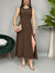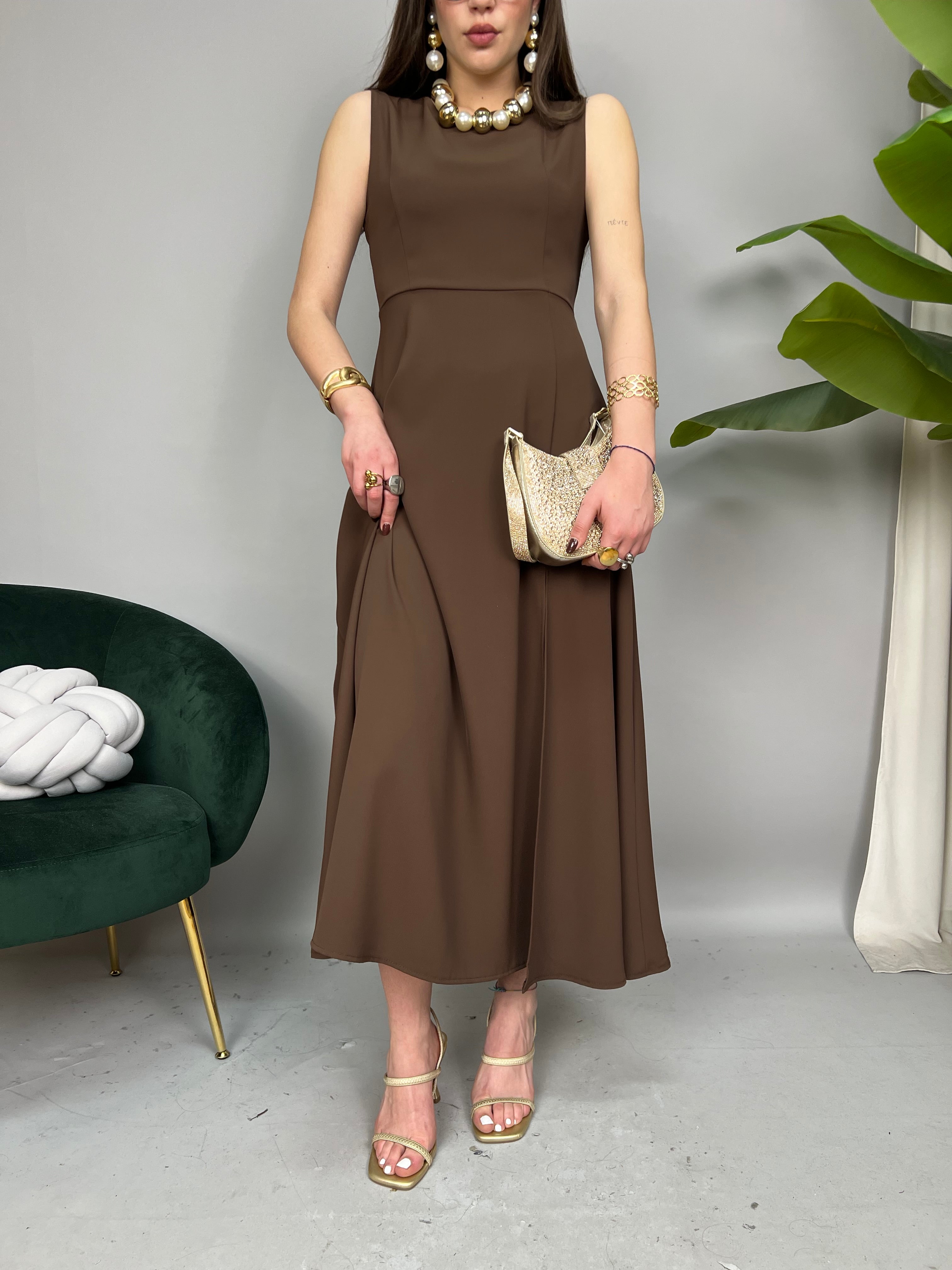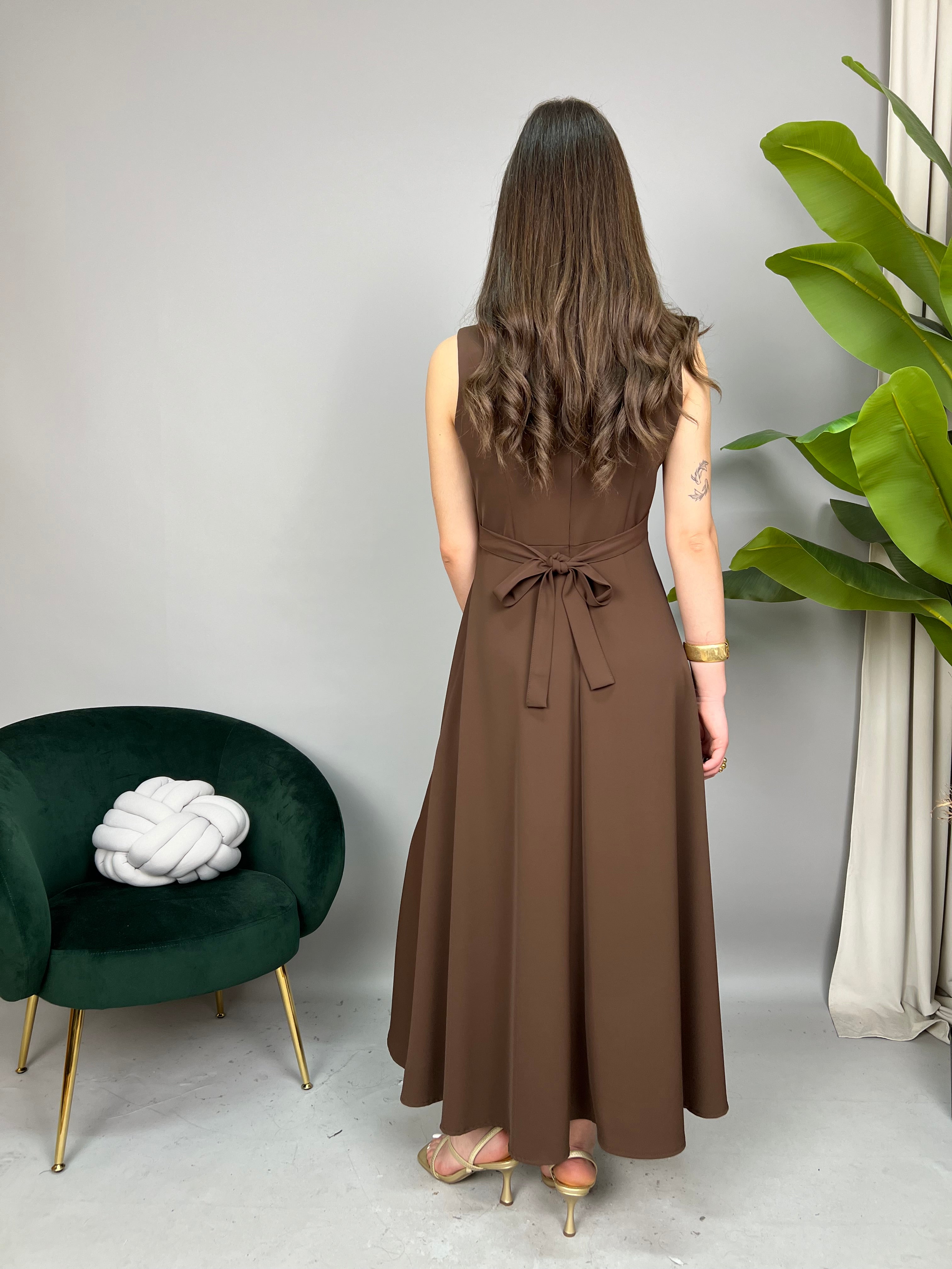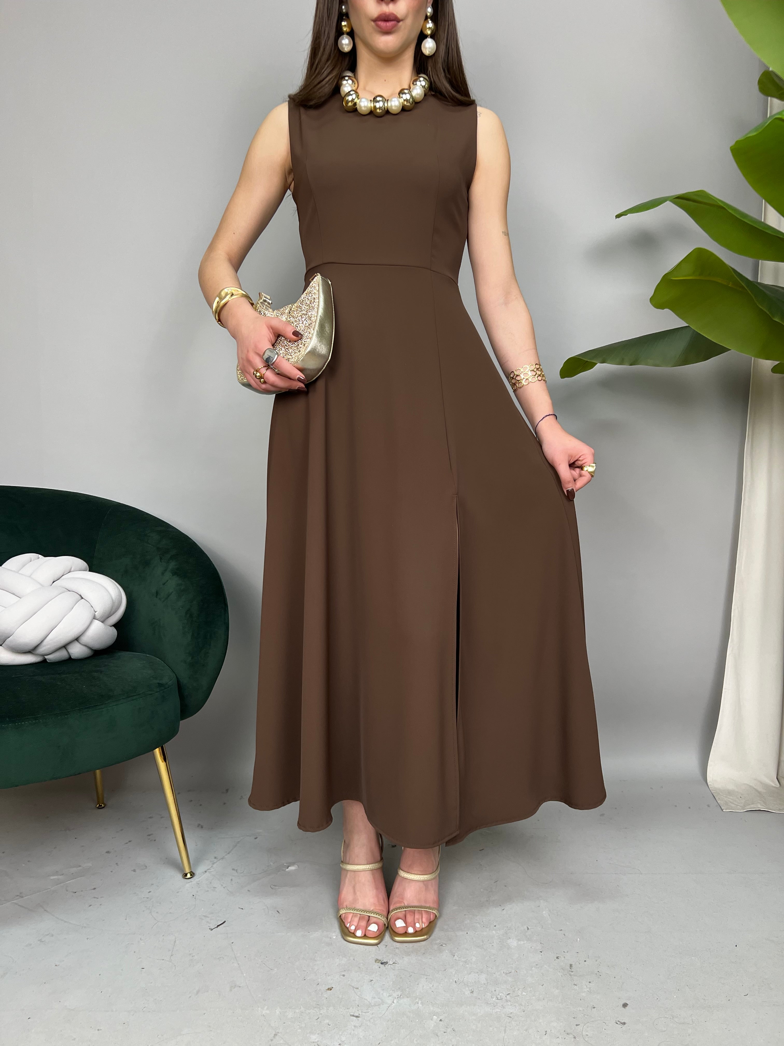 Vestito lungo smanicato con scollo tondo e chiusura a zip sul retro. Taglio in vita con fusciacche da annodare, per rendere il modello più avvitato. La gonna ha un taglio morbido e svasato con uno spacco frontale di lato. La vestibilità è regolare.