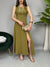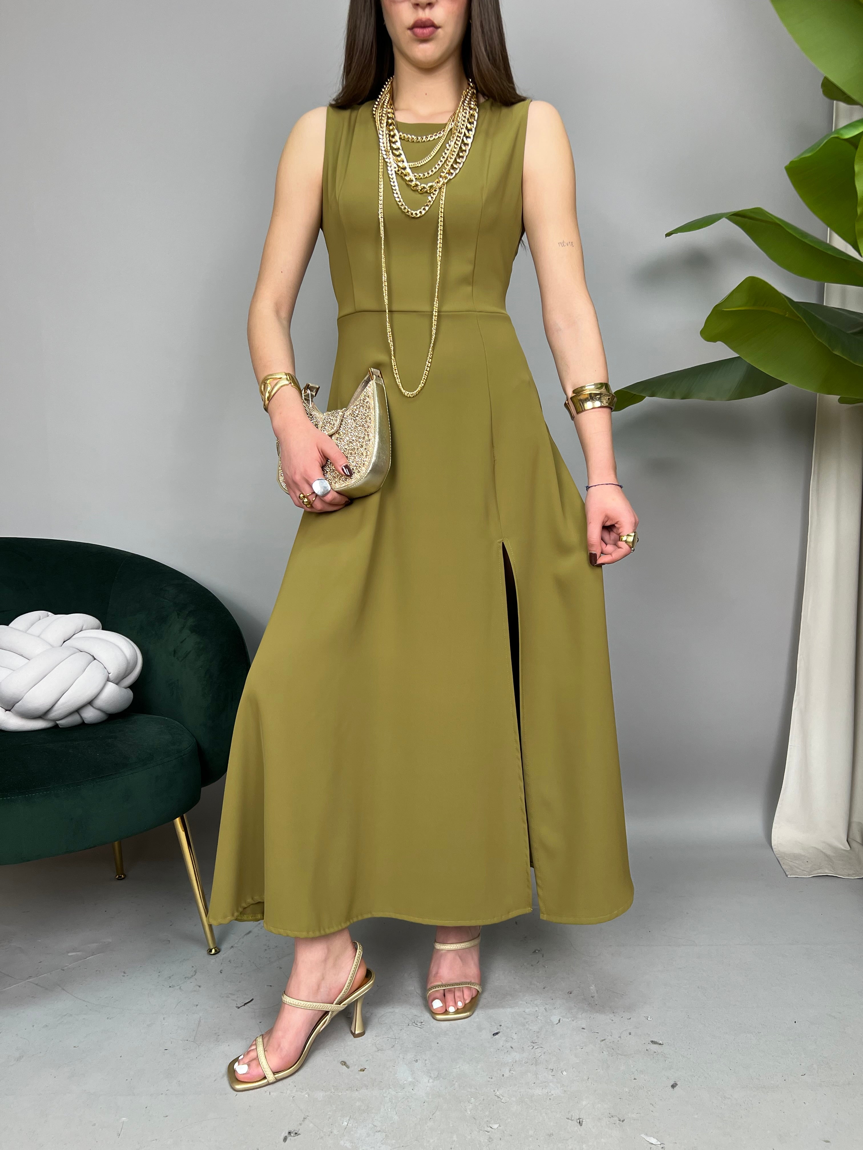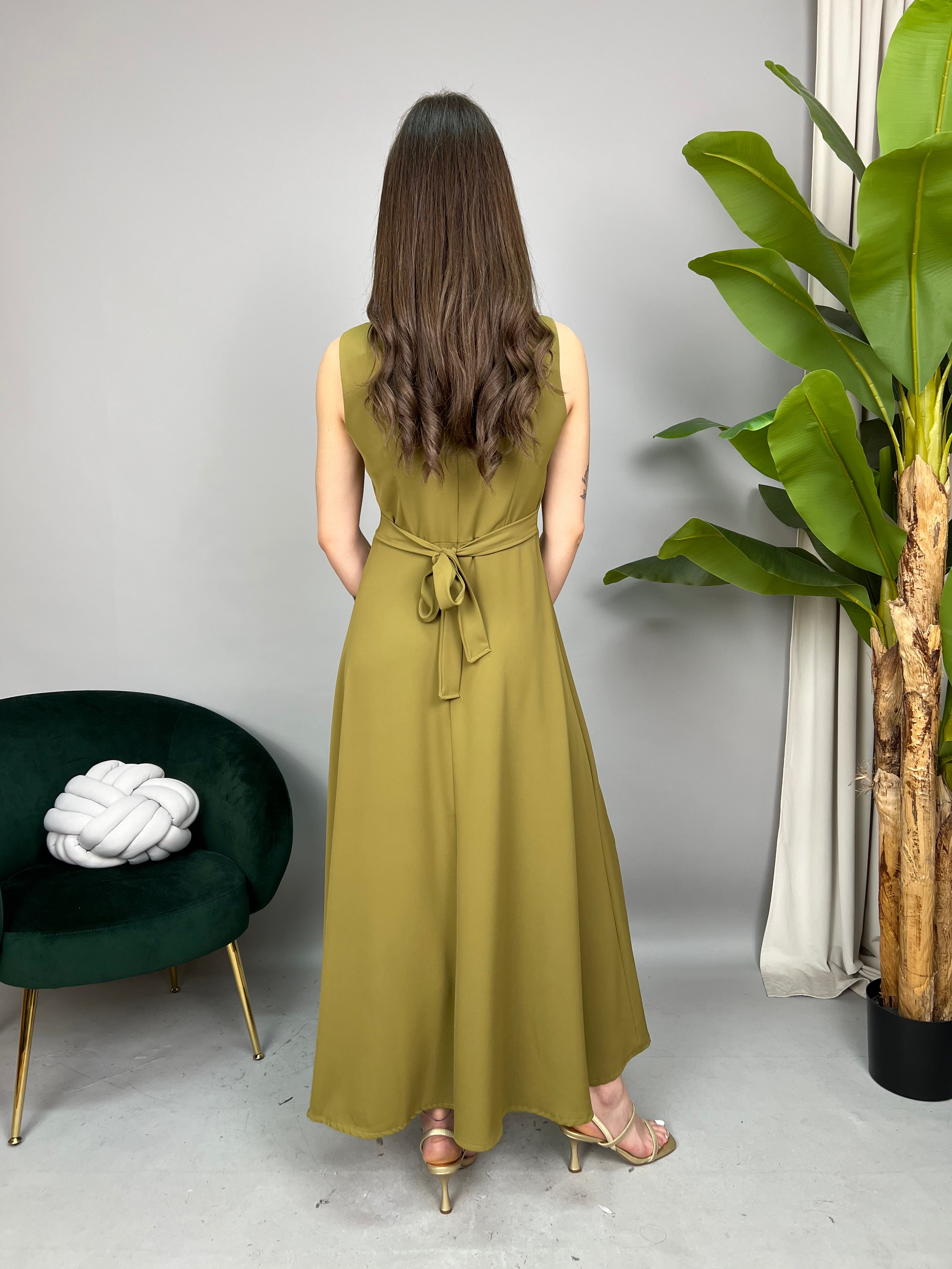 Vestito lungo smanicato con scollo tondo e chiusura a zip sul retro. Taglio in vita con fusciacche da annodare, per rendere il modello più avvitato. La gonna ha un taglio morbido e svasato con uno spacco frontale di lato. La vestibilità è regolare.