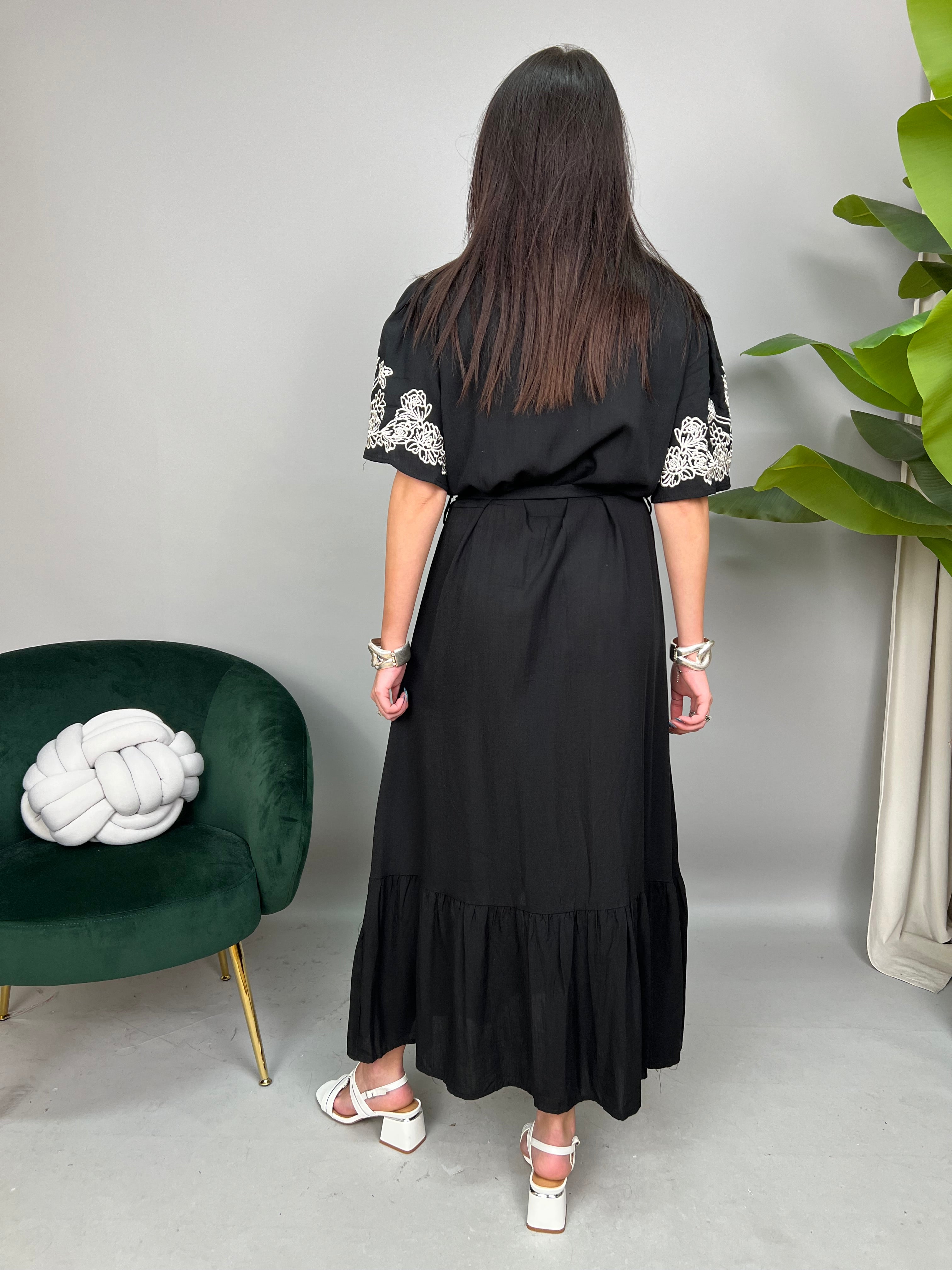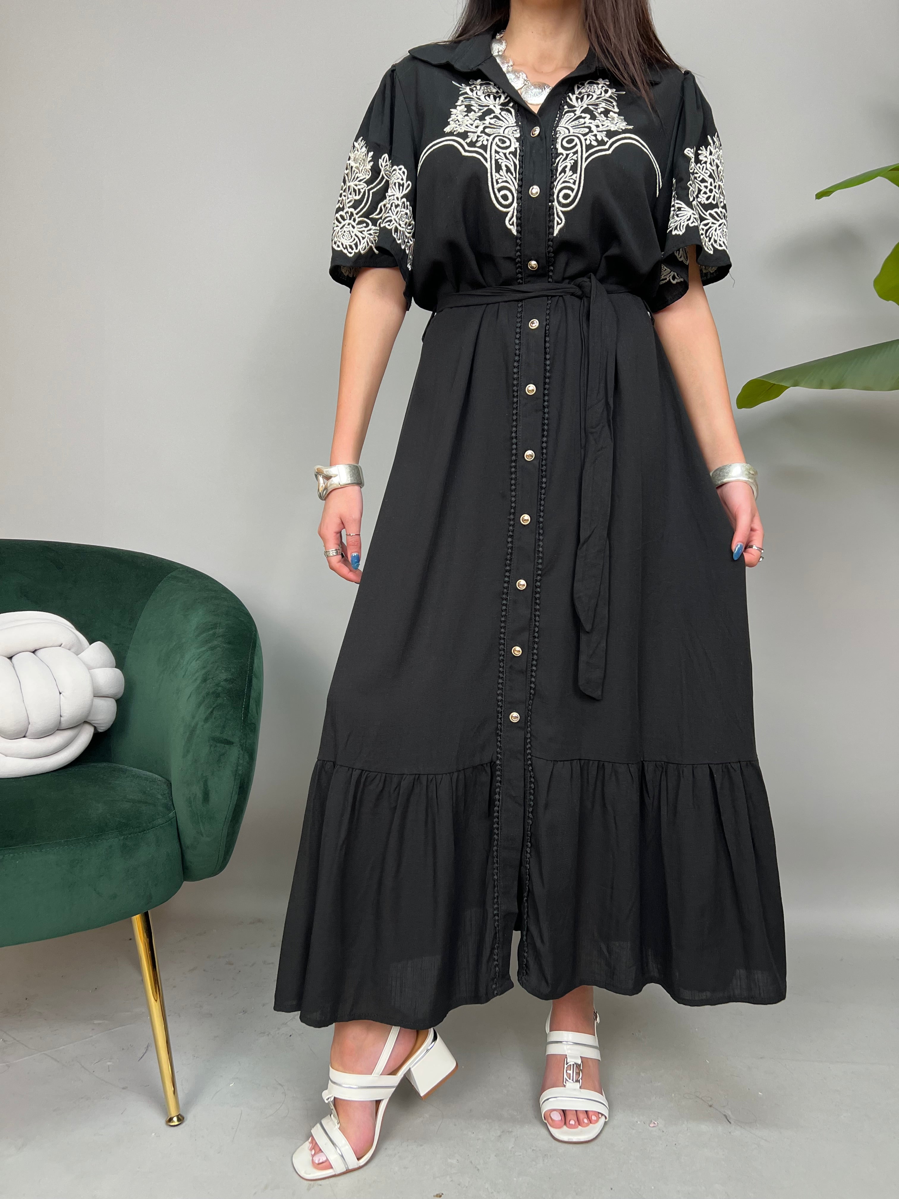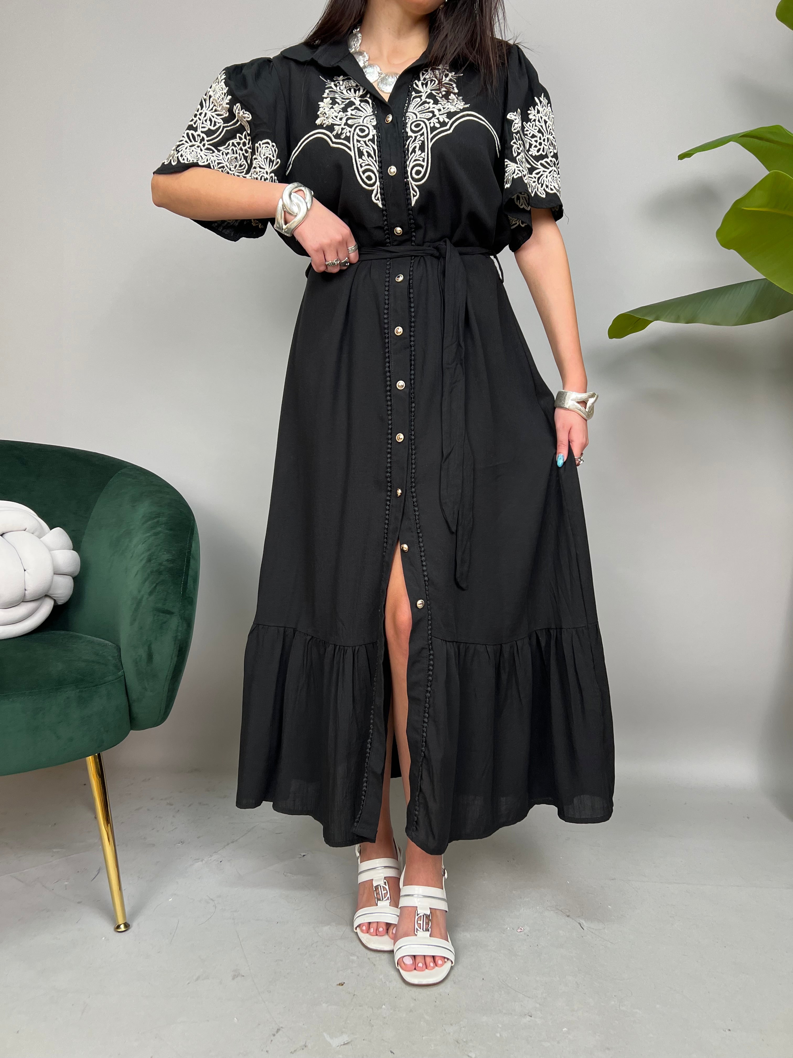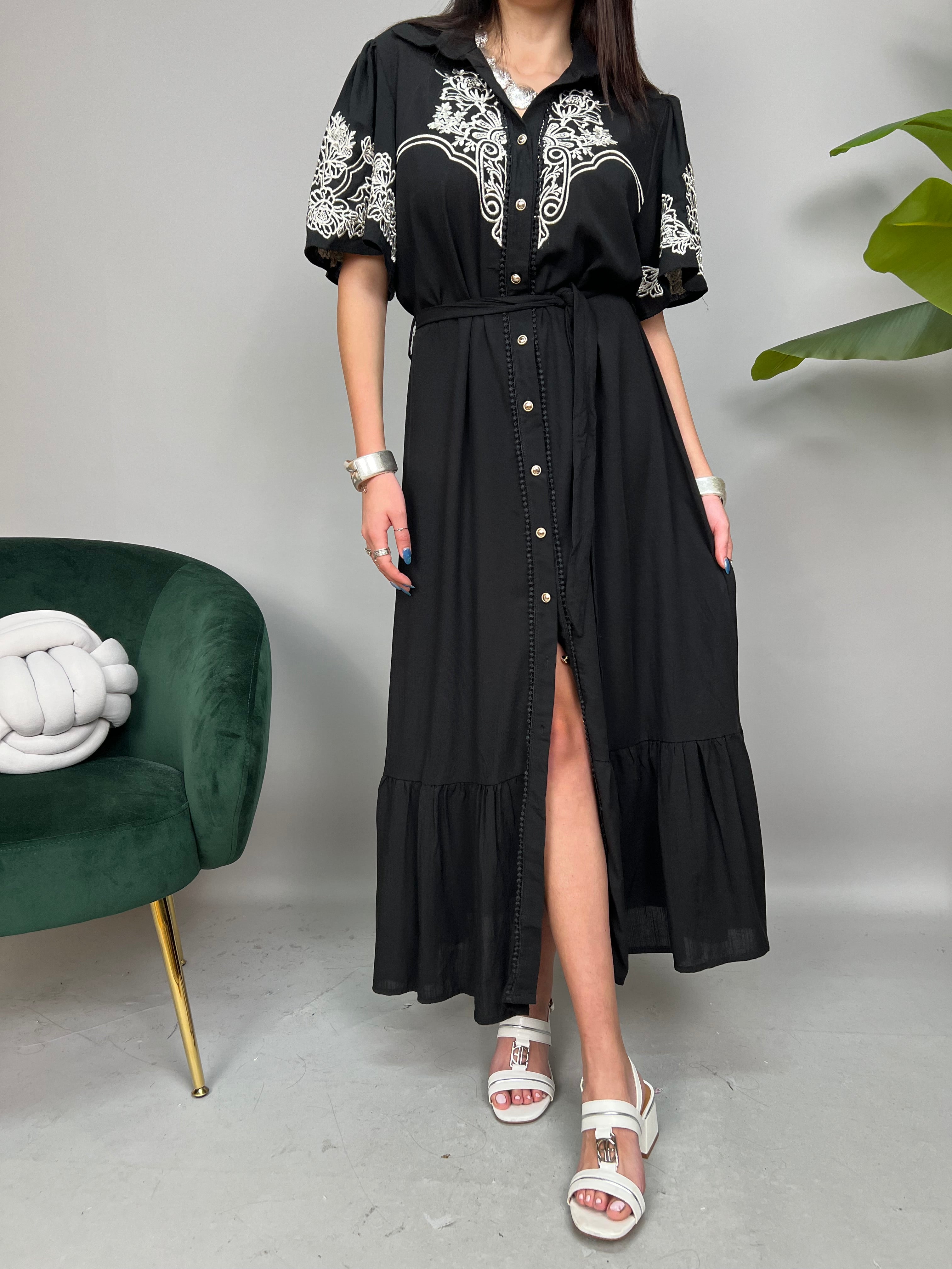 Vestito lungo modello Chemisier con manica corta ampia, chiusura frontale con bottoncini dorati. Impreziosito da ricami a contrasto sul busto e sulle maniche. La gonna presenta una balza sul fondo, passanti in vita e una fusciacca dello stesso tessuto da annodare. La vestibilità è comoda e regolare.