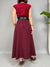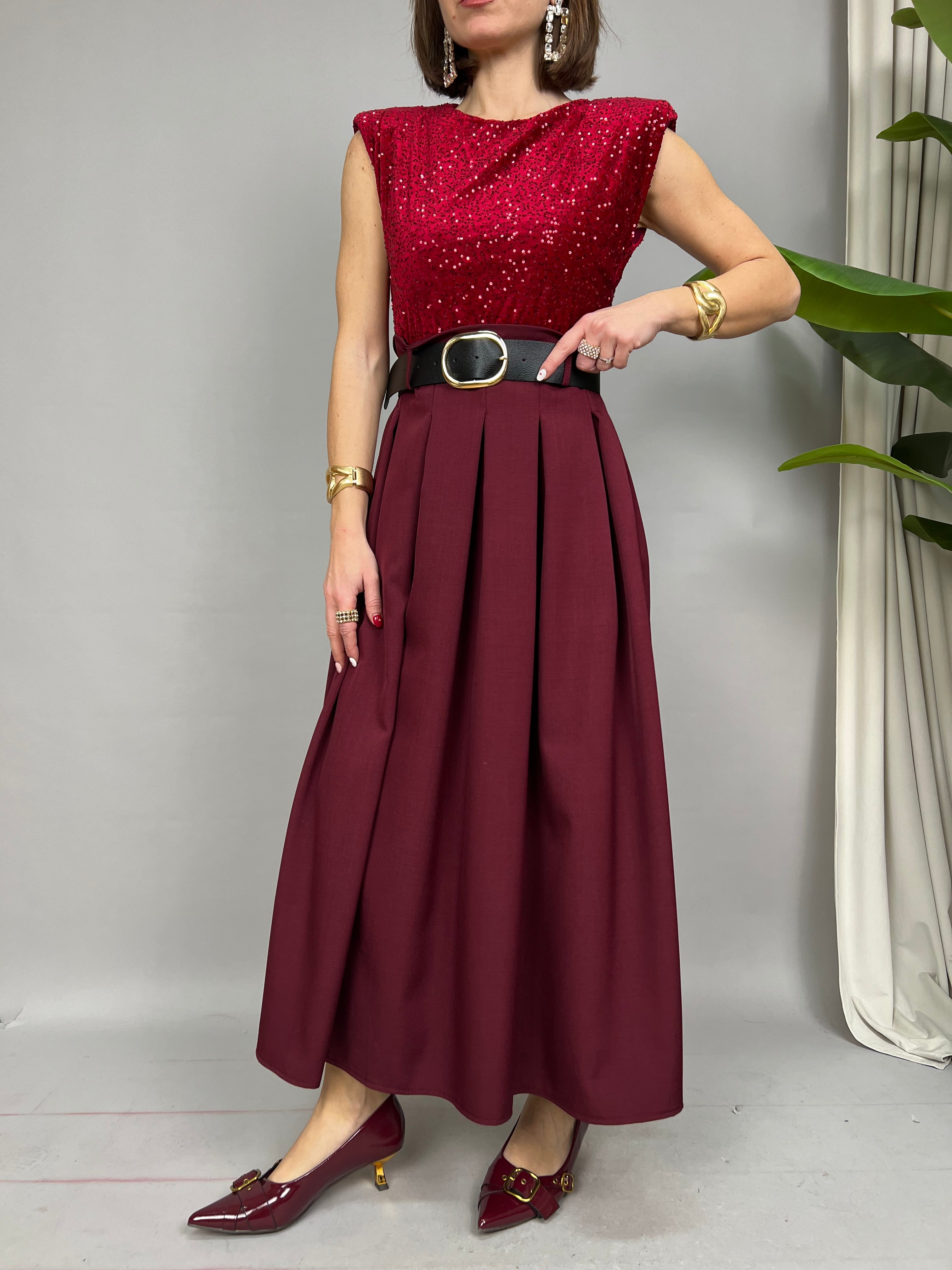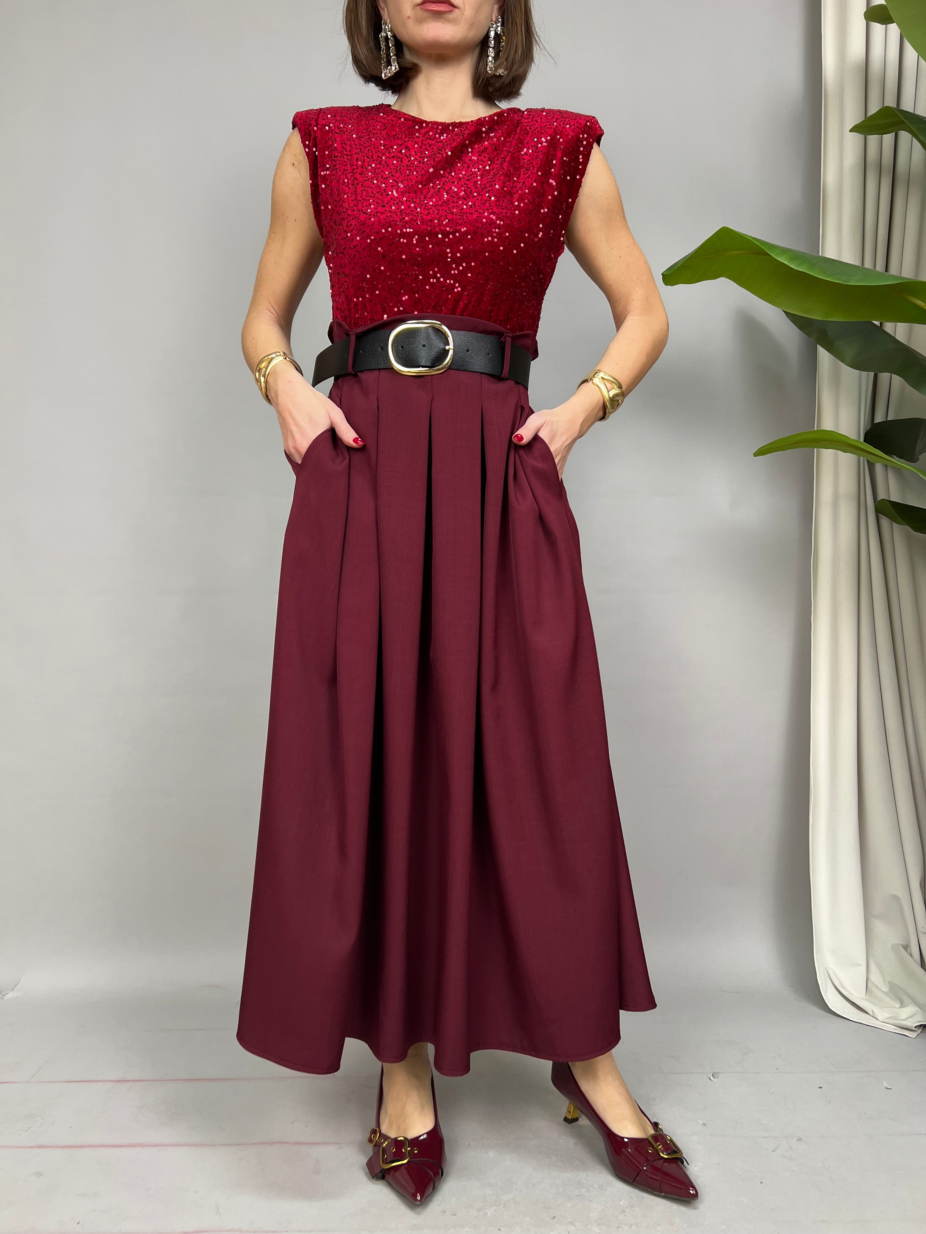 Vestito "effetto doppio" con parte superiore smanicata a spalla scesa in velluto impreziosito da una lavorazione in paillettes tono su tono. Dalla vita parte una gonna lunga "a Corolla" con elastico sul retro, tasche laterali e cintura inclusa.