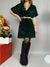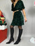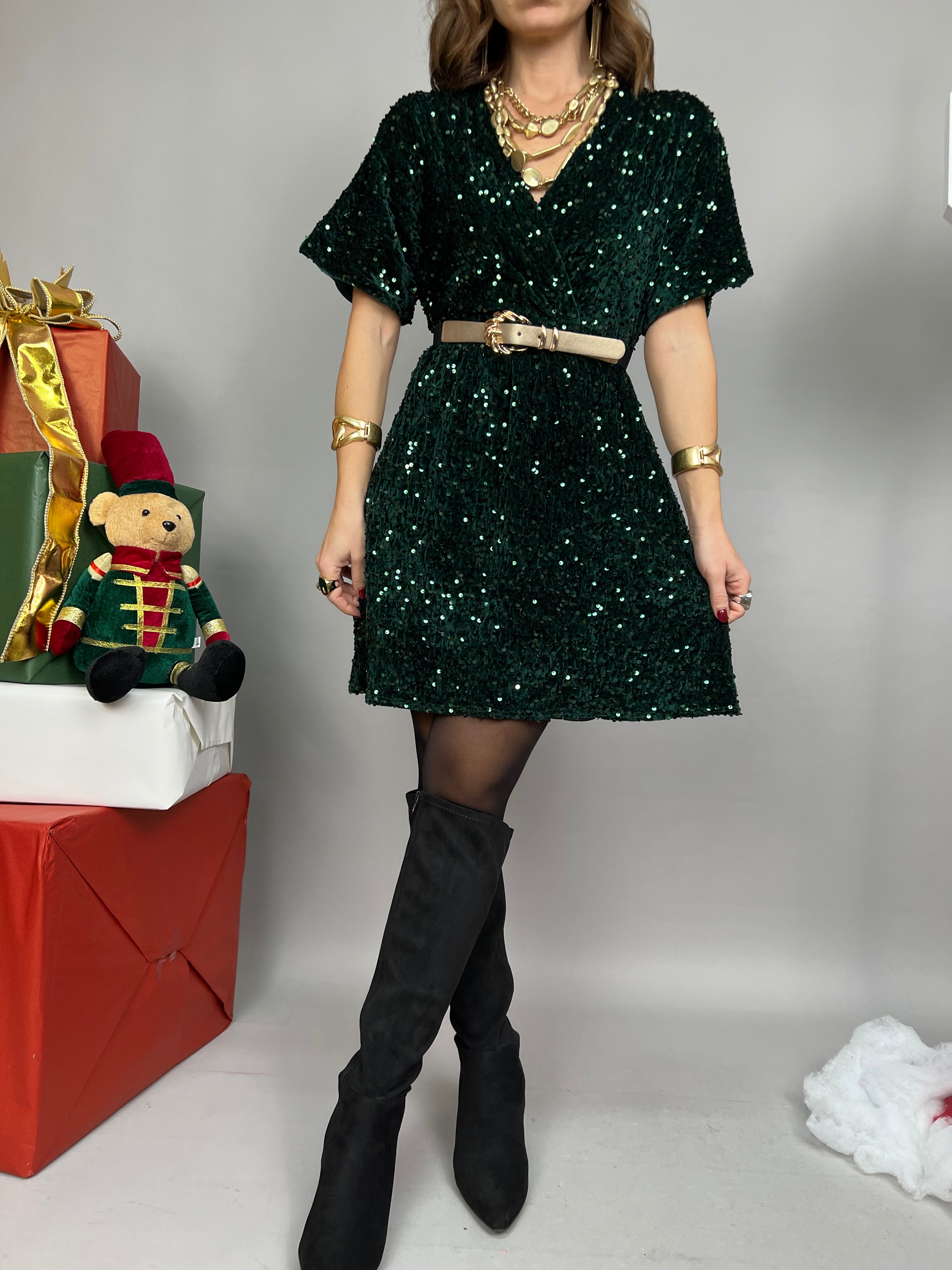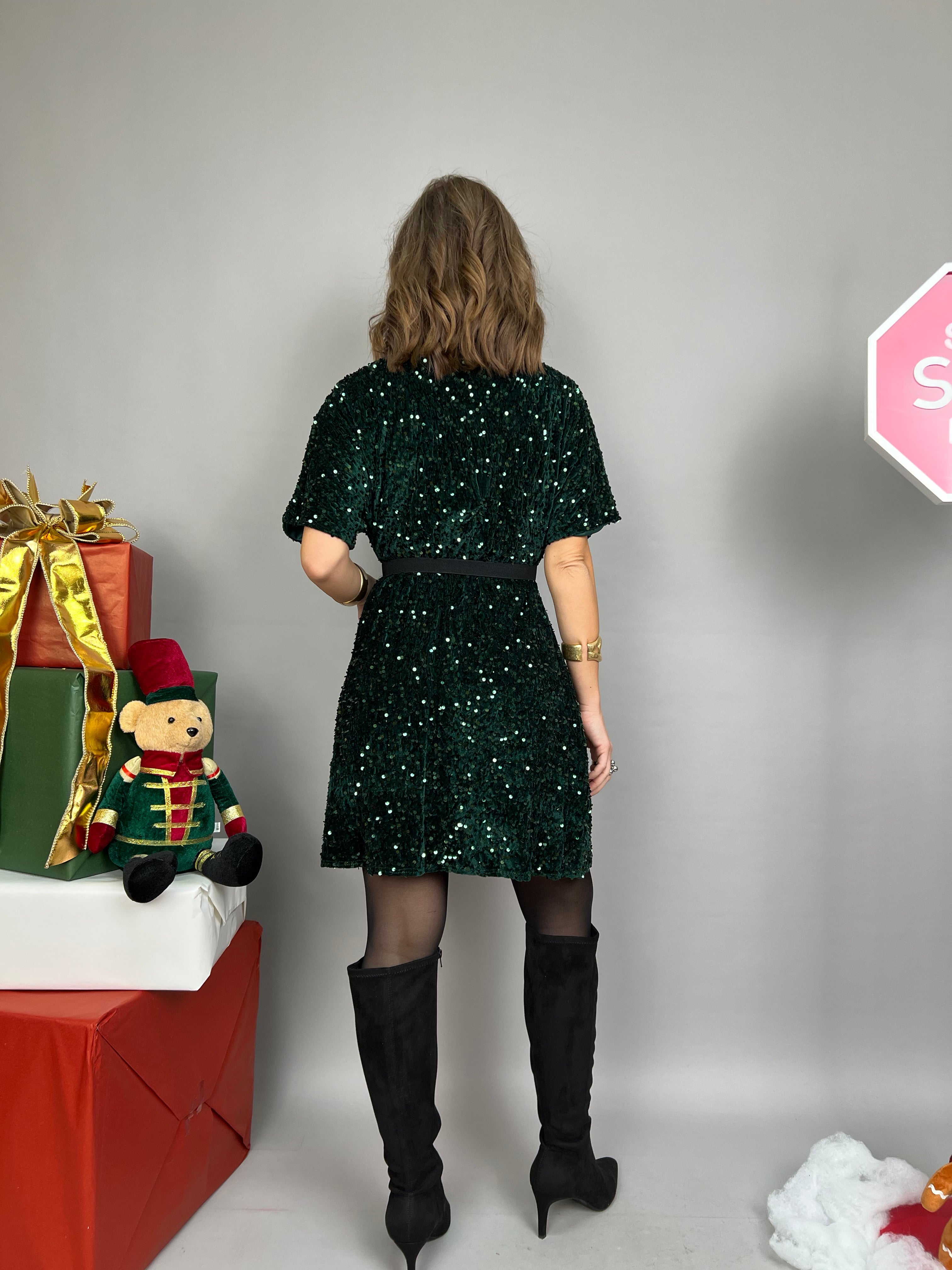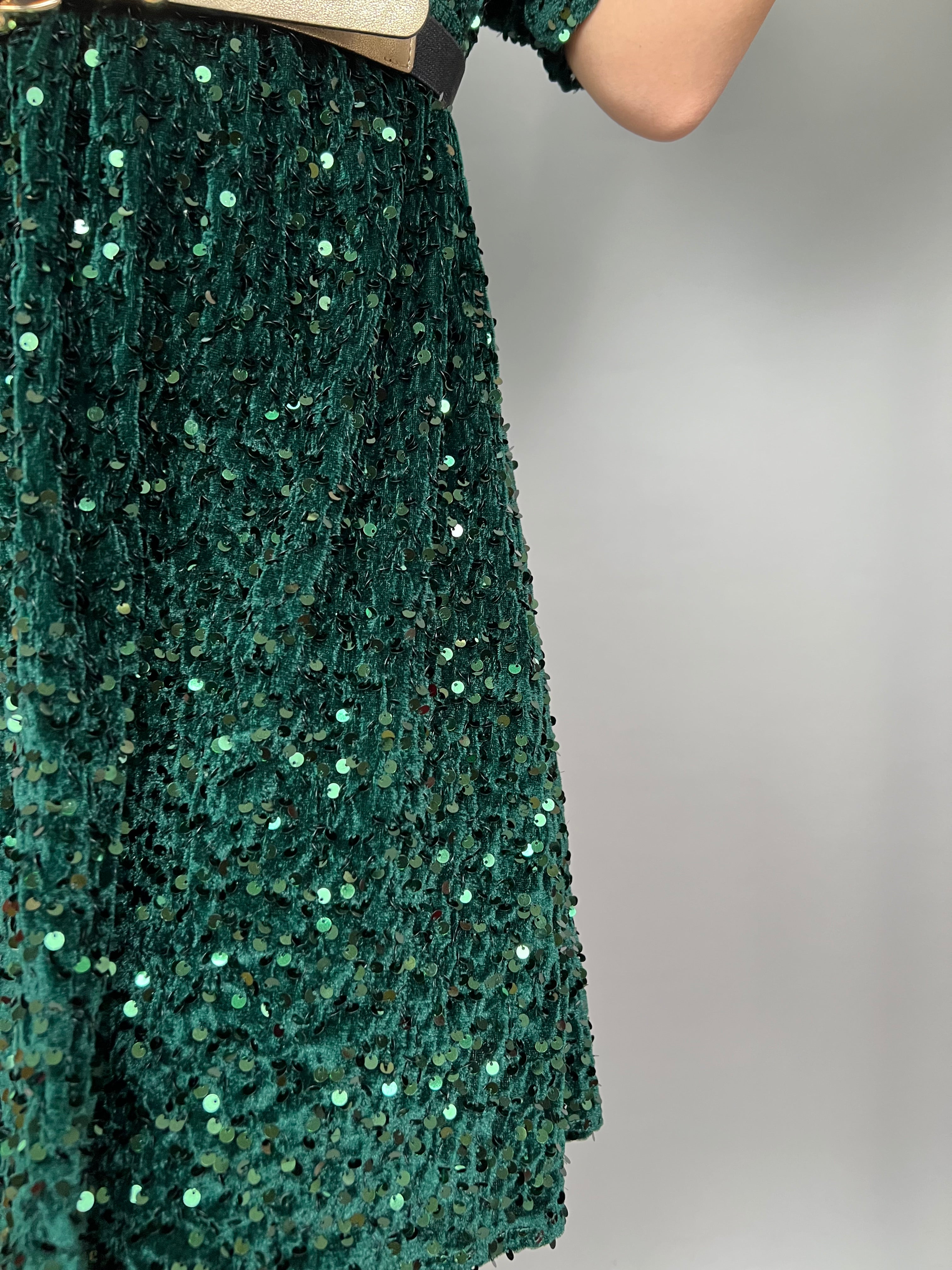 Vestito corto in velluto impreziosito da paillettes tono su tono, scollo a V e manica corta morbida. La linea è leggermente svasata, presenta un elastico in vita e la cintura non è inclusa.