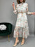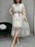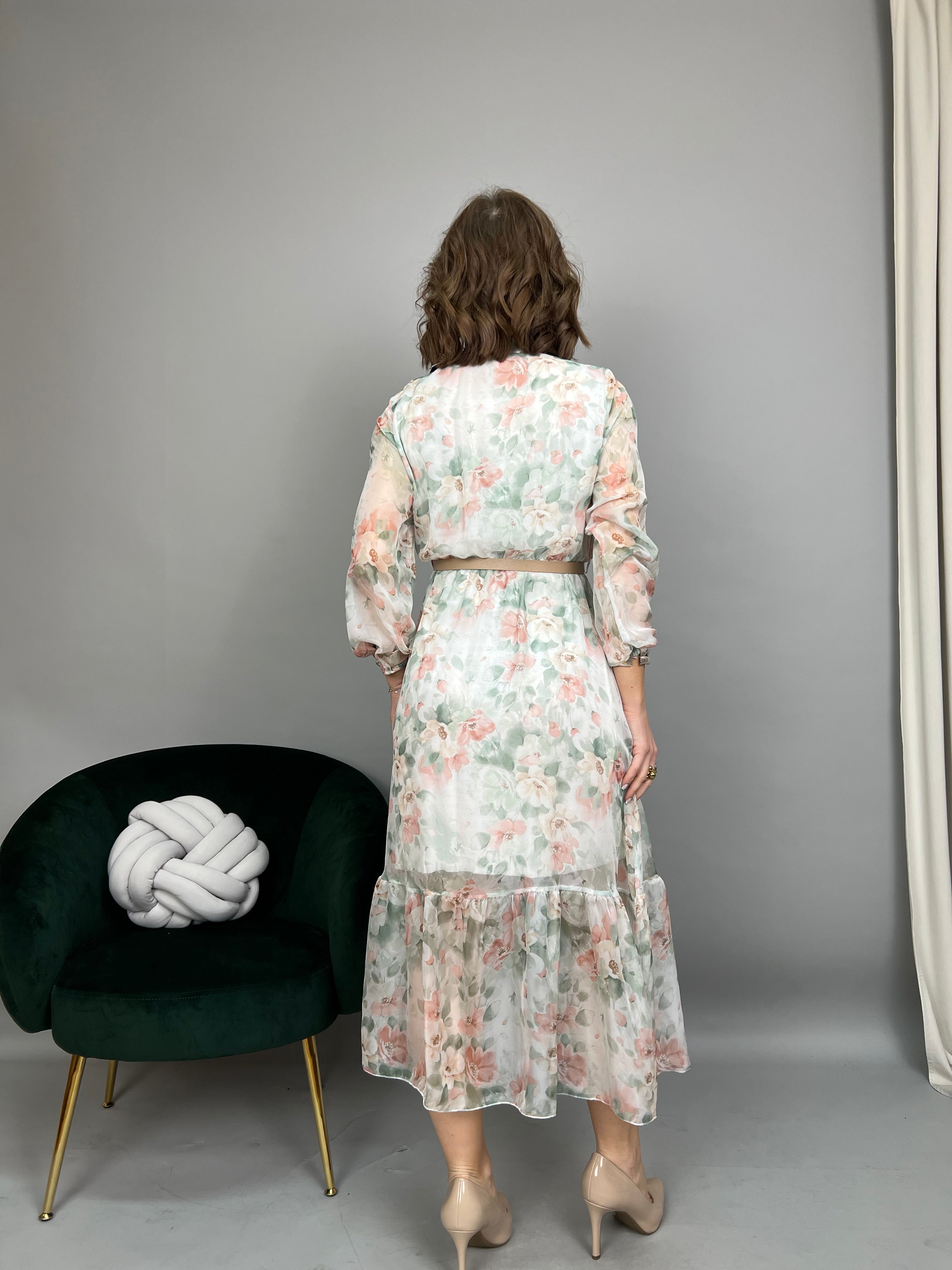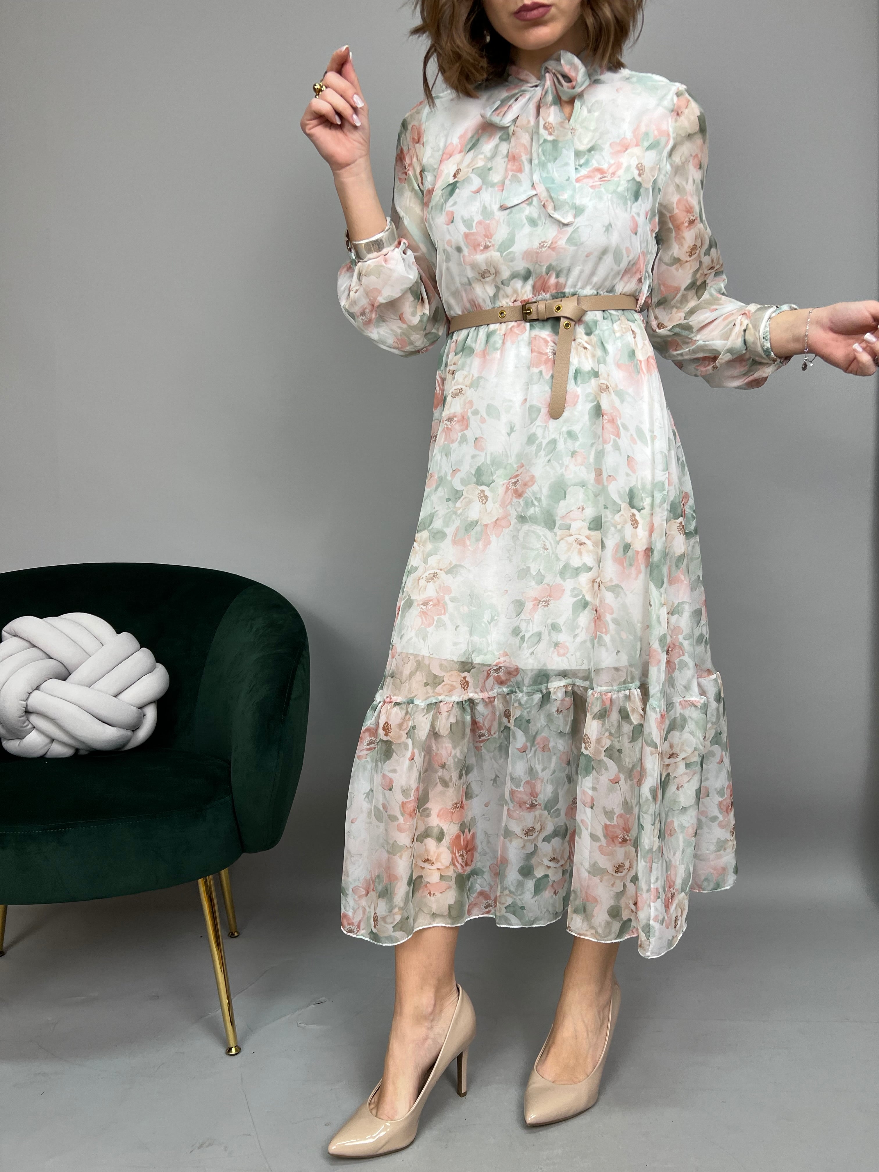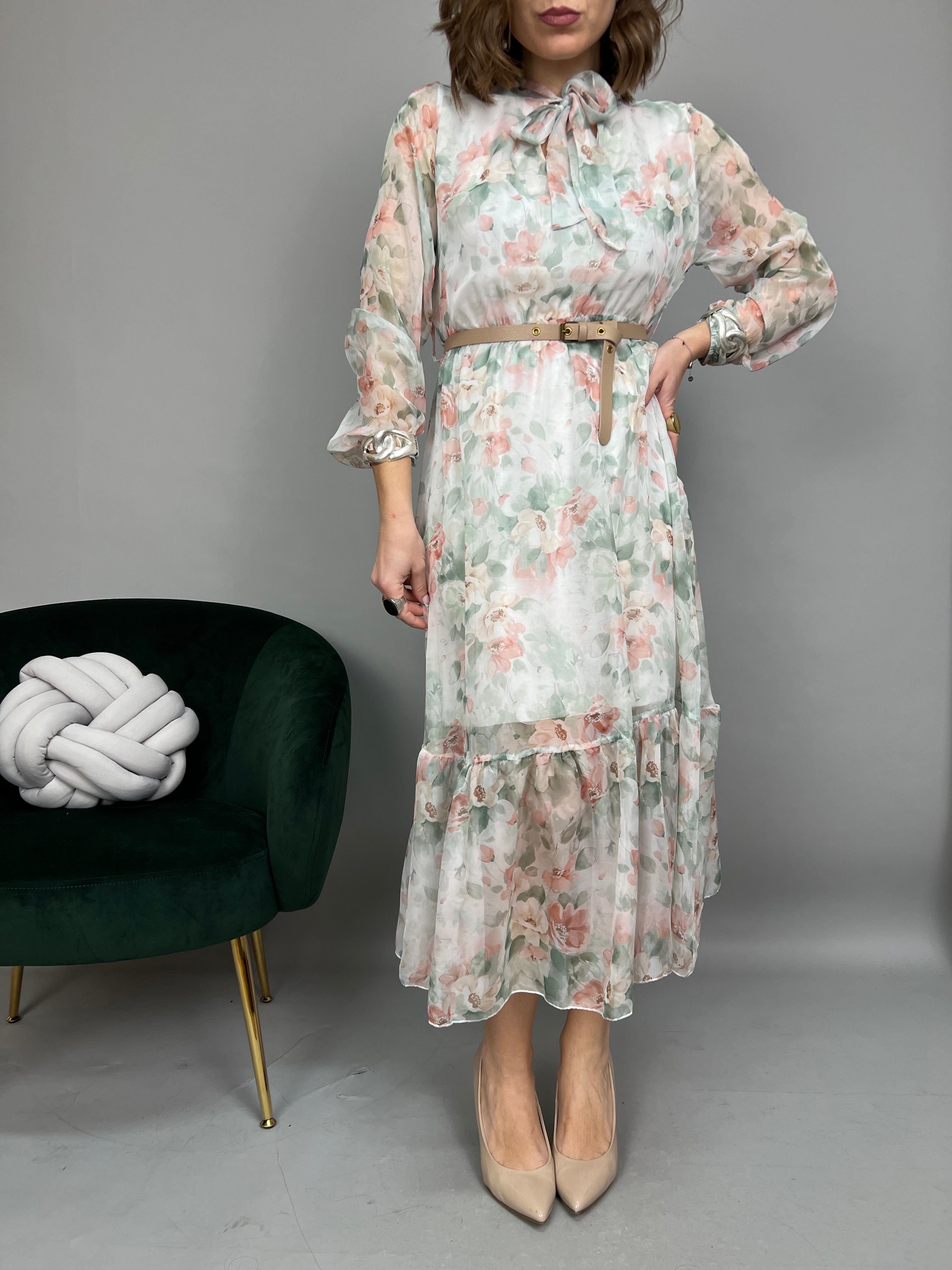 Vestito lungo in tessuto semitrasparente a fantasia floreale. Scollo con apertura frontale e fusciacca da annodare come un fiocco. Maniche a palloncino e polsini elasticizzati. La vita è elasticizzata, con cinturina inclusa. La gonna ha una balza sulla lunghezza. Presenta una fodera interna e sottogonna.