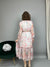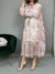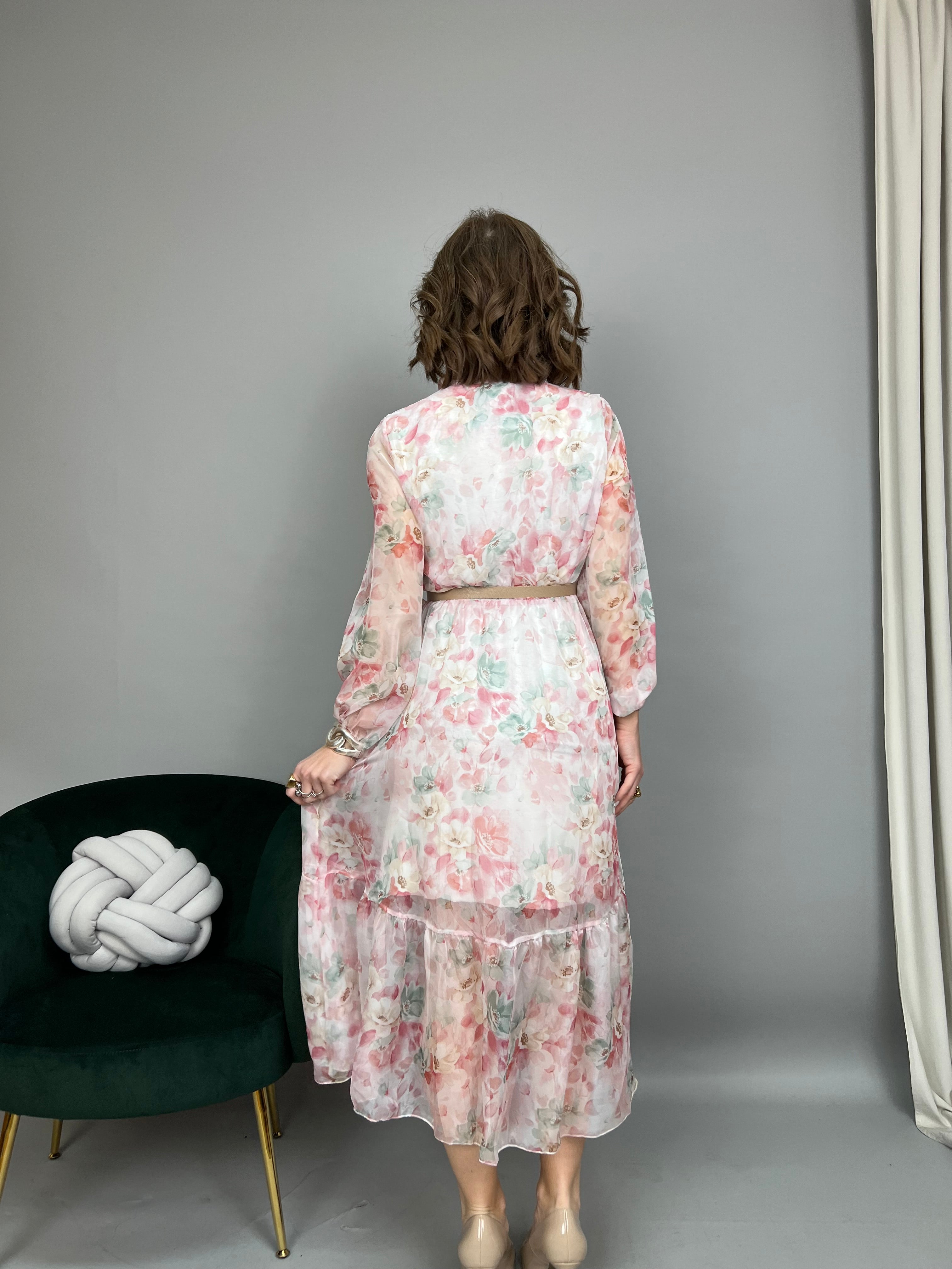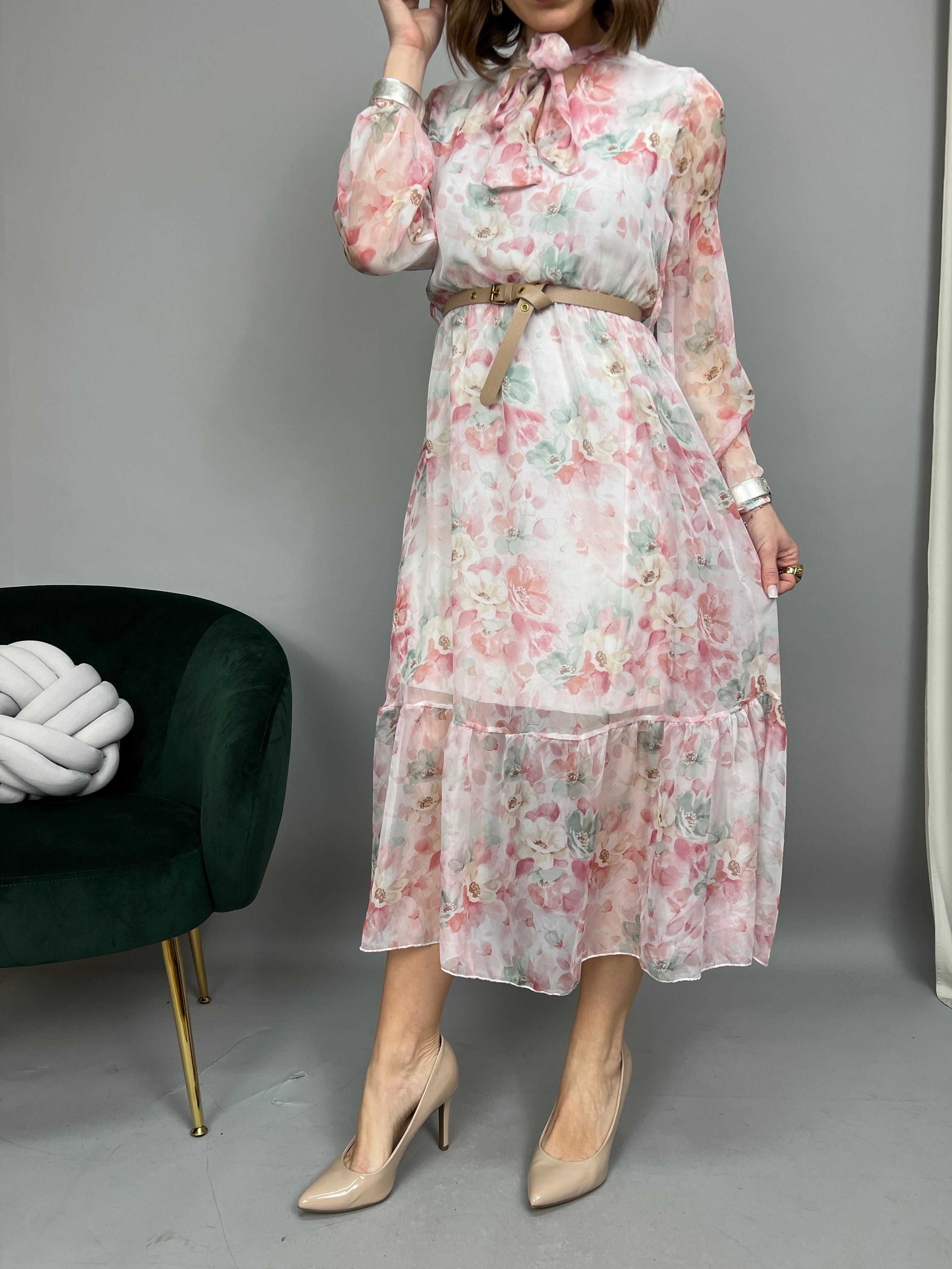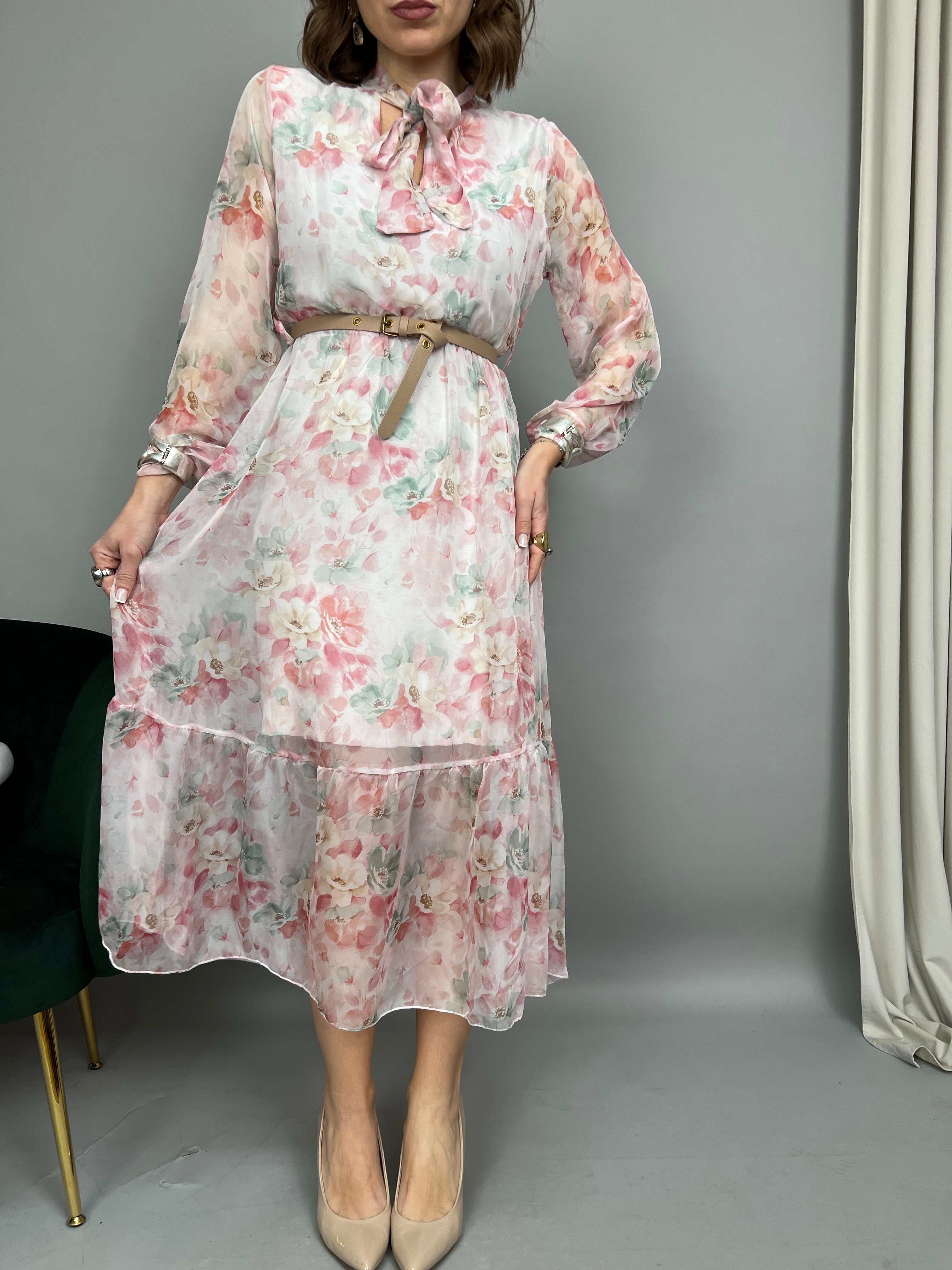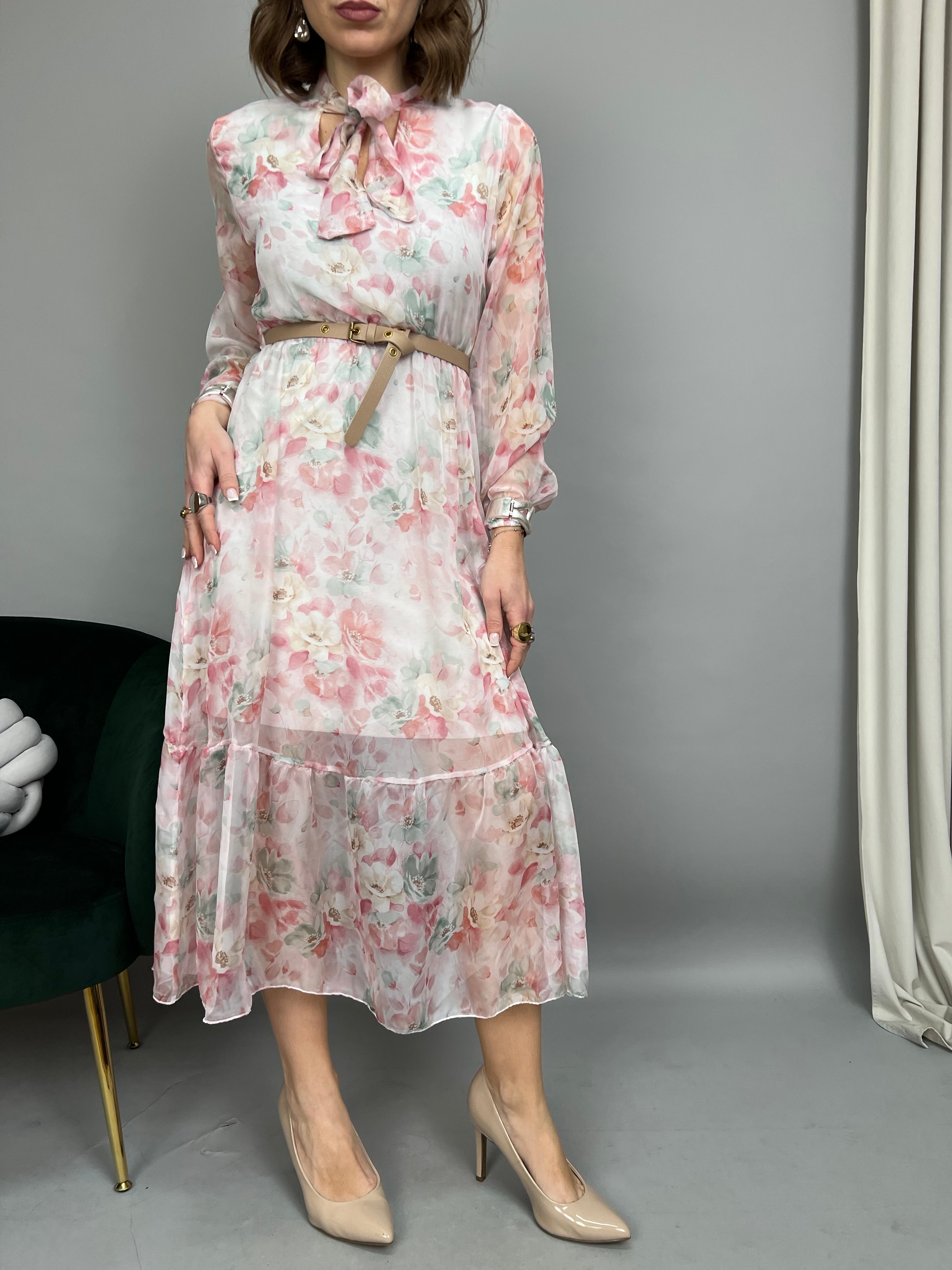 Vestito lungo in tessuto semitrasparente a fantasia floreale. Scollo con apertura frontale e fusciacca da annodare come un fiocco. Maniche a palloncino e polsini elasticizzati. La vita è elasticizzata, con cinturina inclusa. La gonna ha una balza sulla lunghezza. Presenta una fodera interna e sottogonna.