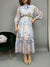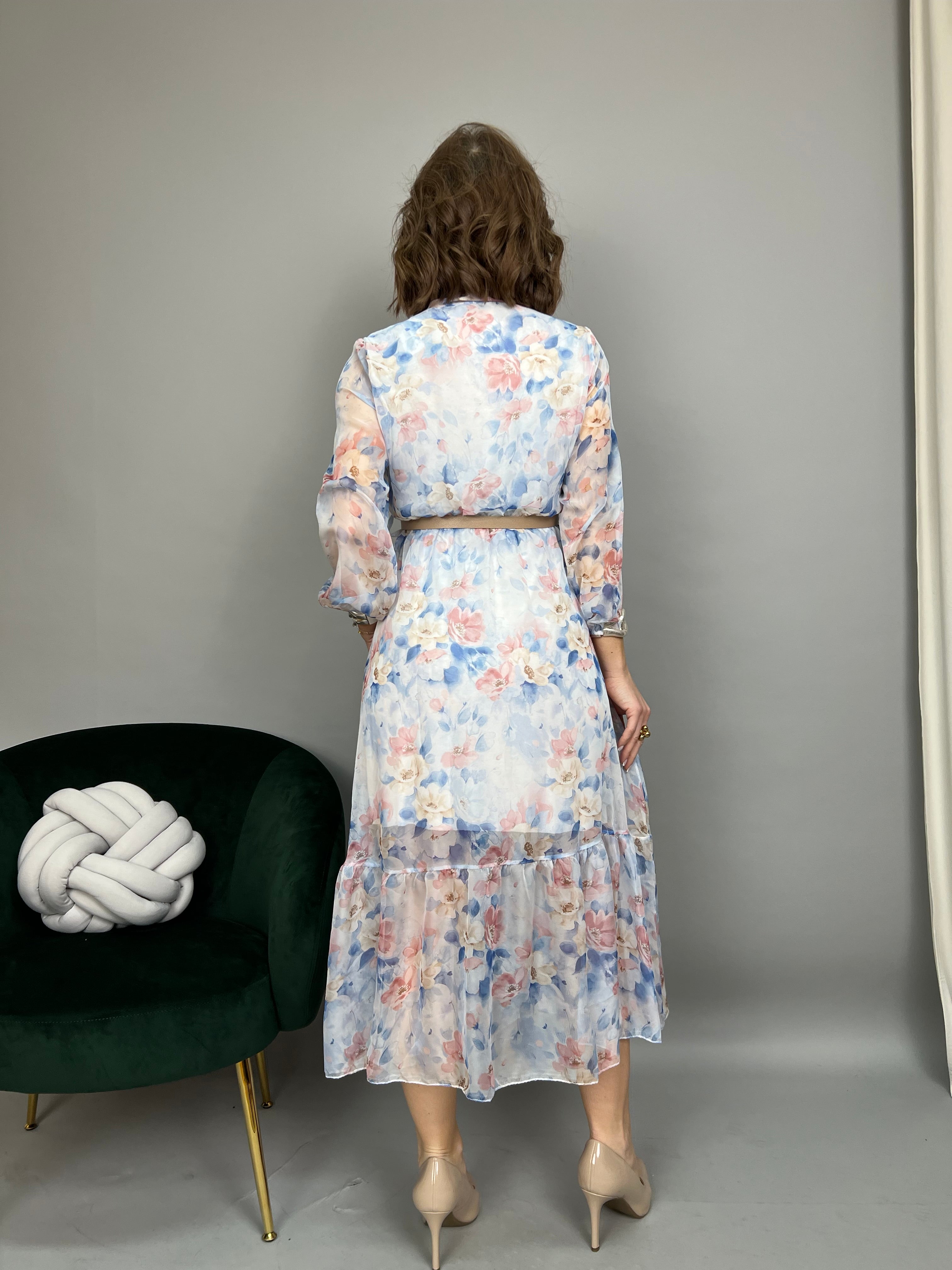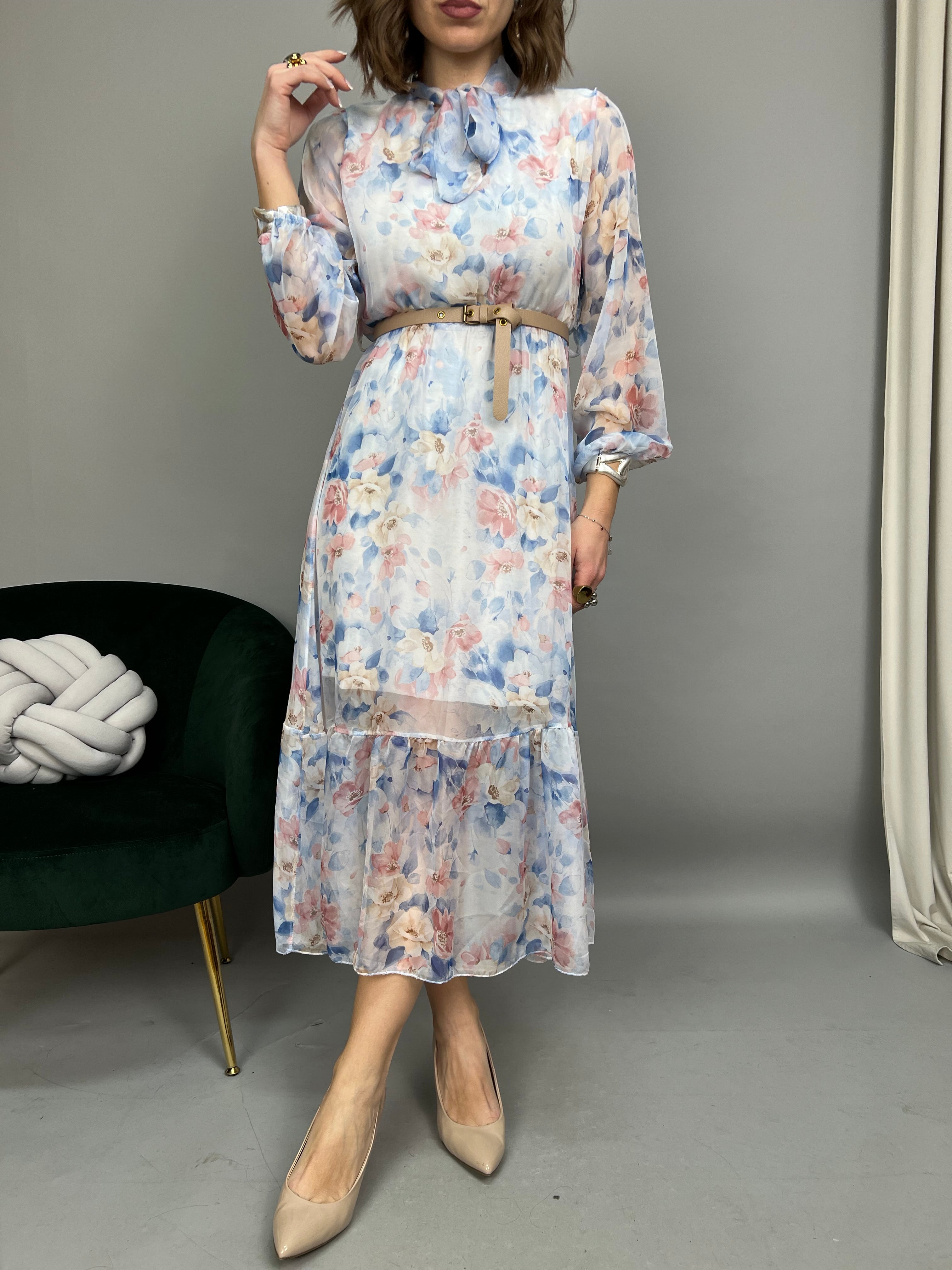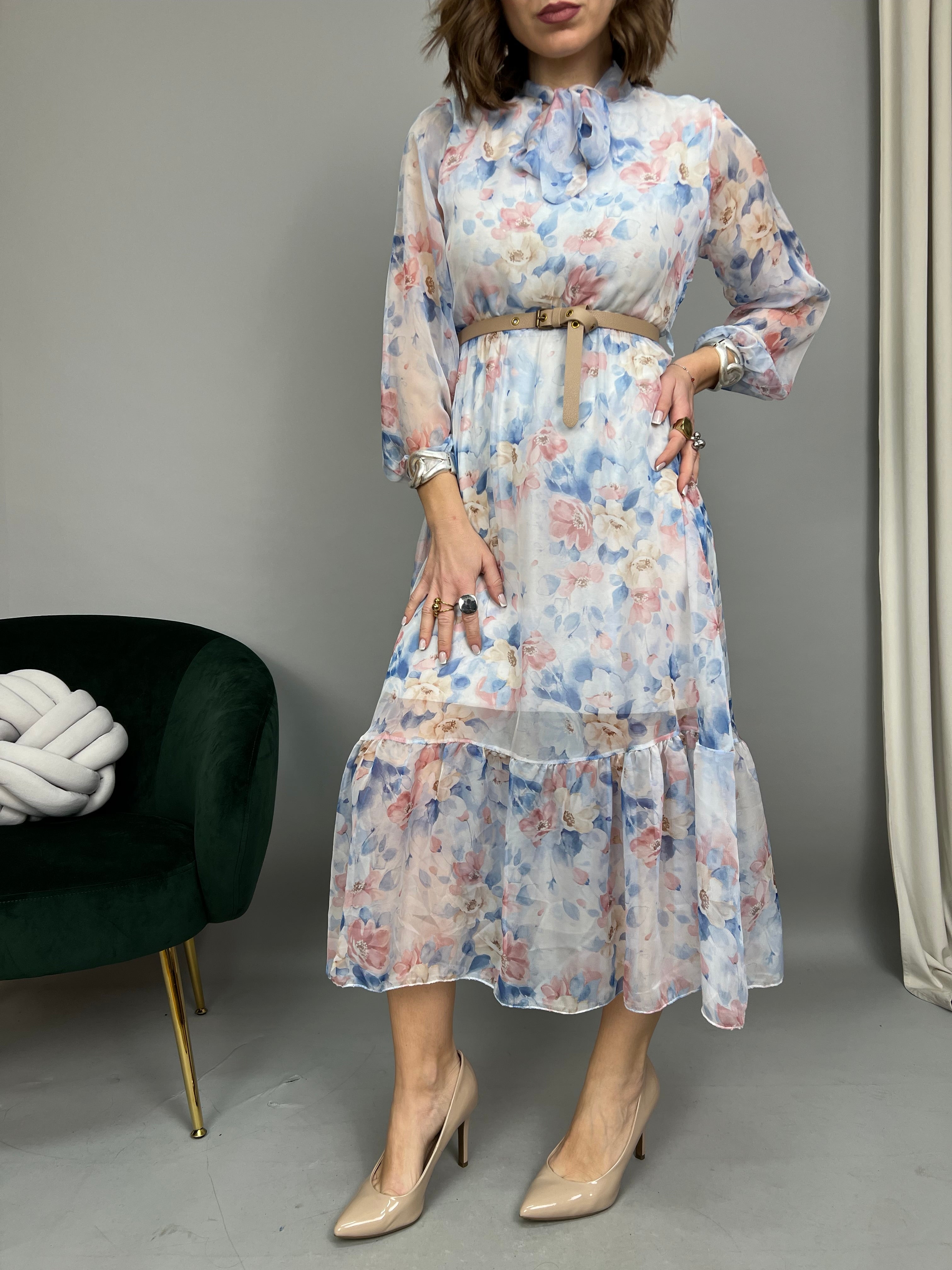 Vestito lungo in tessuto semitrasparente a fantasia floreale. Scollo con apertura frontale e fusciacca da annodare come un fiocco. Maniche a palloncino e polsini elasticizzati. La vita è elasticizzata, con cinturina inclusa. La gonna ha una balza sulla lunghezza. Presenta una fodera interna e sottogonna.